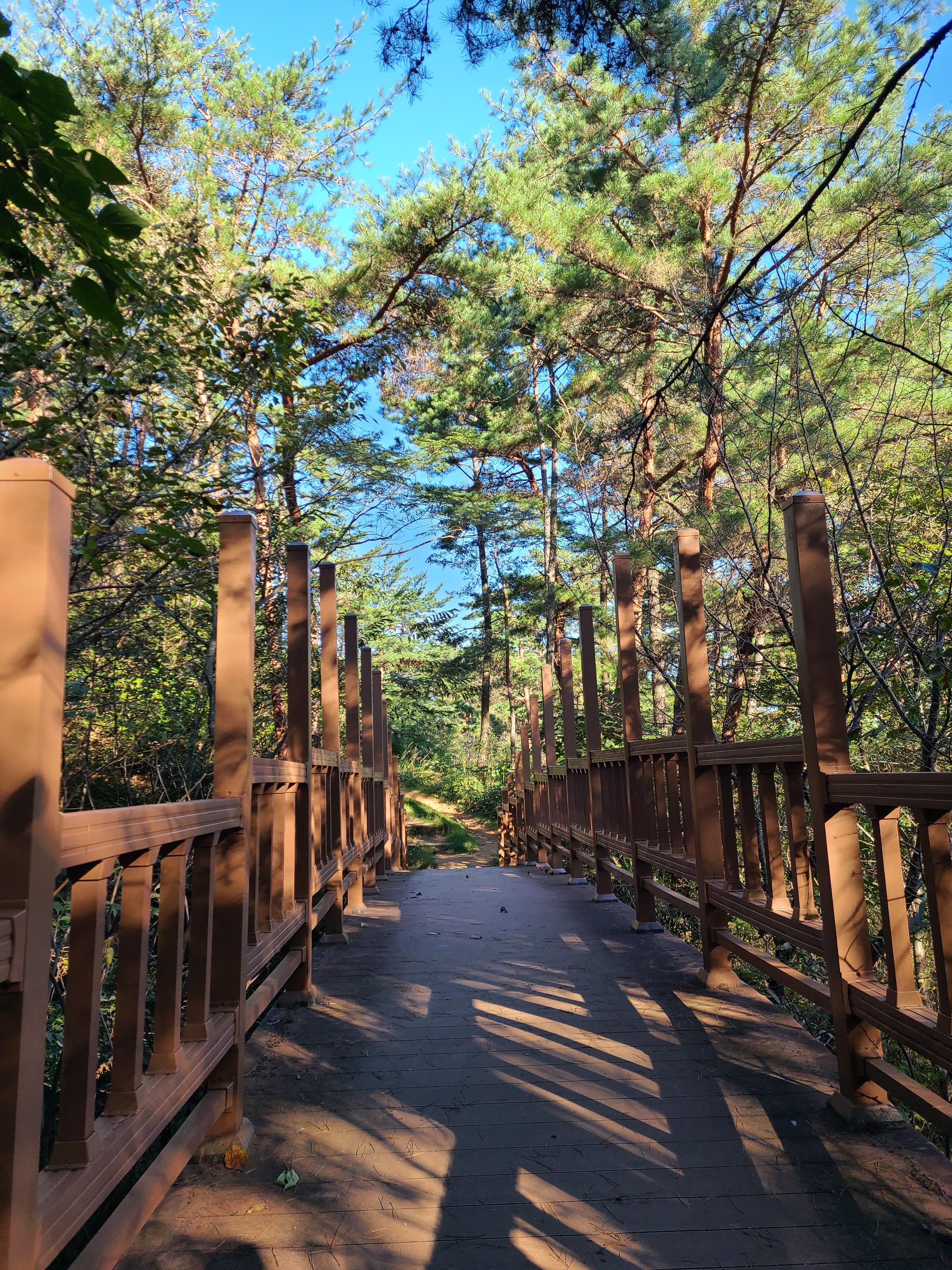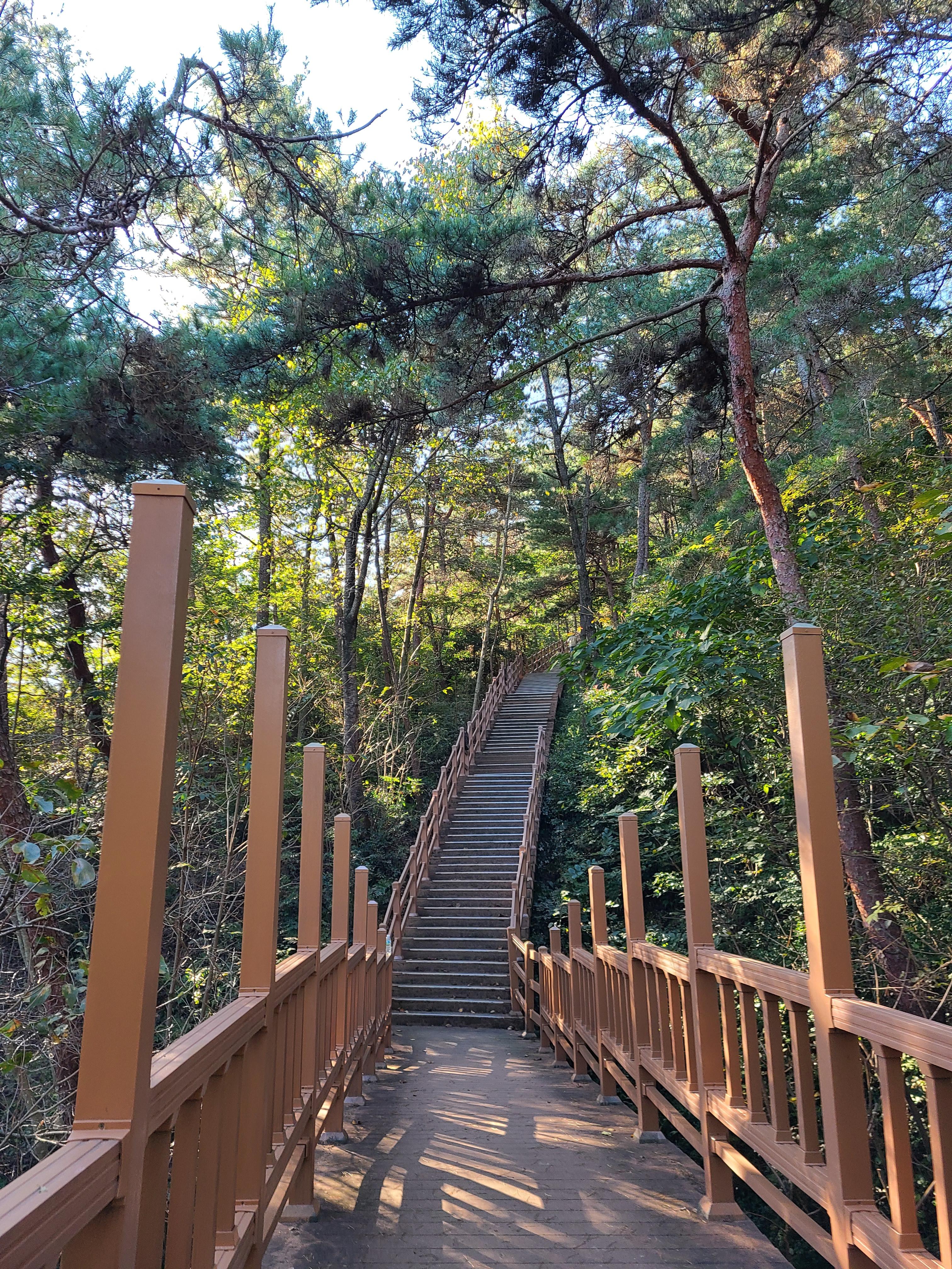 깨금 바위 길을 나무 계단으로 이루어져 있다.