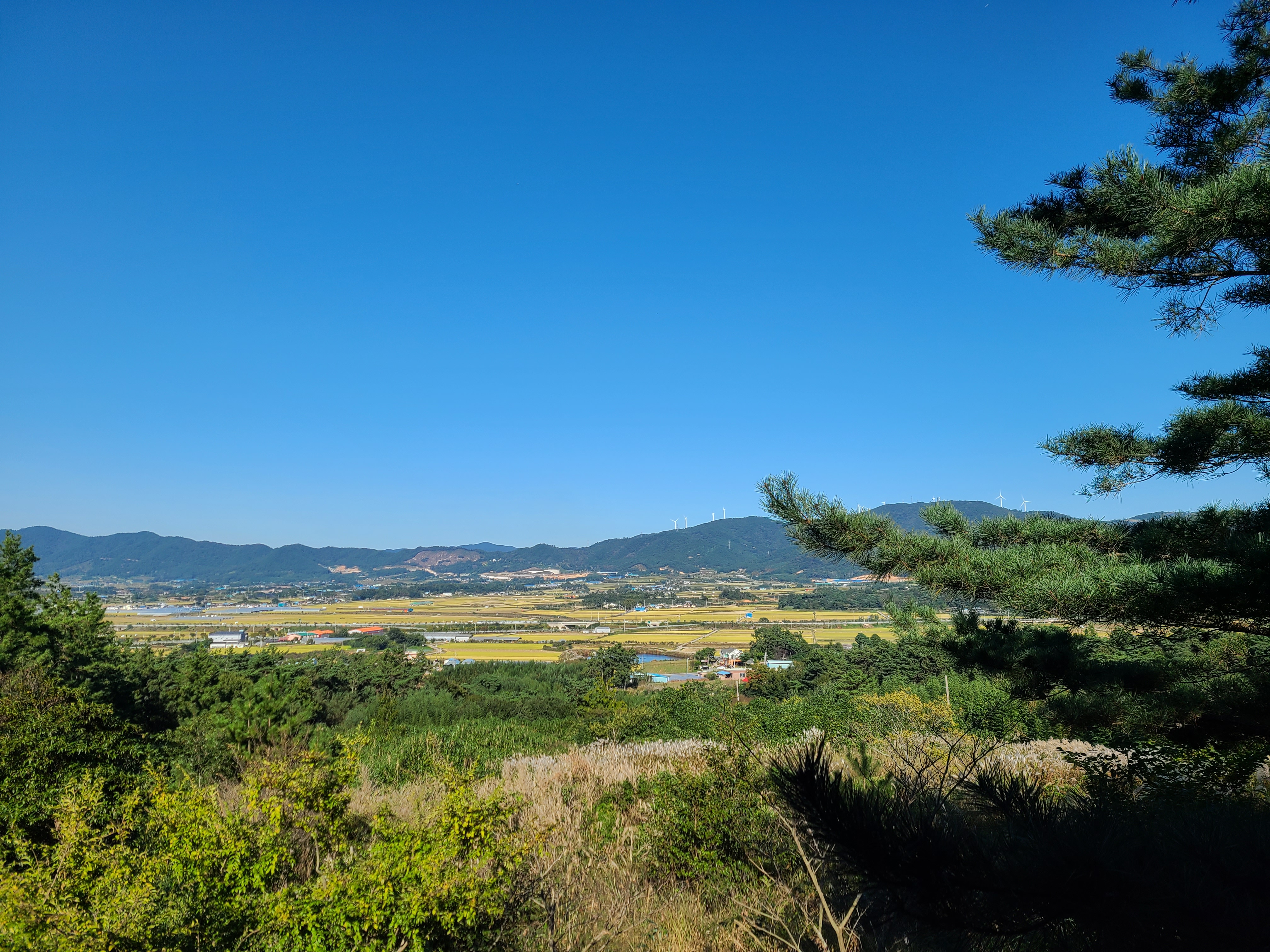 무화정에서 영암 들녘과 건너편 저 멀리에 있는 산 위에 풍력발전기의 모습도 보인다.