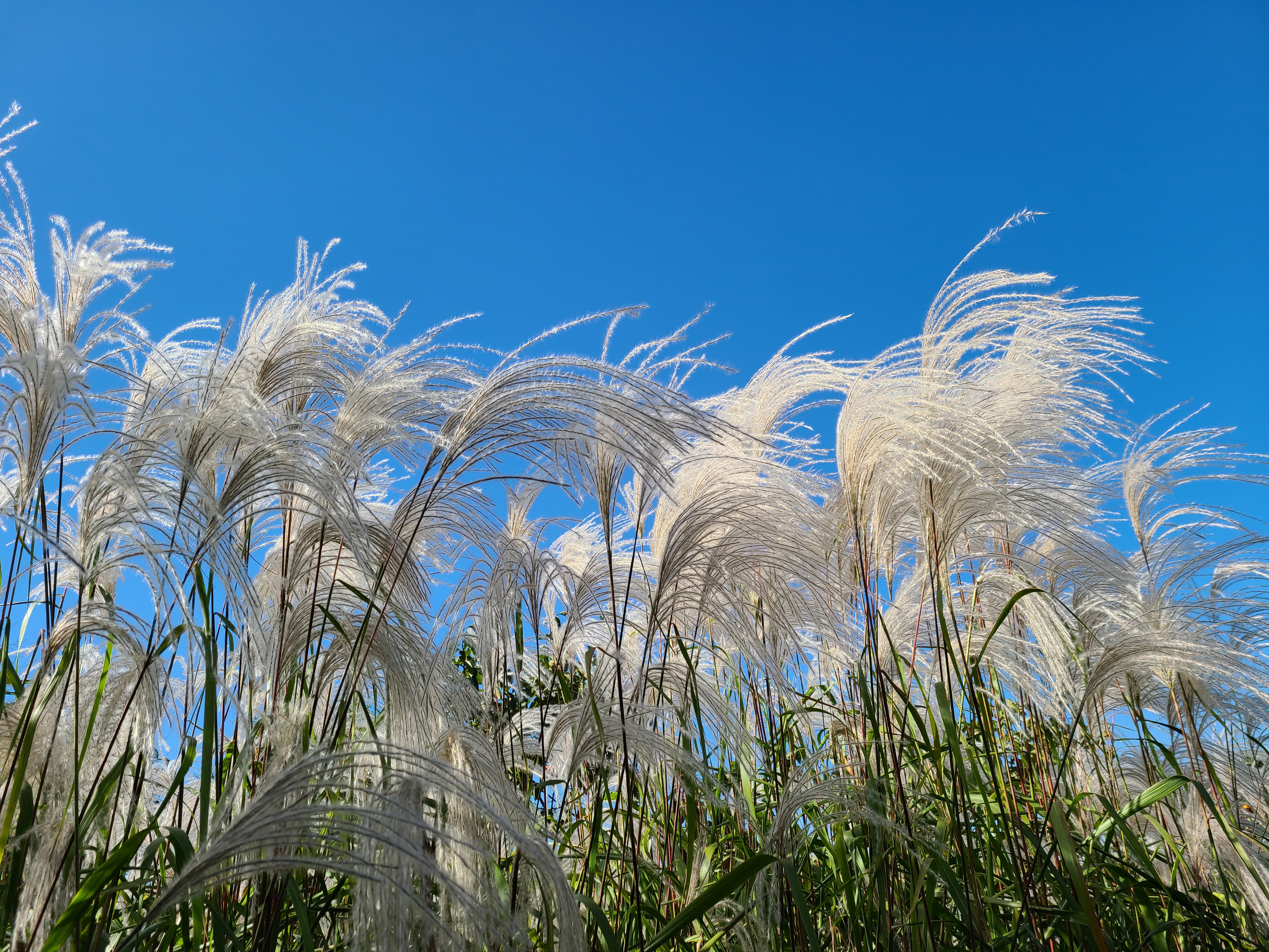 대나무 숲터널이 끝나면 오른쪽으로 파란 하늘 아래 은빛 억새가 보인다.