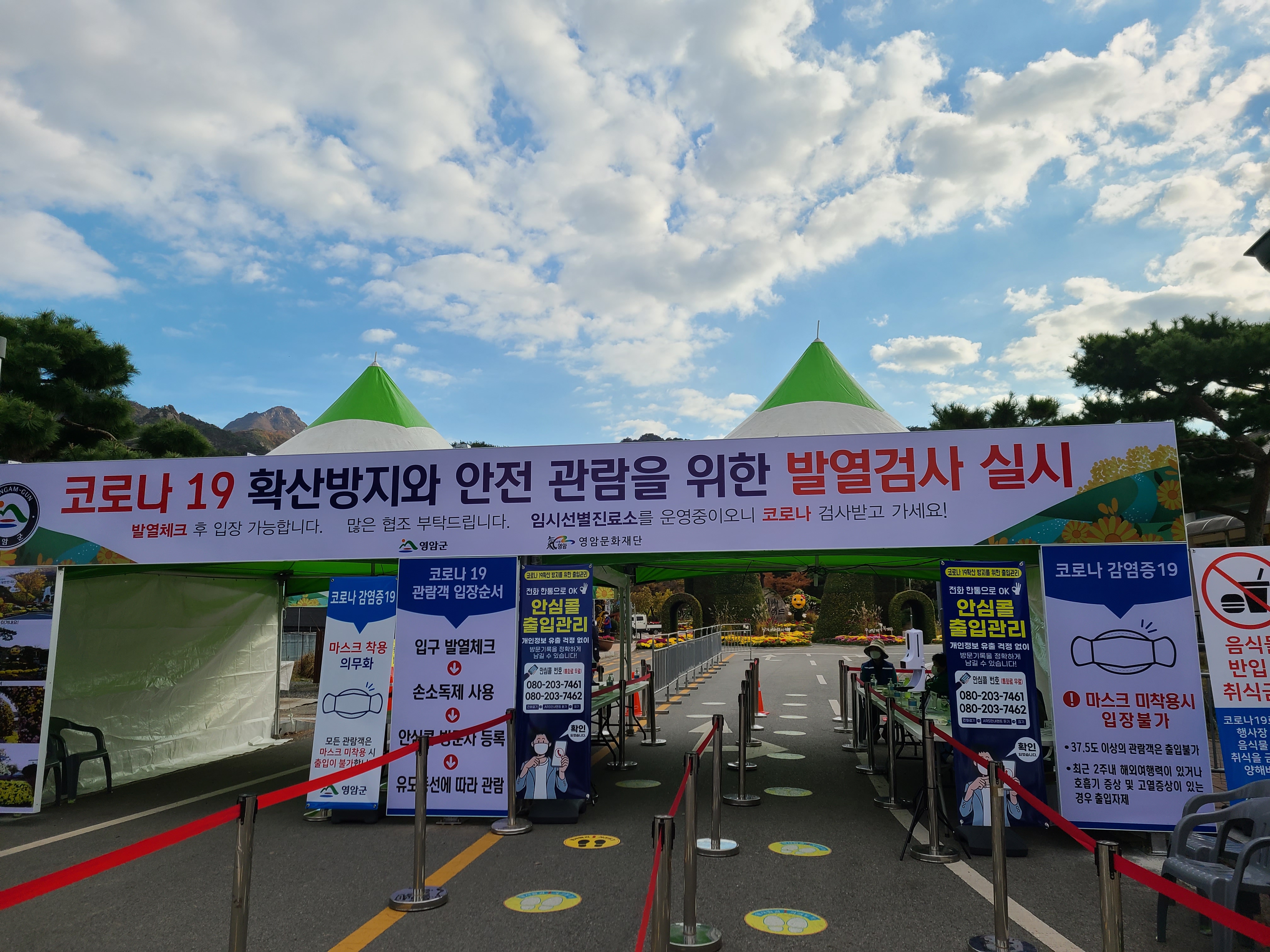 월출산 국회 전시회 주차장에는 코로나 19 임시 검사소가 있었고 국화 전시회장인 기찬 랜드 입구에는 코로나19 확산 방지와 안전 관람을 위한 발열검사를 실시하고 있었다. 안심콜을 한 후 발열검사까지 통과하면 스티커를 부착해 주었다.