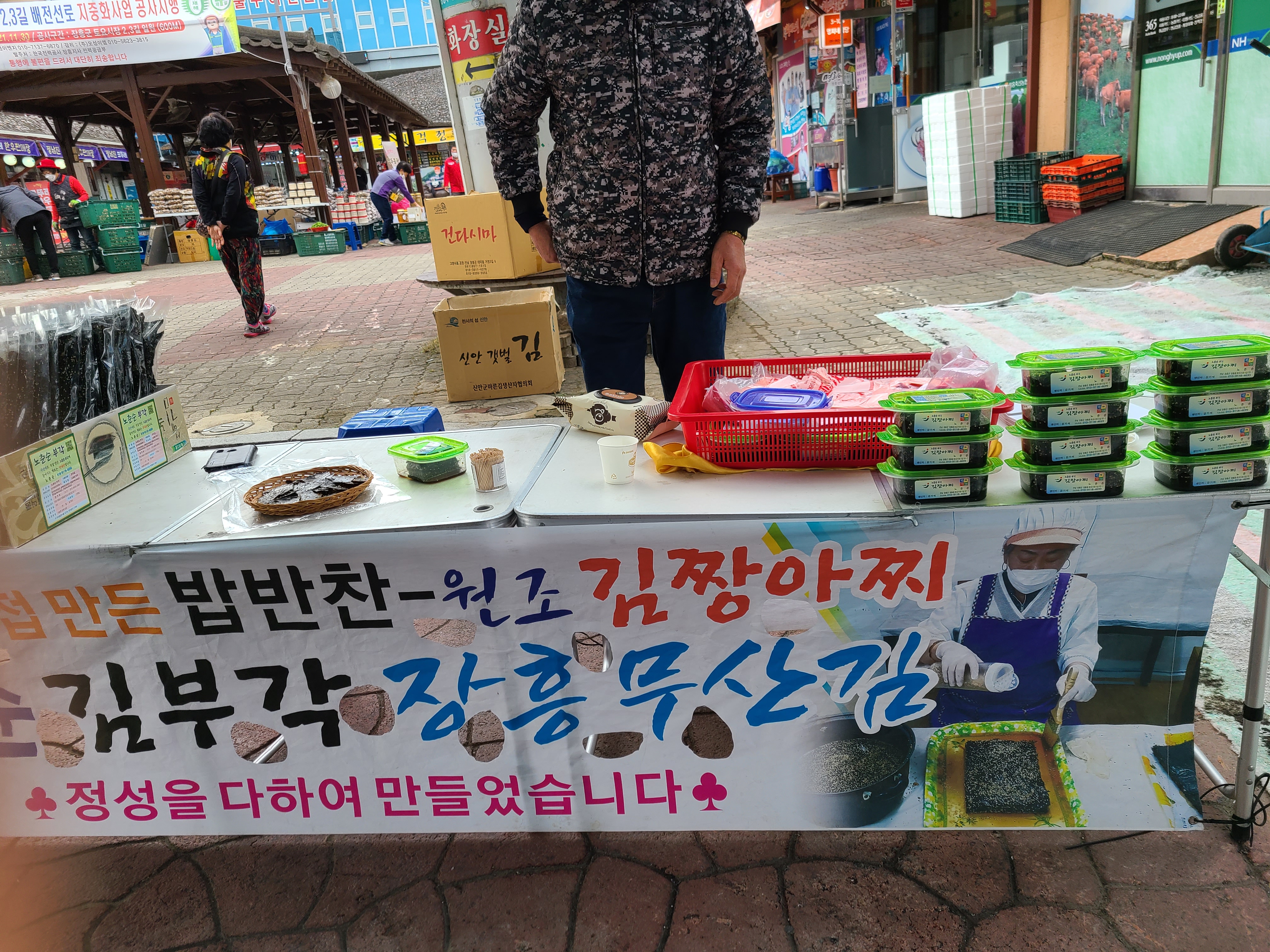 장흥은 무산김이 유명한데 김부각과 함께 김장아찌를 판매하고 있었다. 시식을 해보니 김부각은 좀 딱딱해서 내 입맛에는 별로였는데 김장아찌가 짭조름하니 맛이 있어 선물할 겸 5개나 구입을 했다.