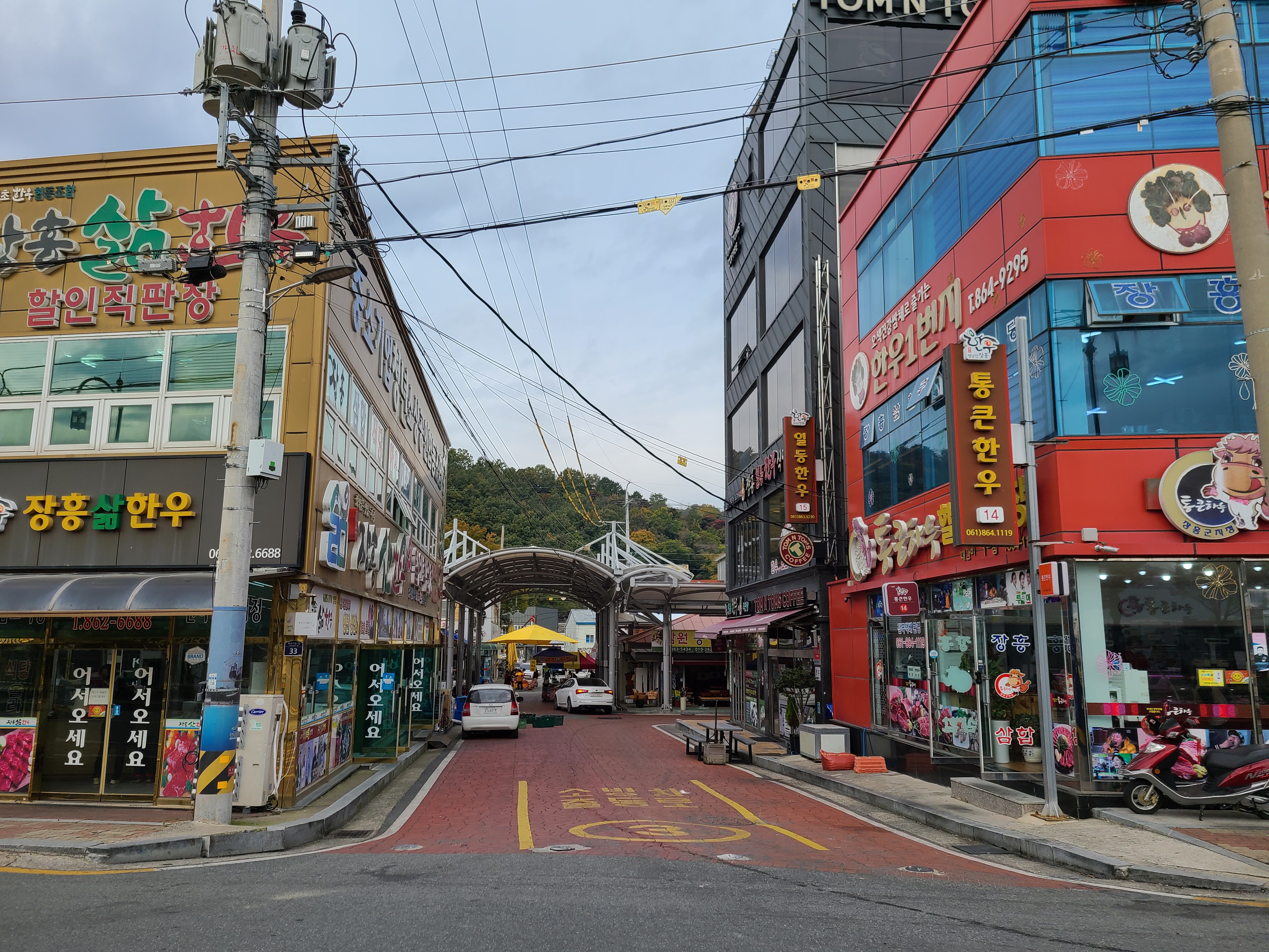 정남진 토요시장 공연장 맞은편에 지난번에 삼합을 구워 먹었던 식당이 보인다.