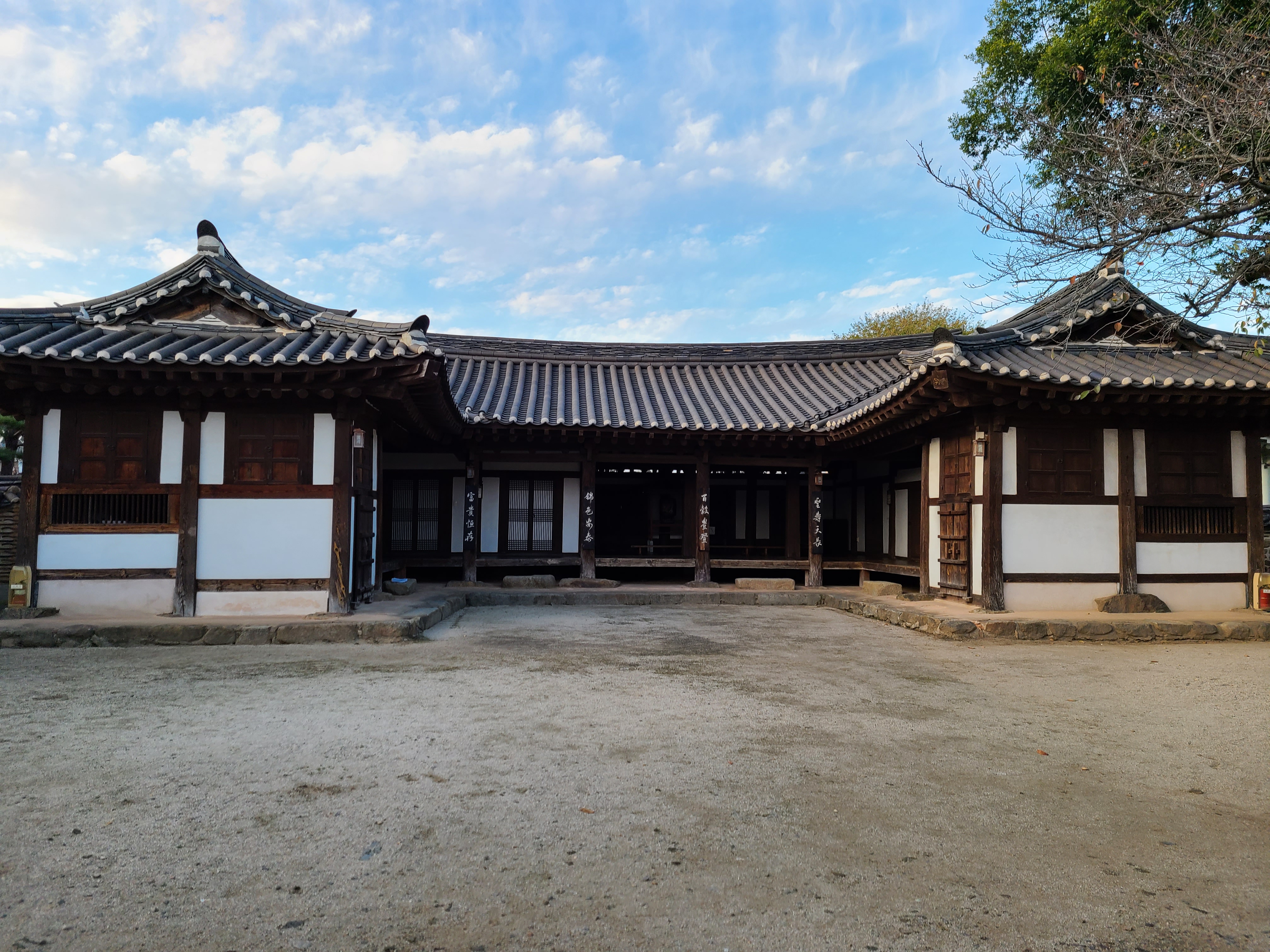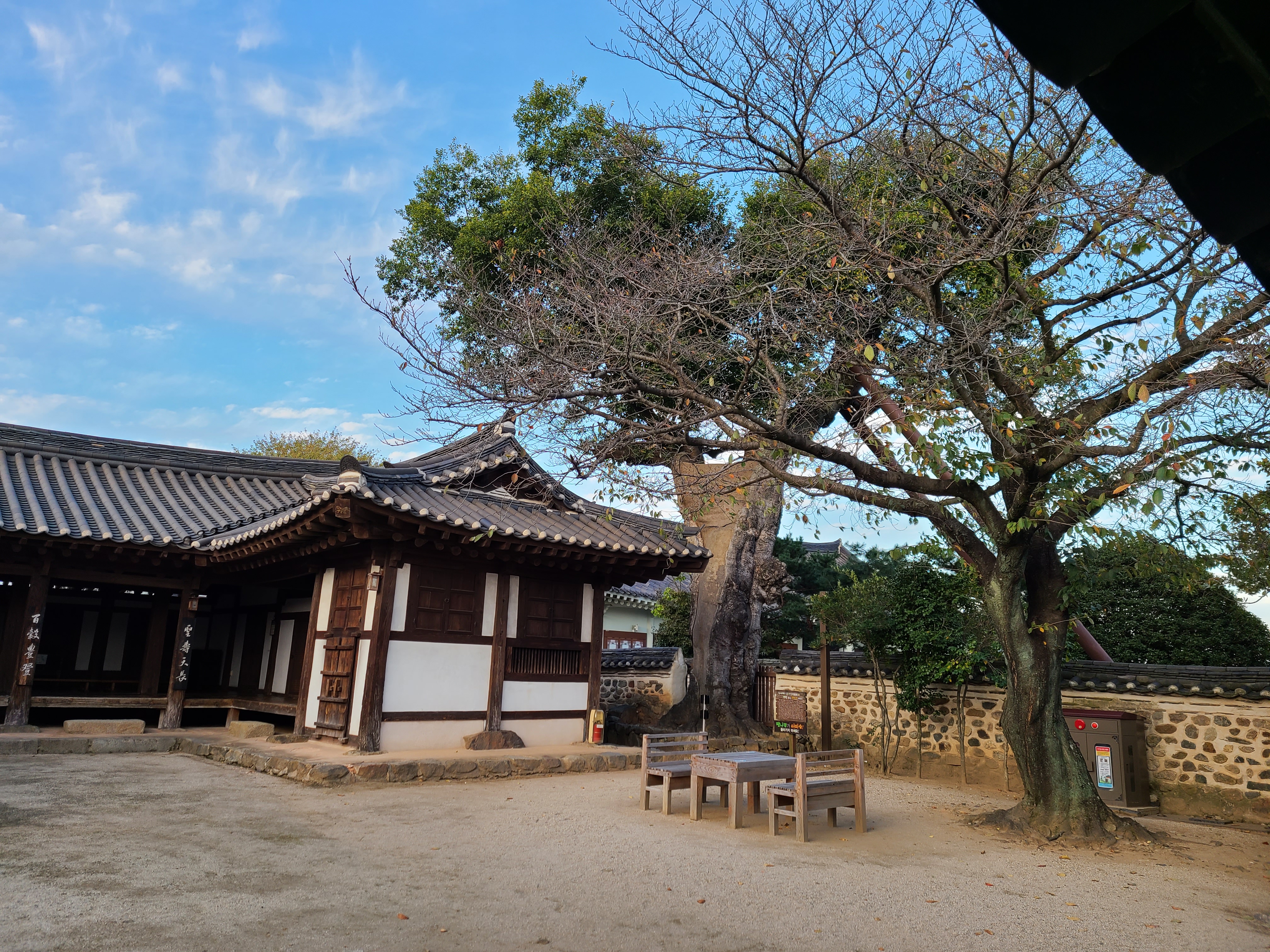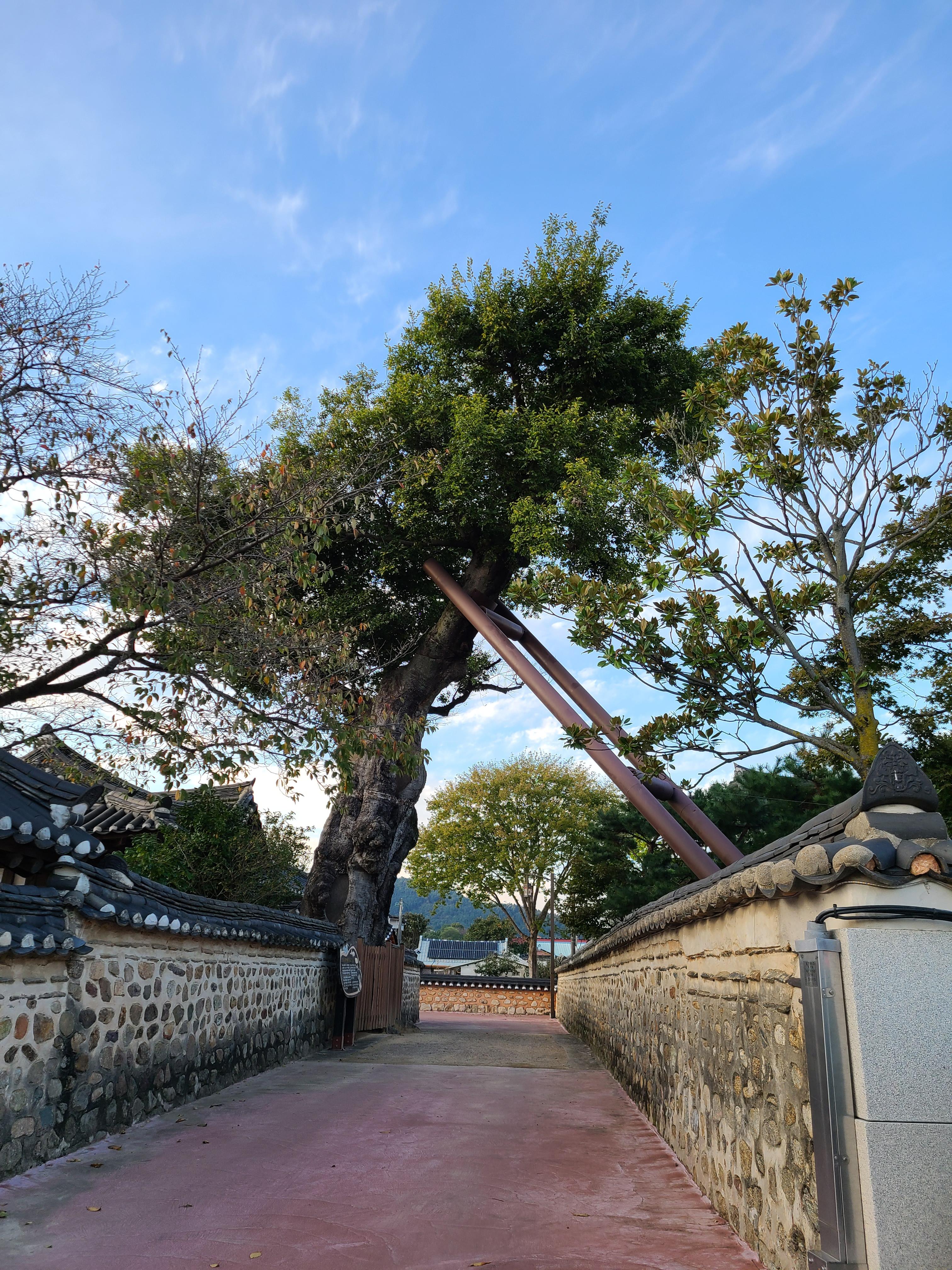 앞마당 오른쪽 담장 곁에는 벼락 맞는 팽나무가 살아있었다. 담장 밖에 나무를 지지하는 지지대가 사다리 모양으로 지지하고 있다.