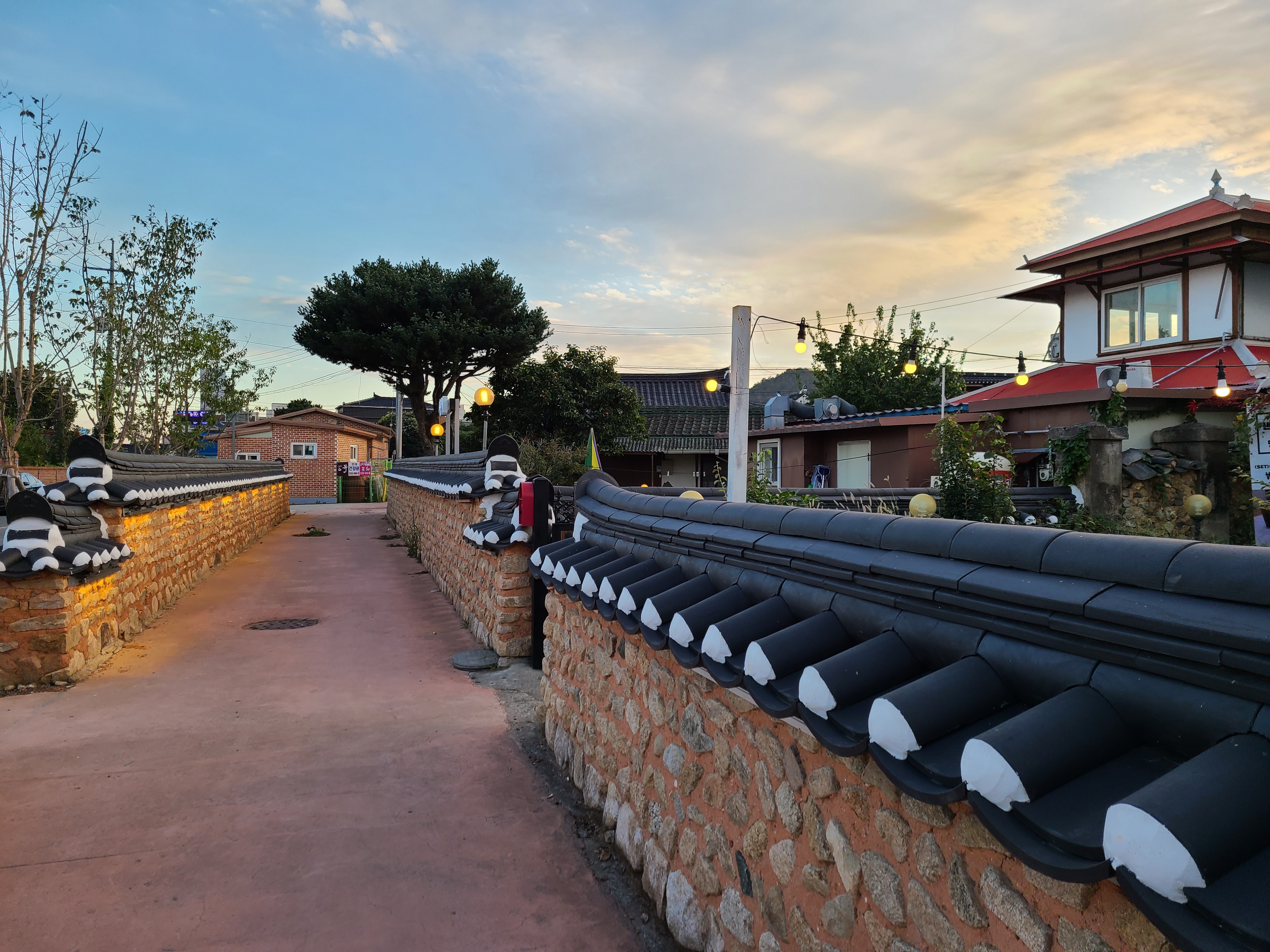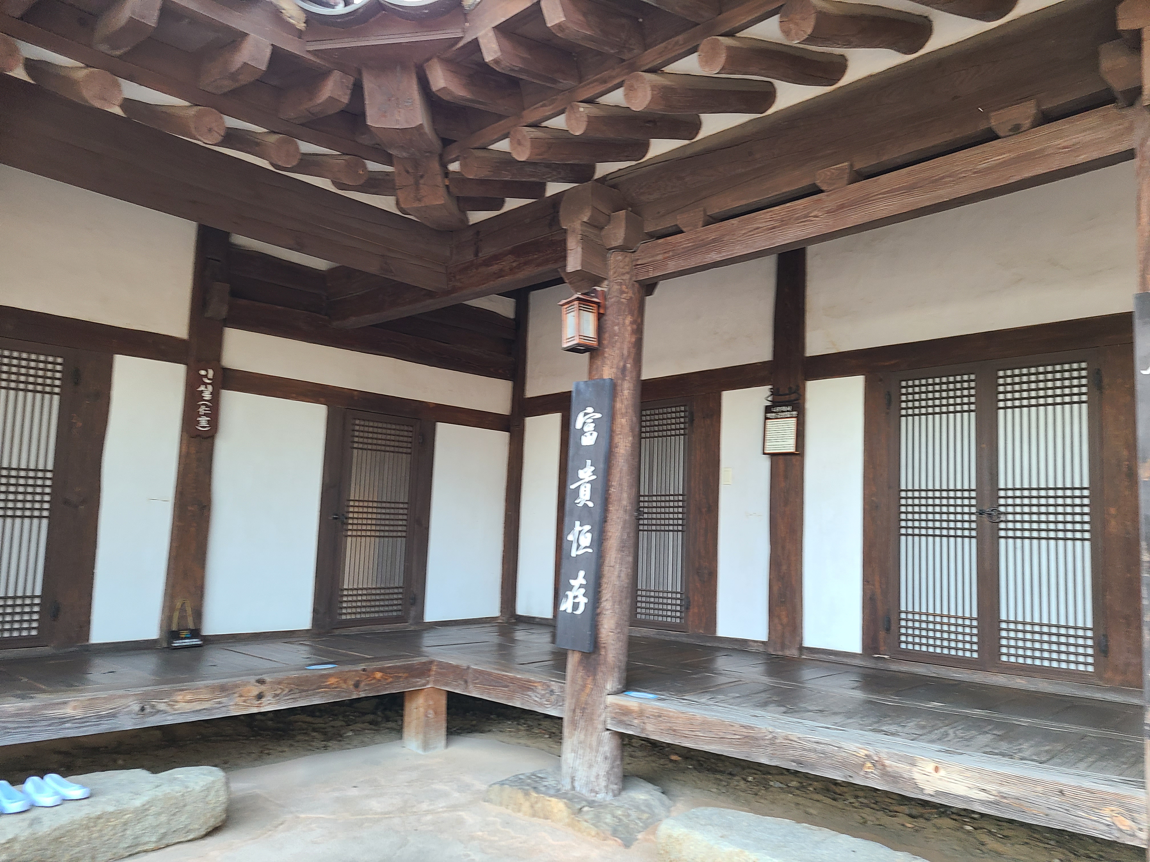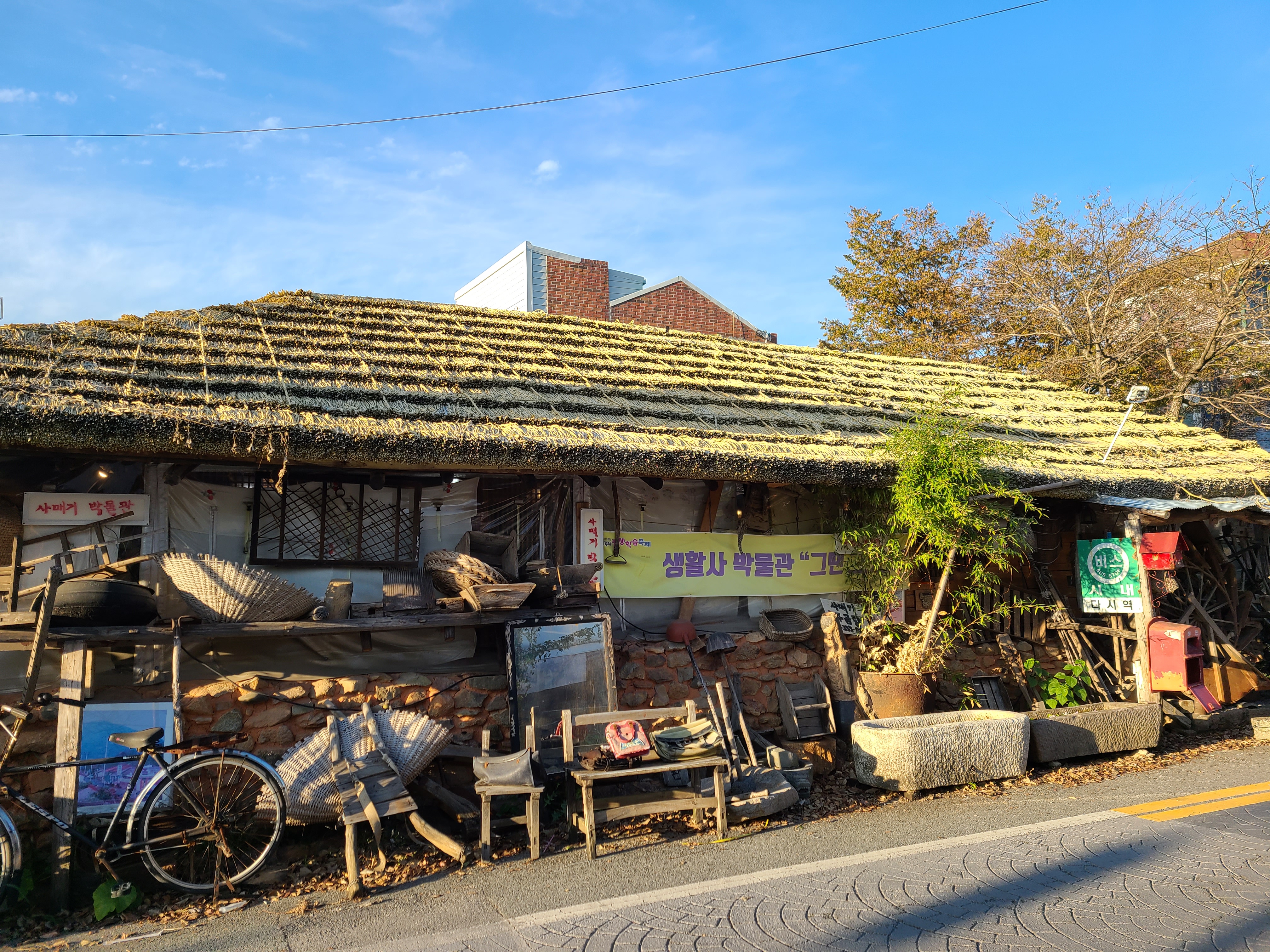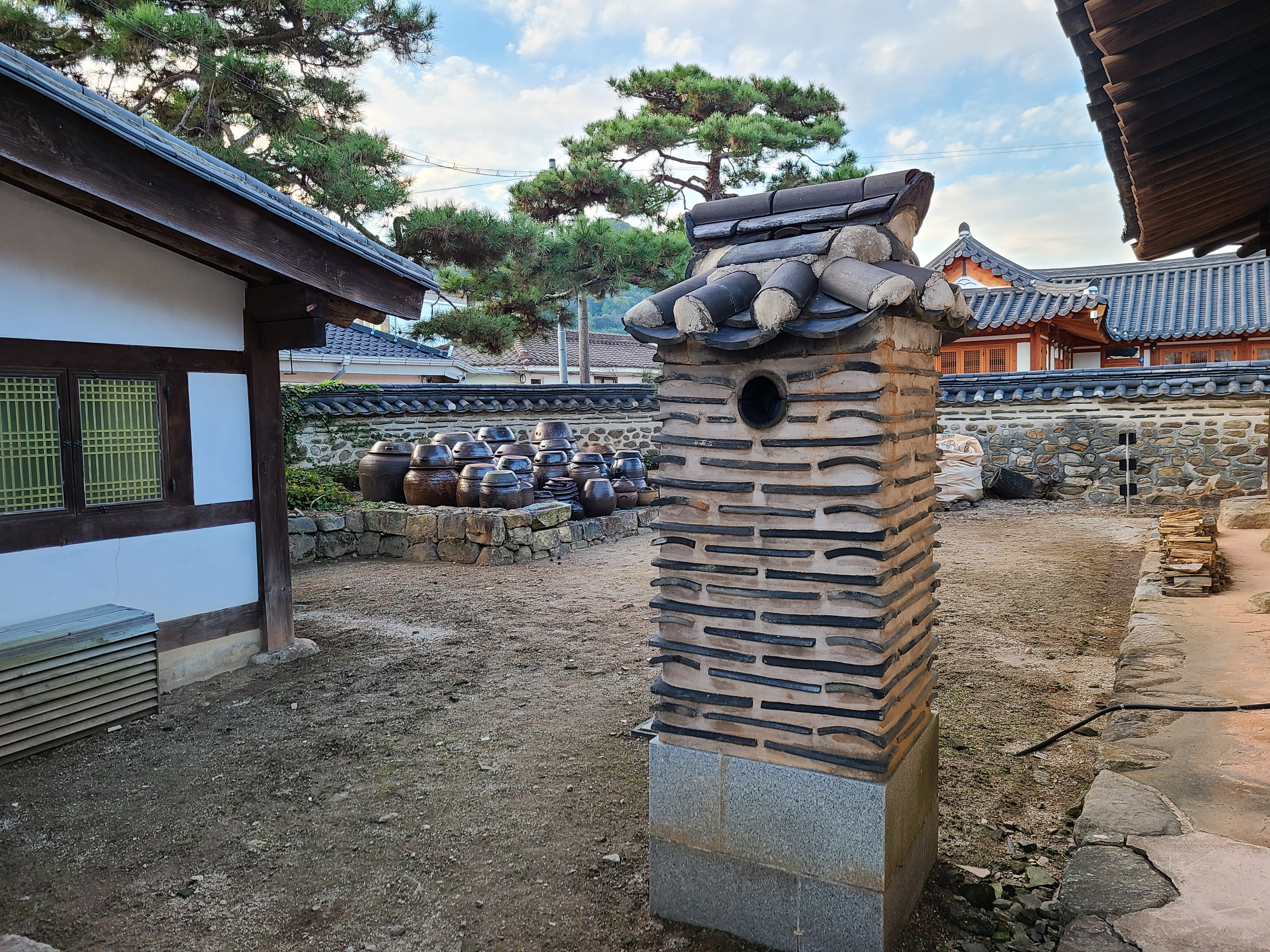 앞마당 오른쪽 담장 곁에는 벼락 맞는 팽나무가 살아있었다. 담장 밖에 나무를 지지하는 지지대가 사다리 모양으로 지지하고 있다.