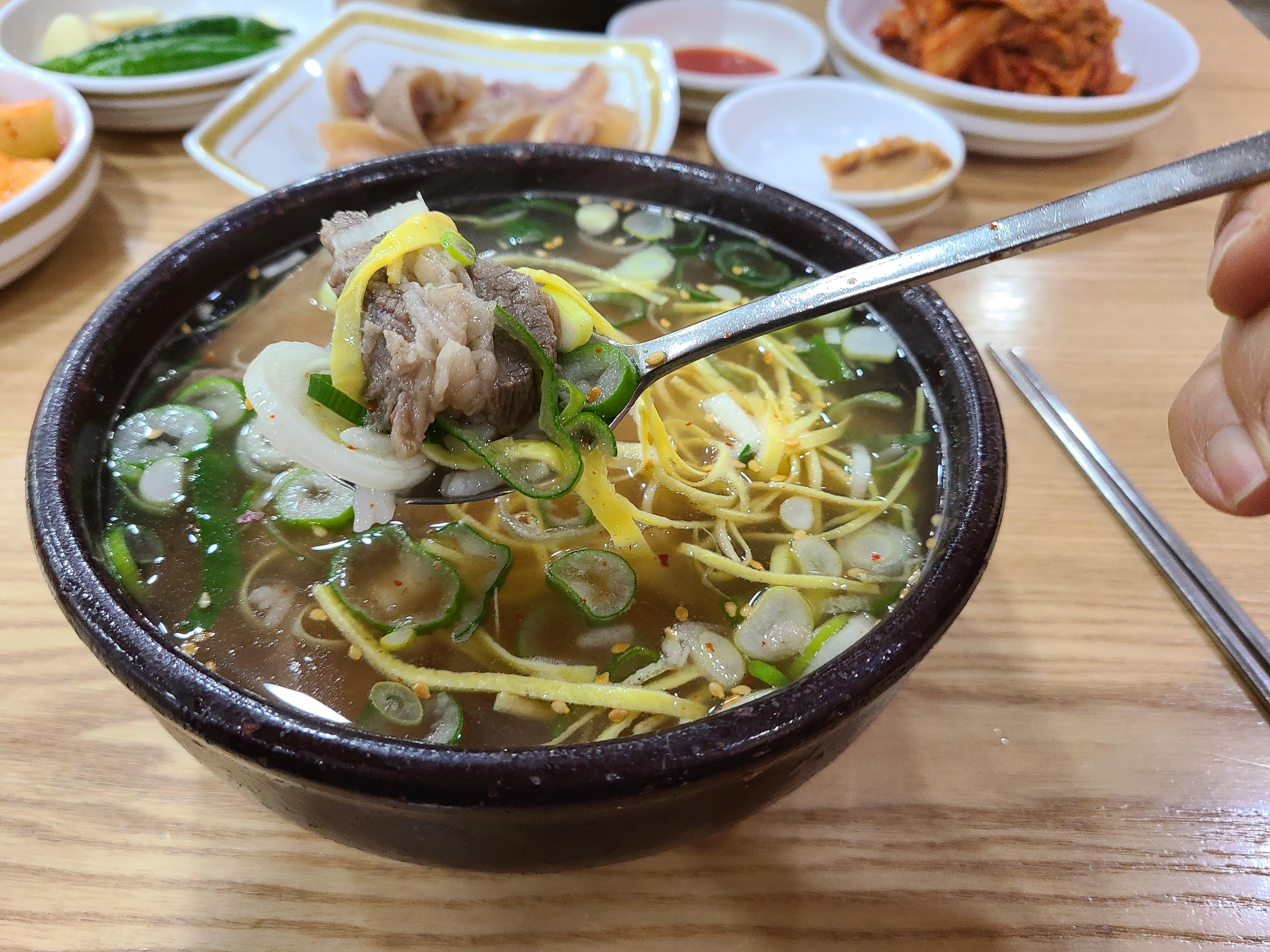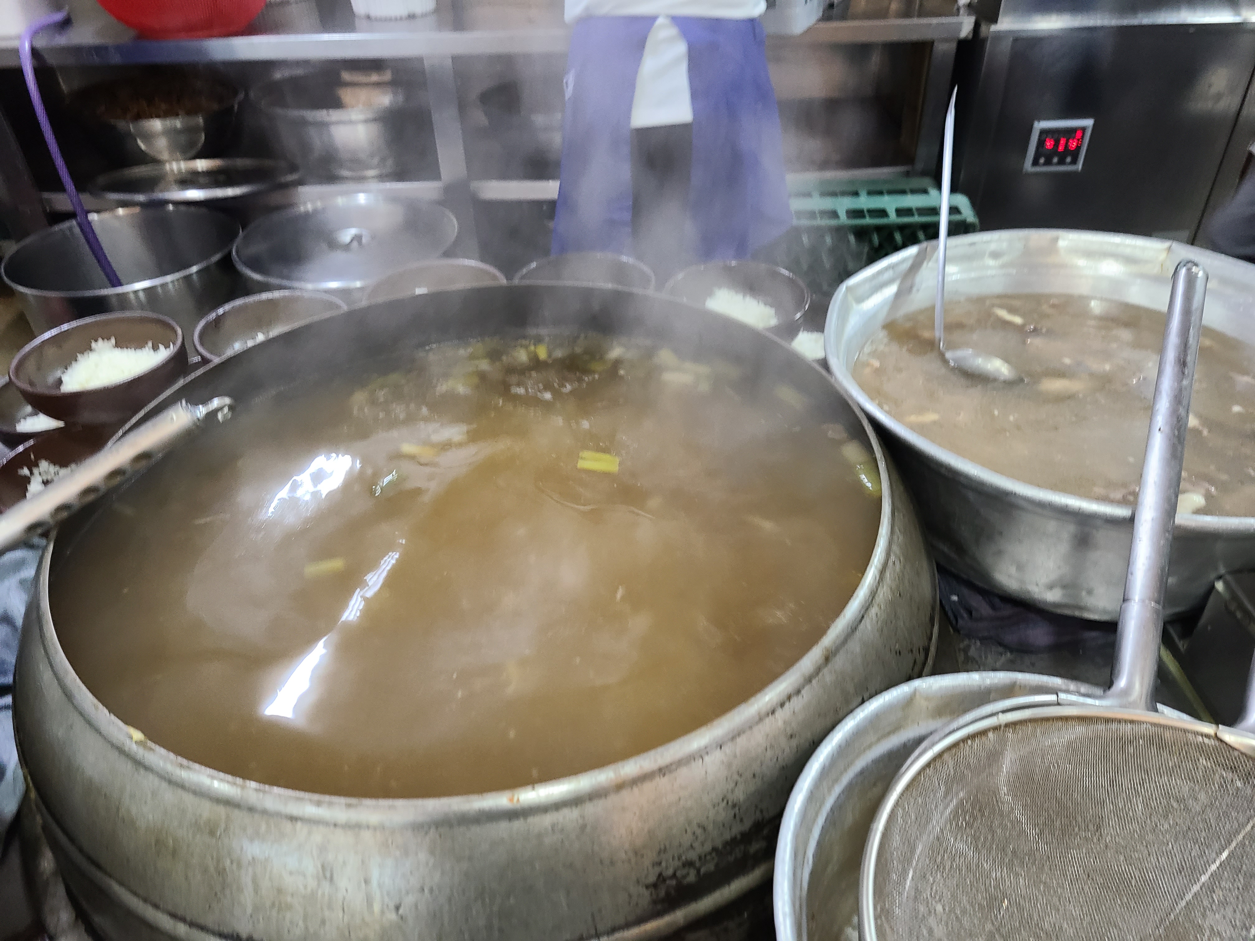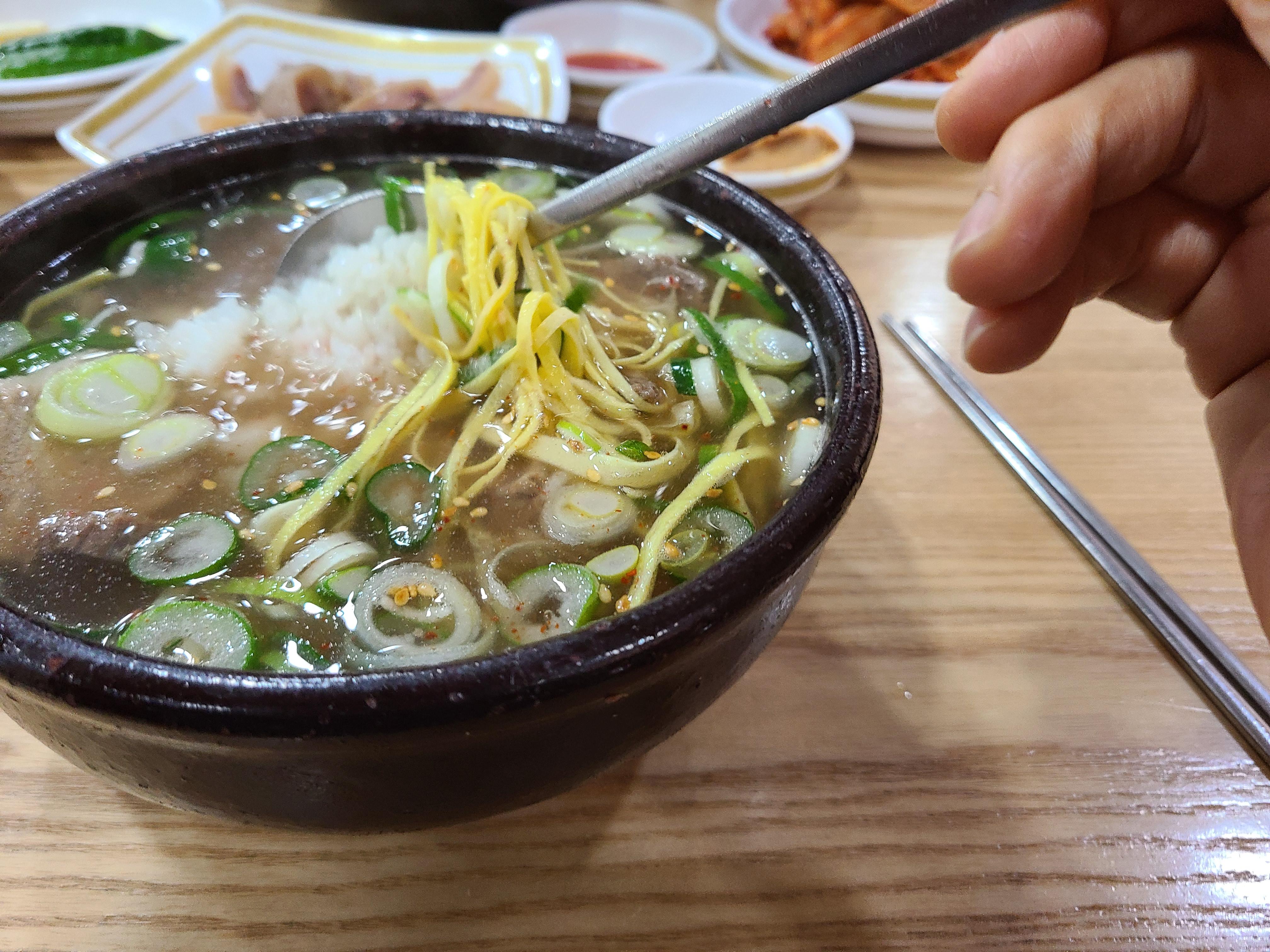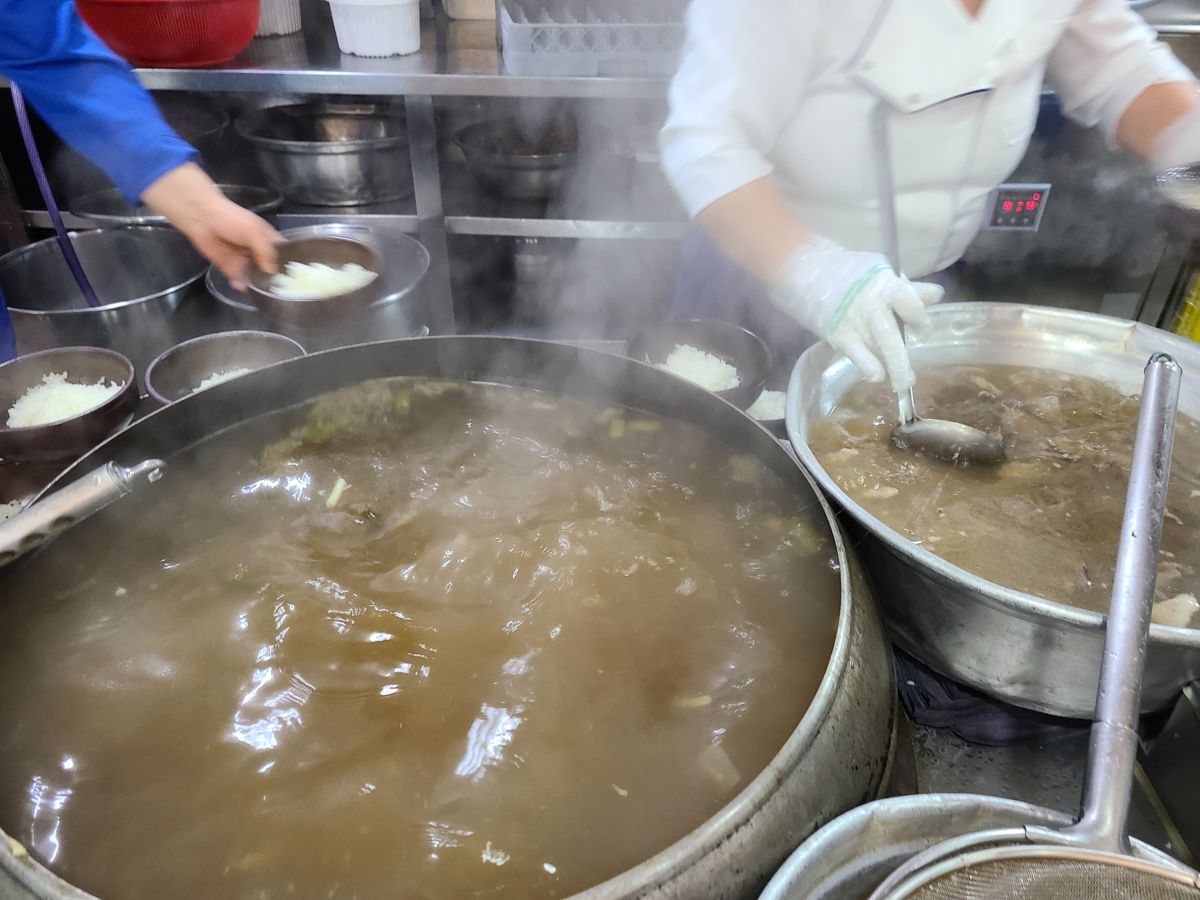 입구에 들어서면 계산대가 있고 왼쪽으로 가마솥이 보인다. 주문에 맞춰 뚝배기에 담긴 밥 위에 곰탕 육수를 토렴 하는 모습이 보인다. 손놀림이 너무 빨라 뚝배기에 육수를 부었다 쏟기를 반복하는 모습을 놓쳤다.