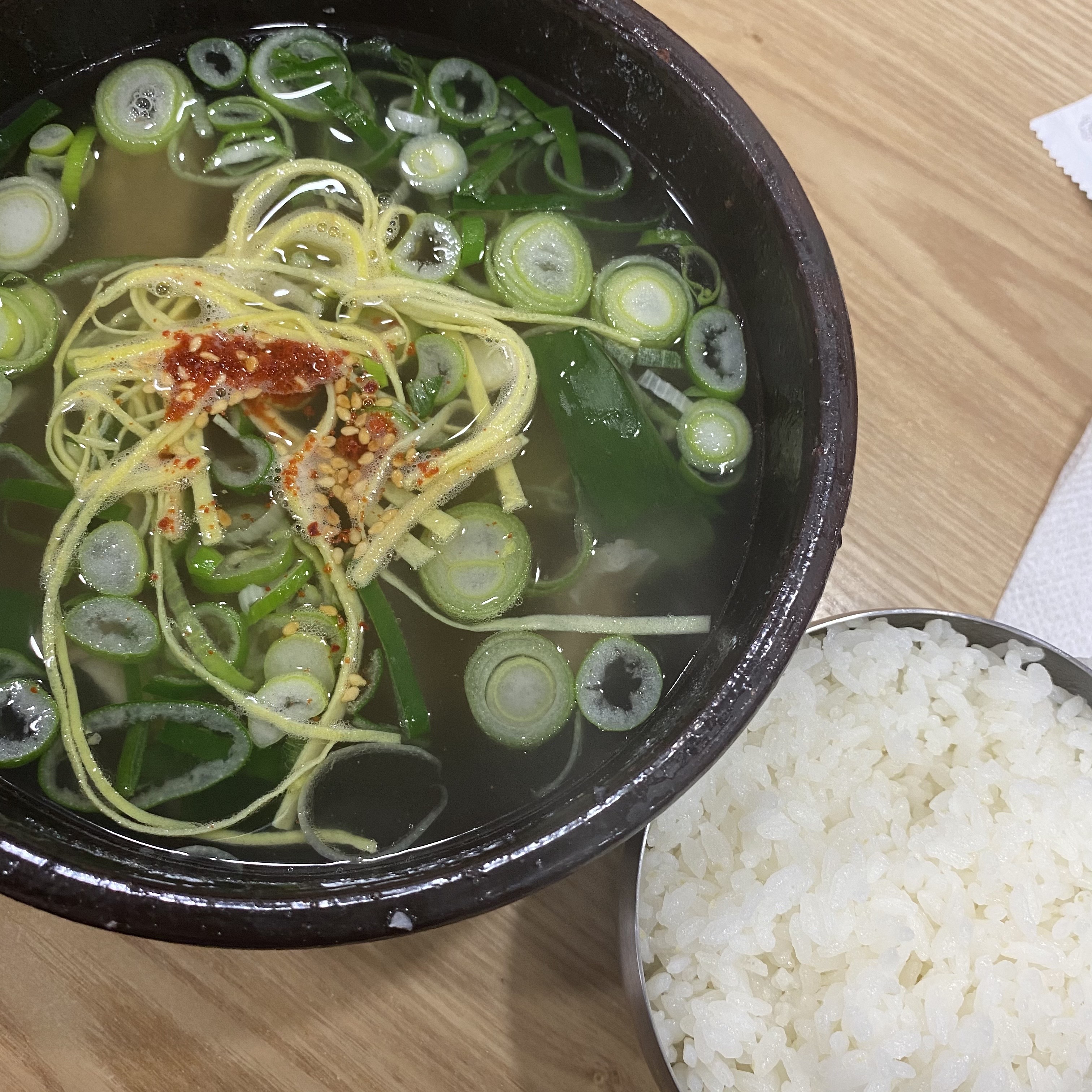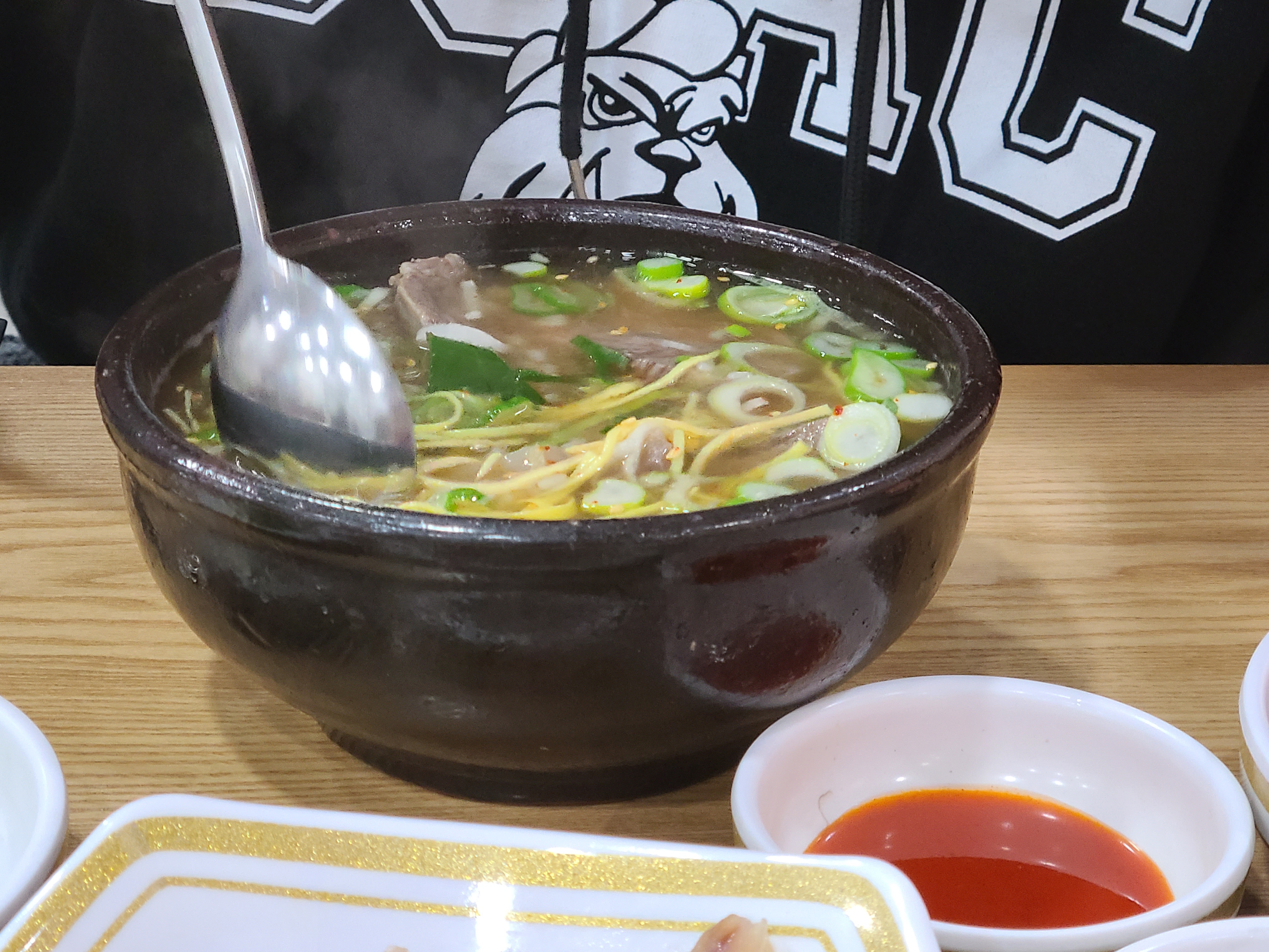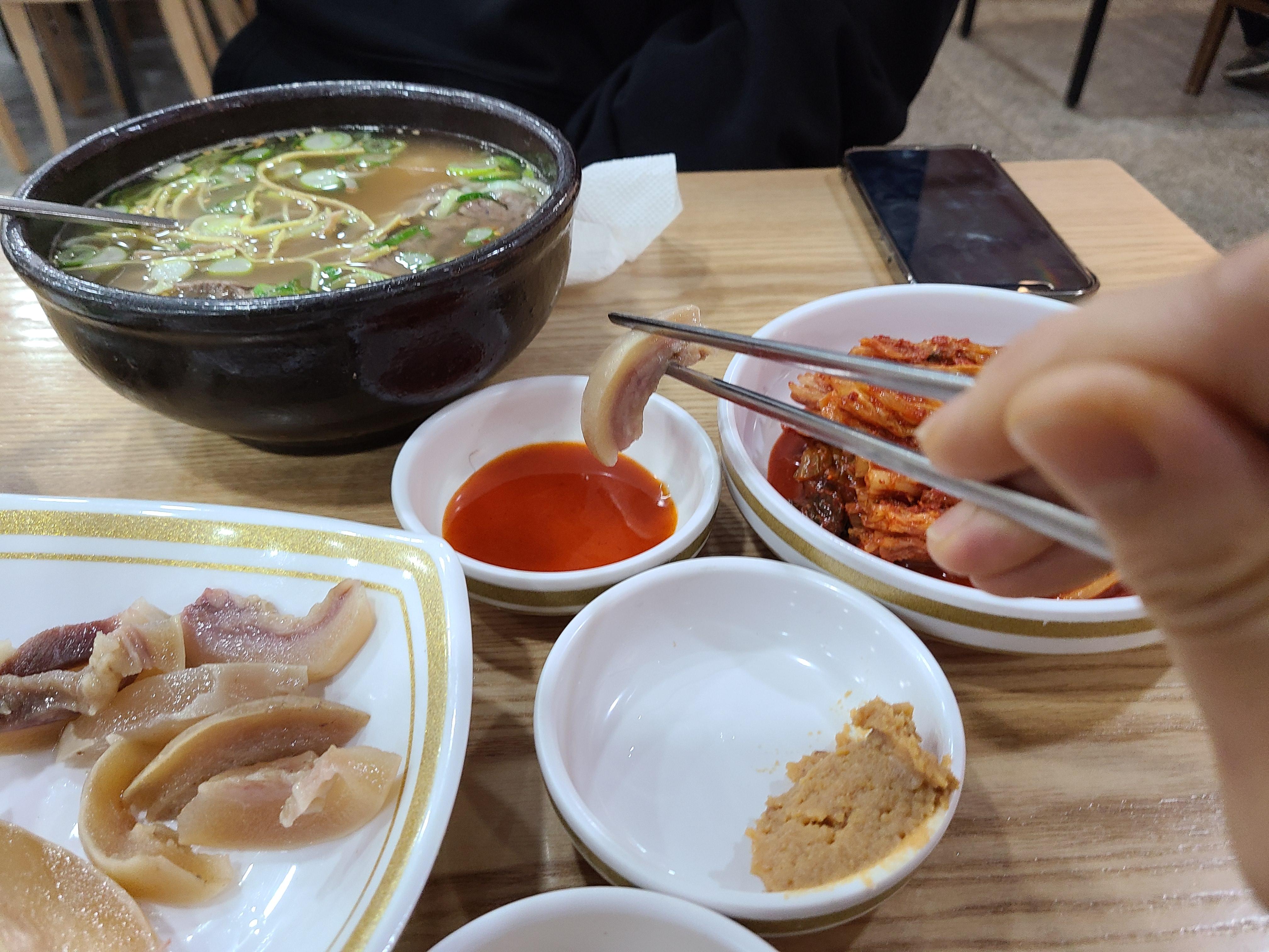 입구에 들어서면 계산대가 있고 왼쪽으로 가마솥이 보인다. 주문에 맞춰 뚝배기에 담긴 밥 위에 곰탕 육수를 토렴 하는 모습이 보인다. 손놀림이 너무 빨라 뚝배기에 육수를 부었다 쏟기를 반복하는 모습을 놓쳤다.