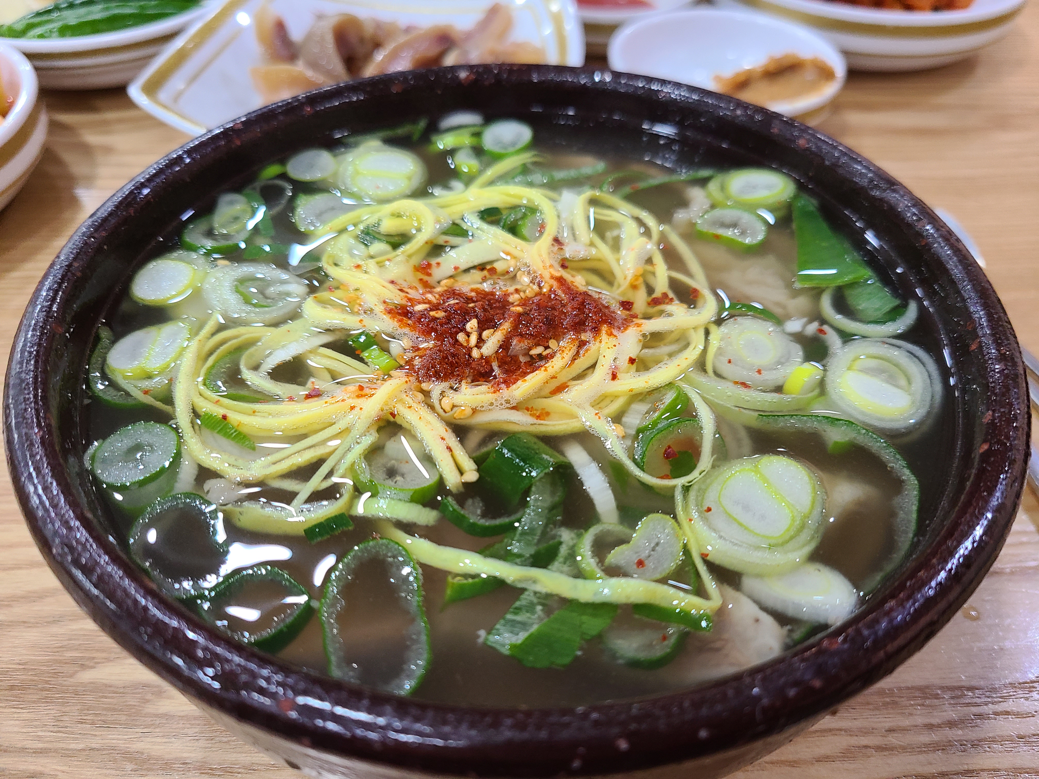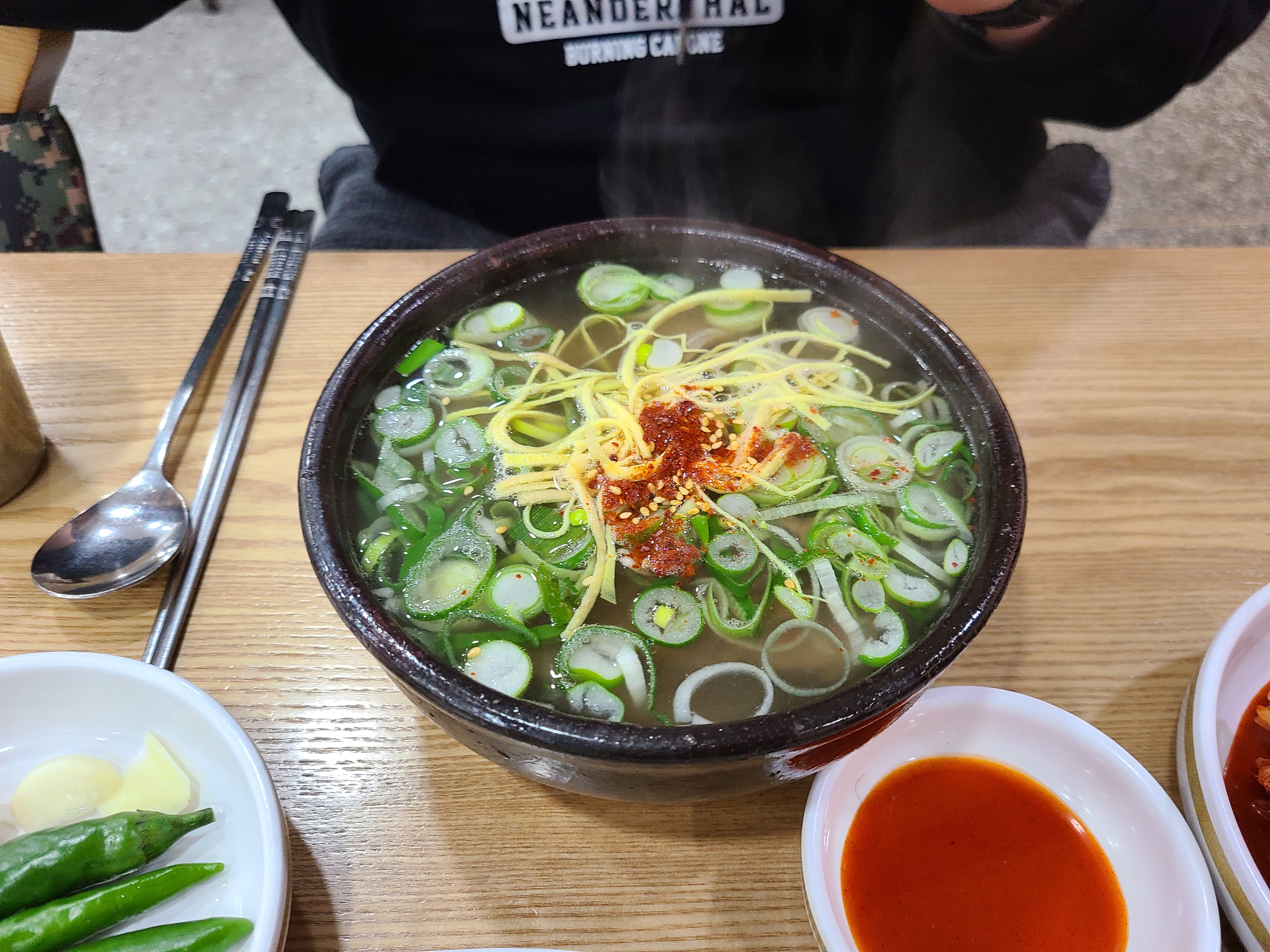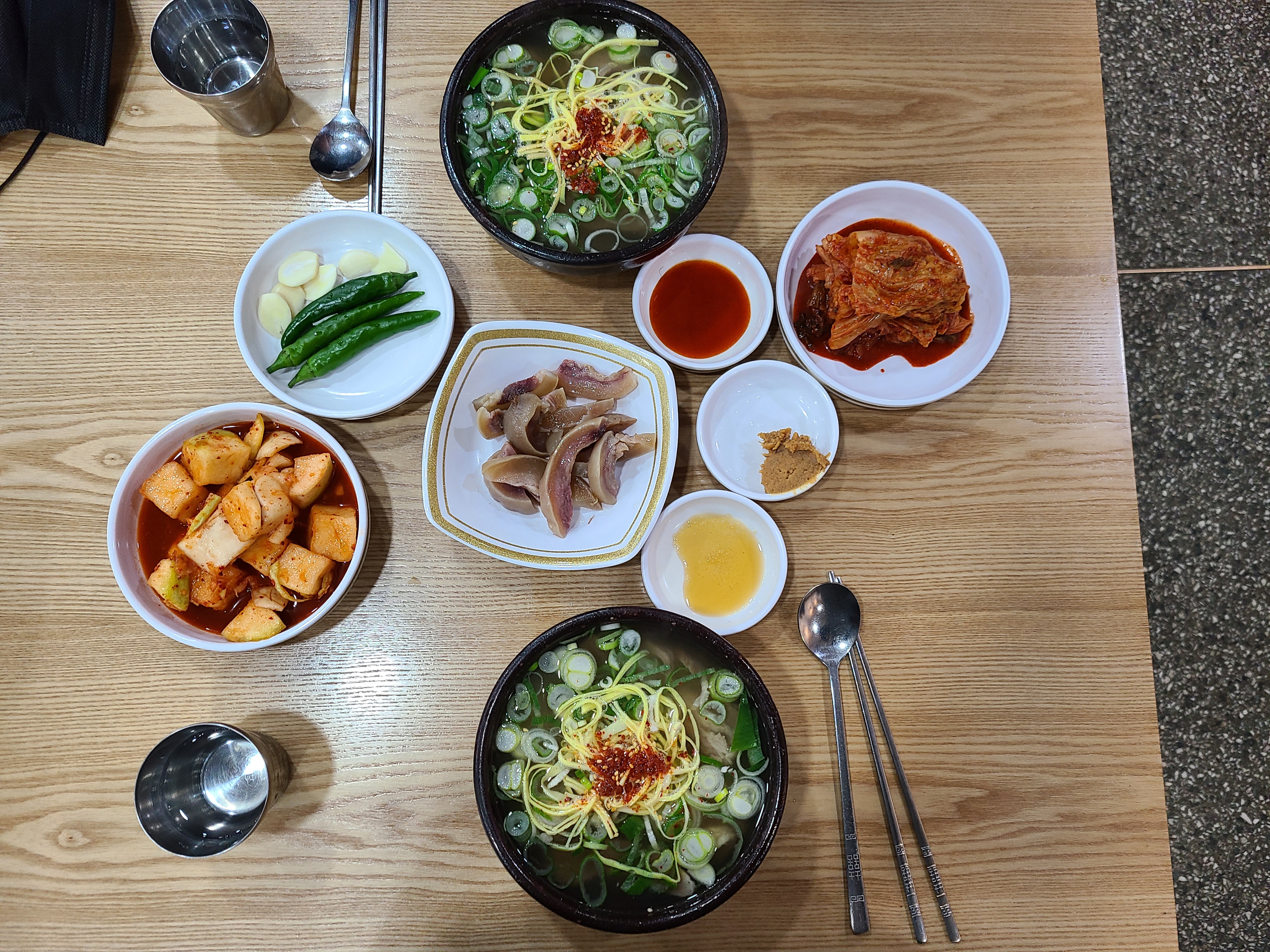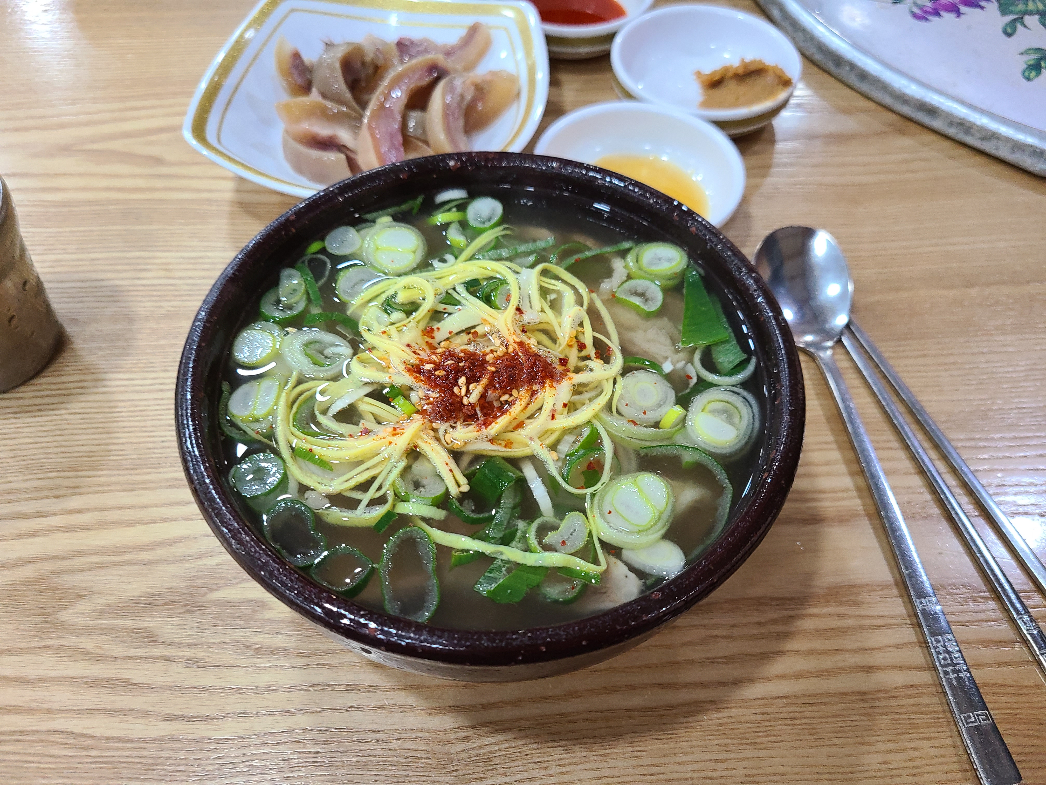 입구에 들어서면 계산대가 있고 왼쪽으로 가마솥이 보인다. 주문에 맞춰 뚝배기에 담긴 밥 위에 곰탕 육수를 토렴 하는 모습이 보인다. 손놀림이 너무 빨라 뚝배기에 육수를 부었다 쏟기를 반복하는 모습을 놓쳤다.