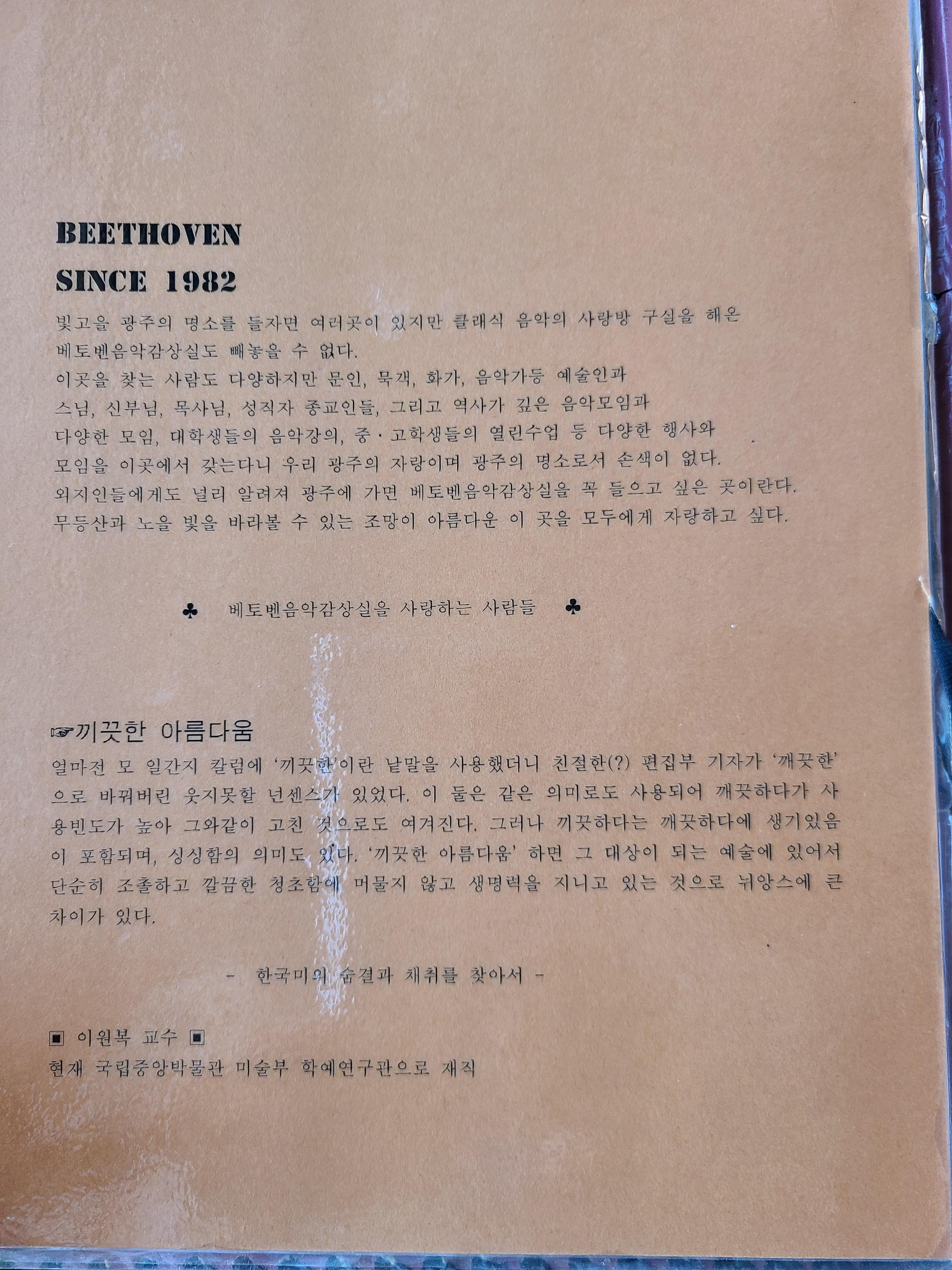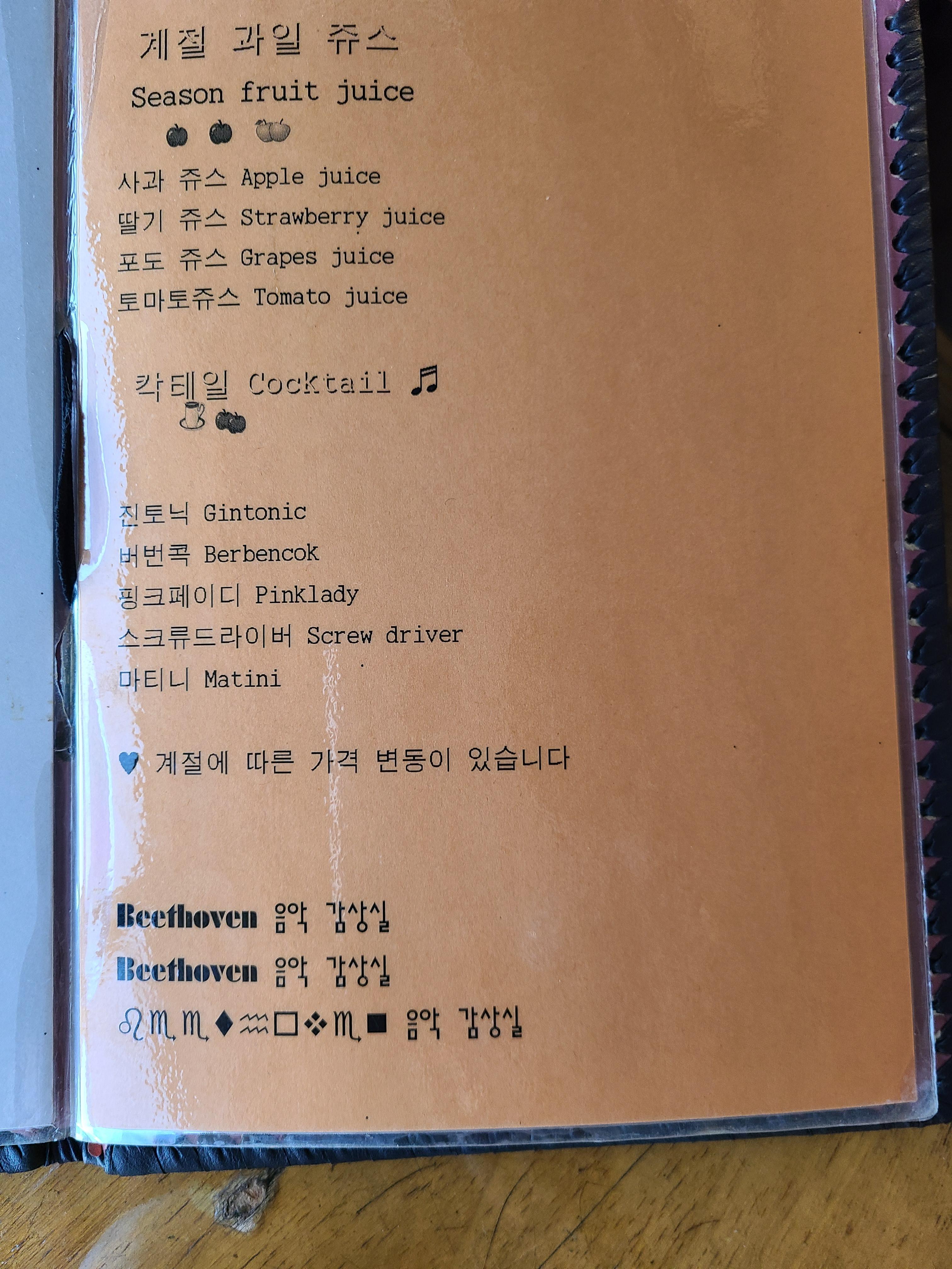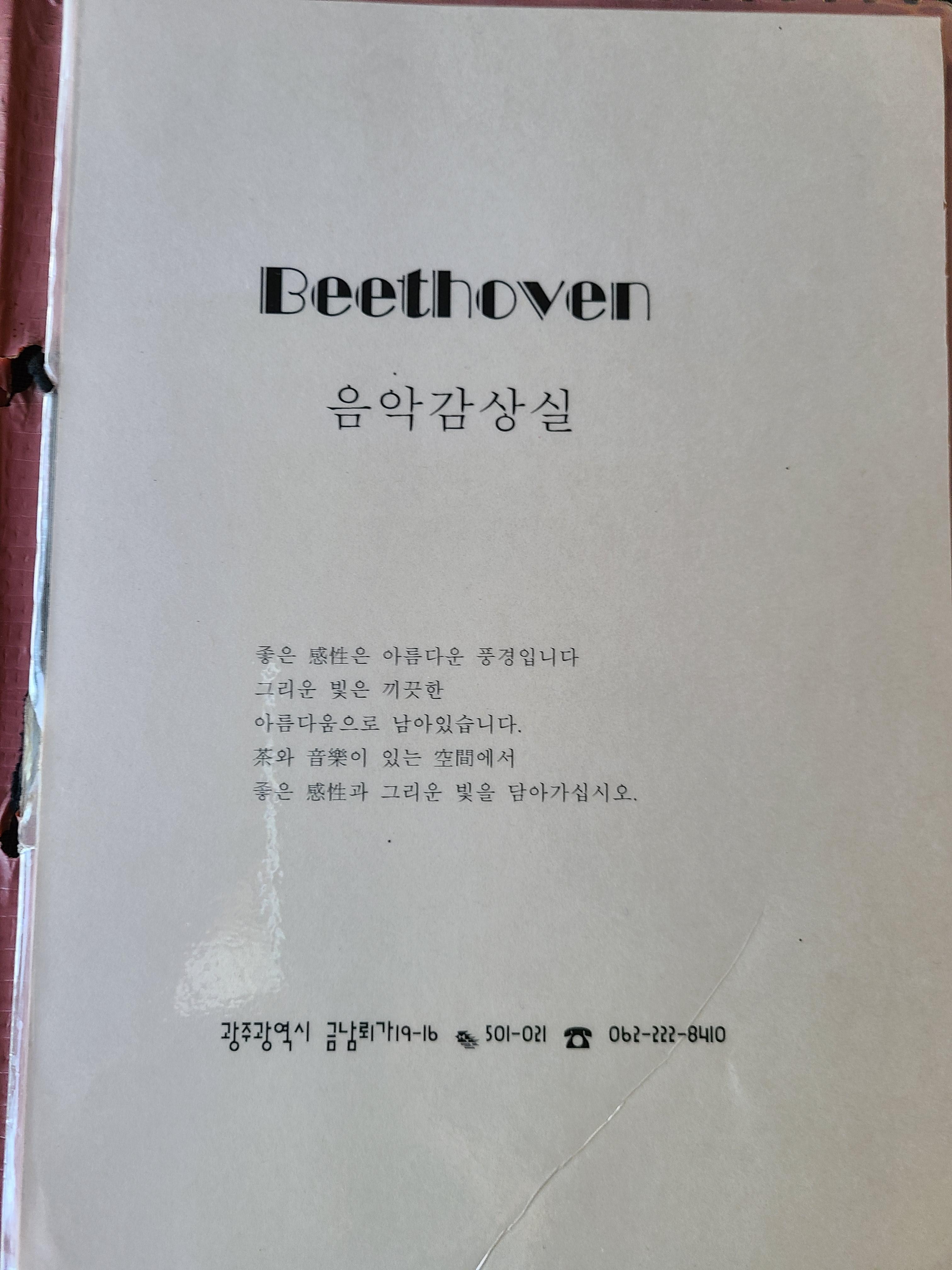 메뉴판 한 페이지에 베토벤 음악감상실에 대한 안내글이 있는데 1982년에 문을 연듯하다. 40년 가까운 세월이 흐른 곳이다.