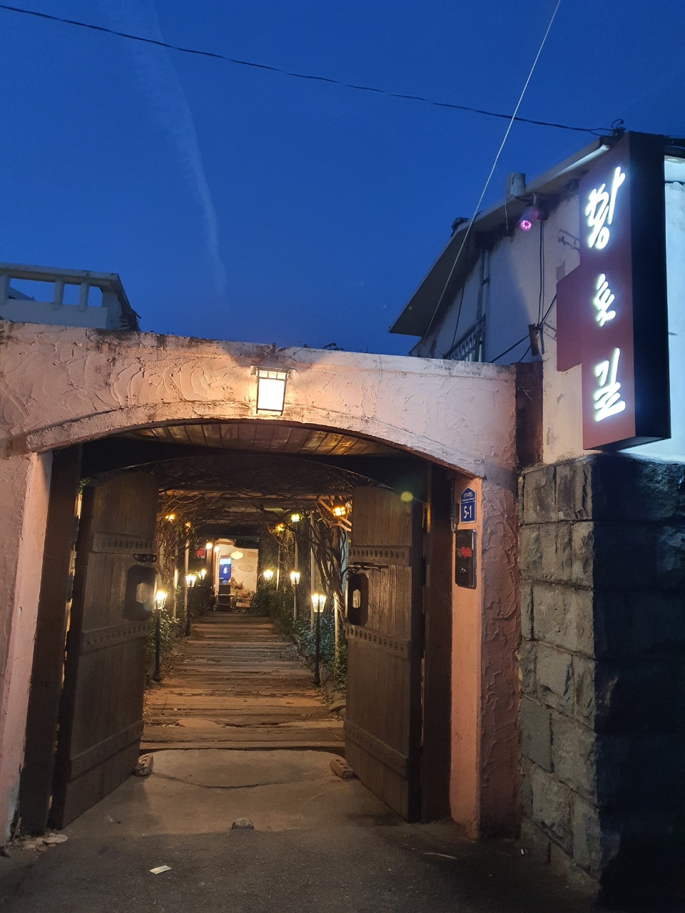 도로를 건너 직진으로 걸어가다가 '오늘, 와인 한잔'이라는 가게 직전에서 오른쪽 골목으로 들어서니 황톳길이 보였다.