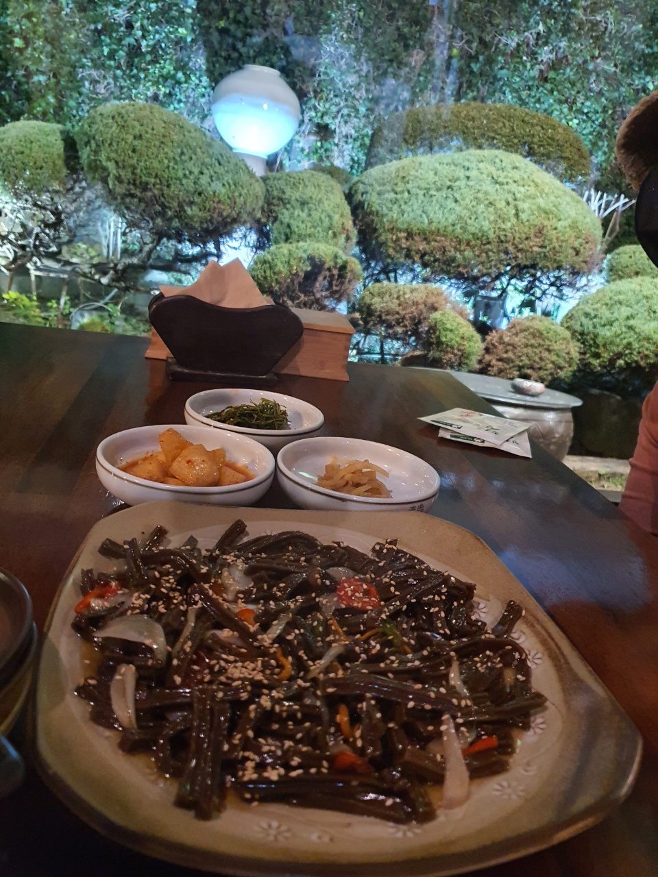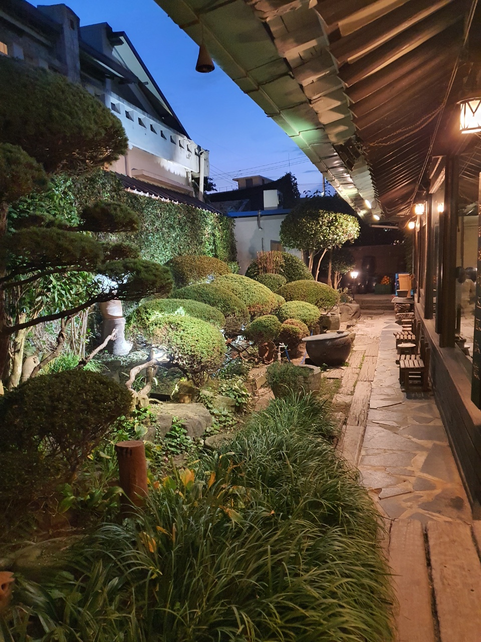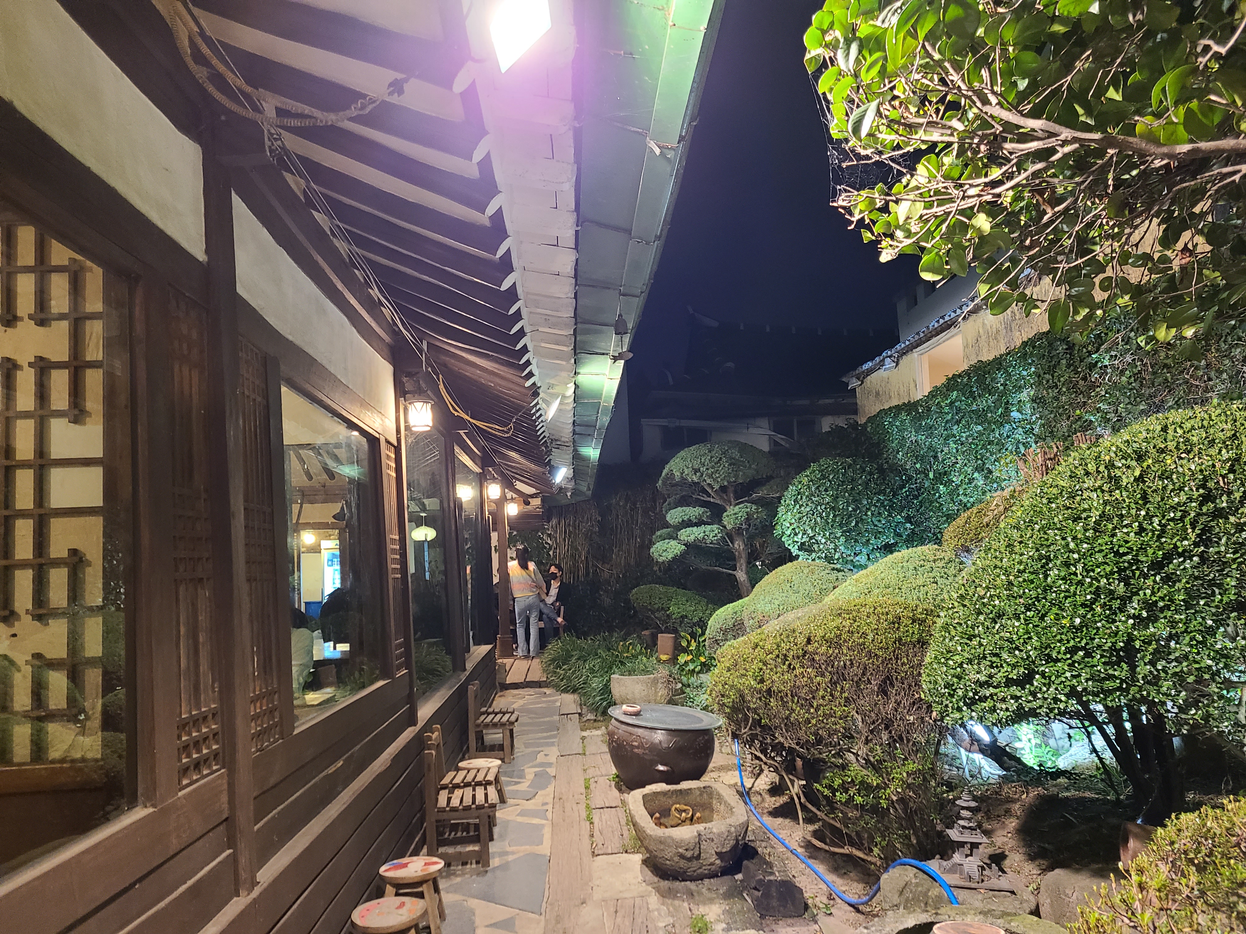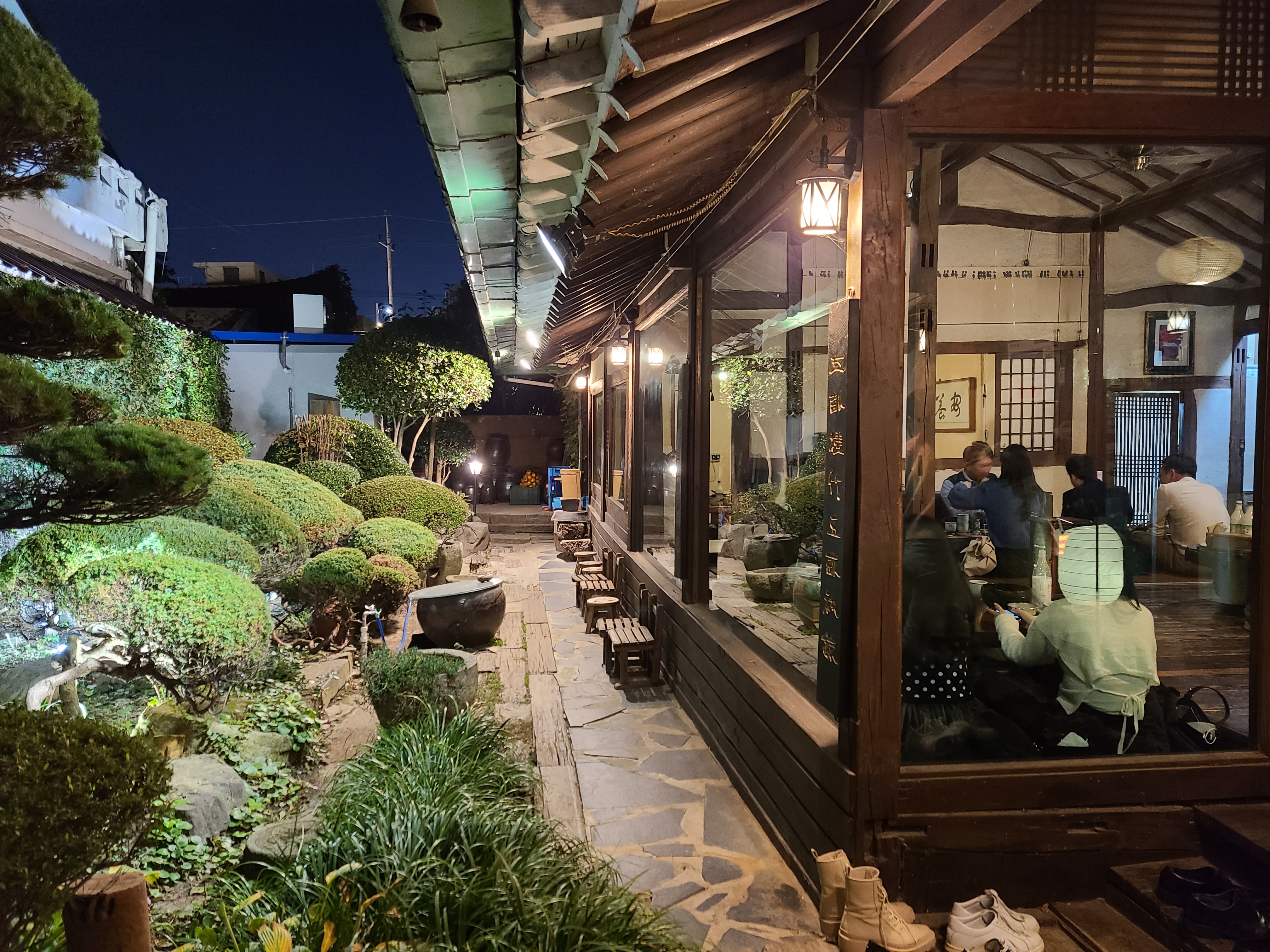 황톳길 대문을 들어서면 등나무 터널을 지나가게 된다. 한옥 대청마루에 유리창을 설치해놓아 실내가 훤히 들여다 보이면서도 아늑해 보인다. 앞마당에 있는 정원도 한옥과 너무 잘 어울렸다. 늦은 시간이 아닌데도 이미 손님이 많이 와있었다.