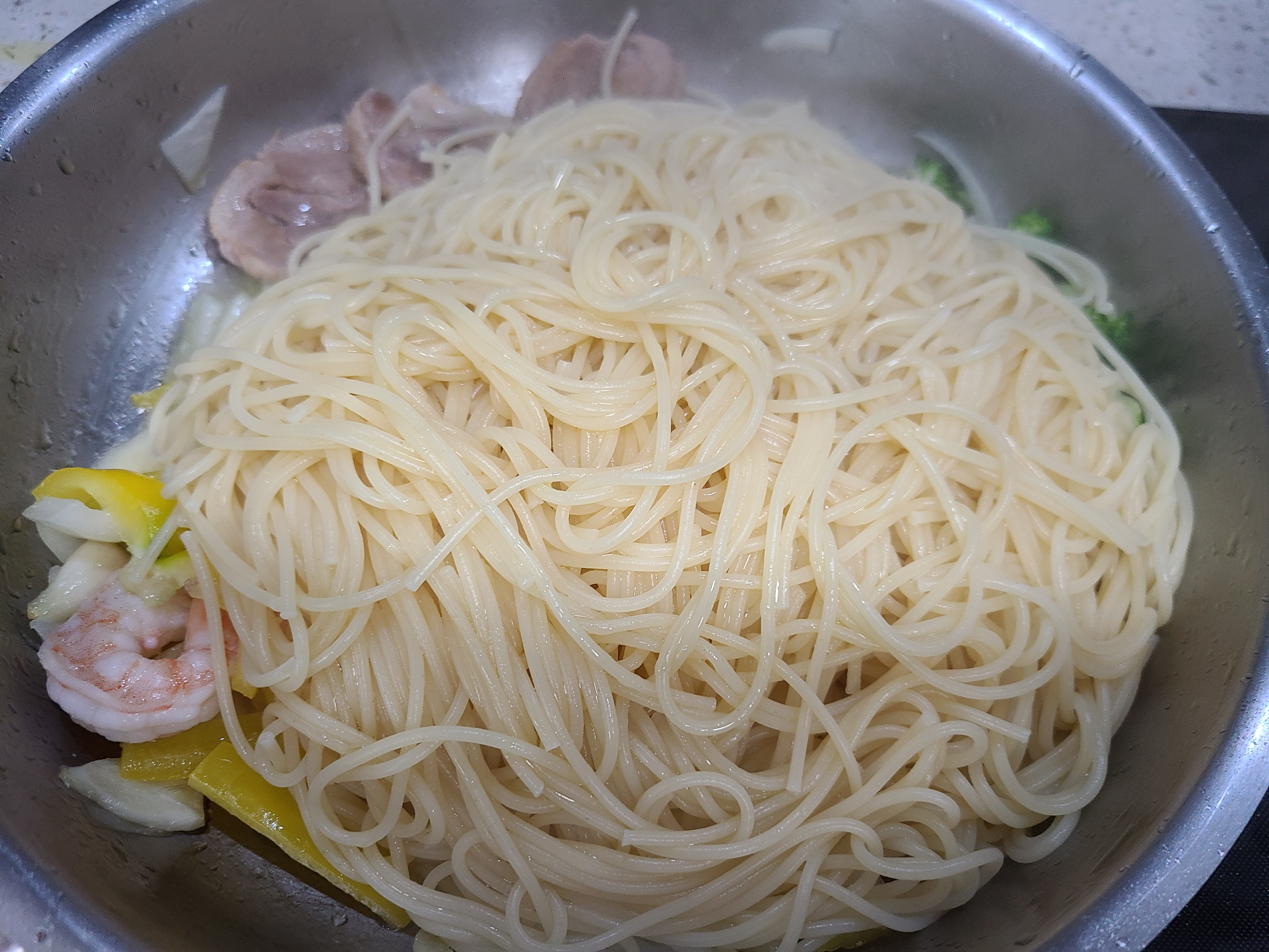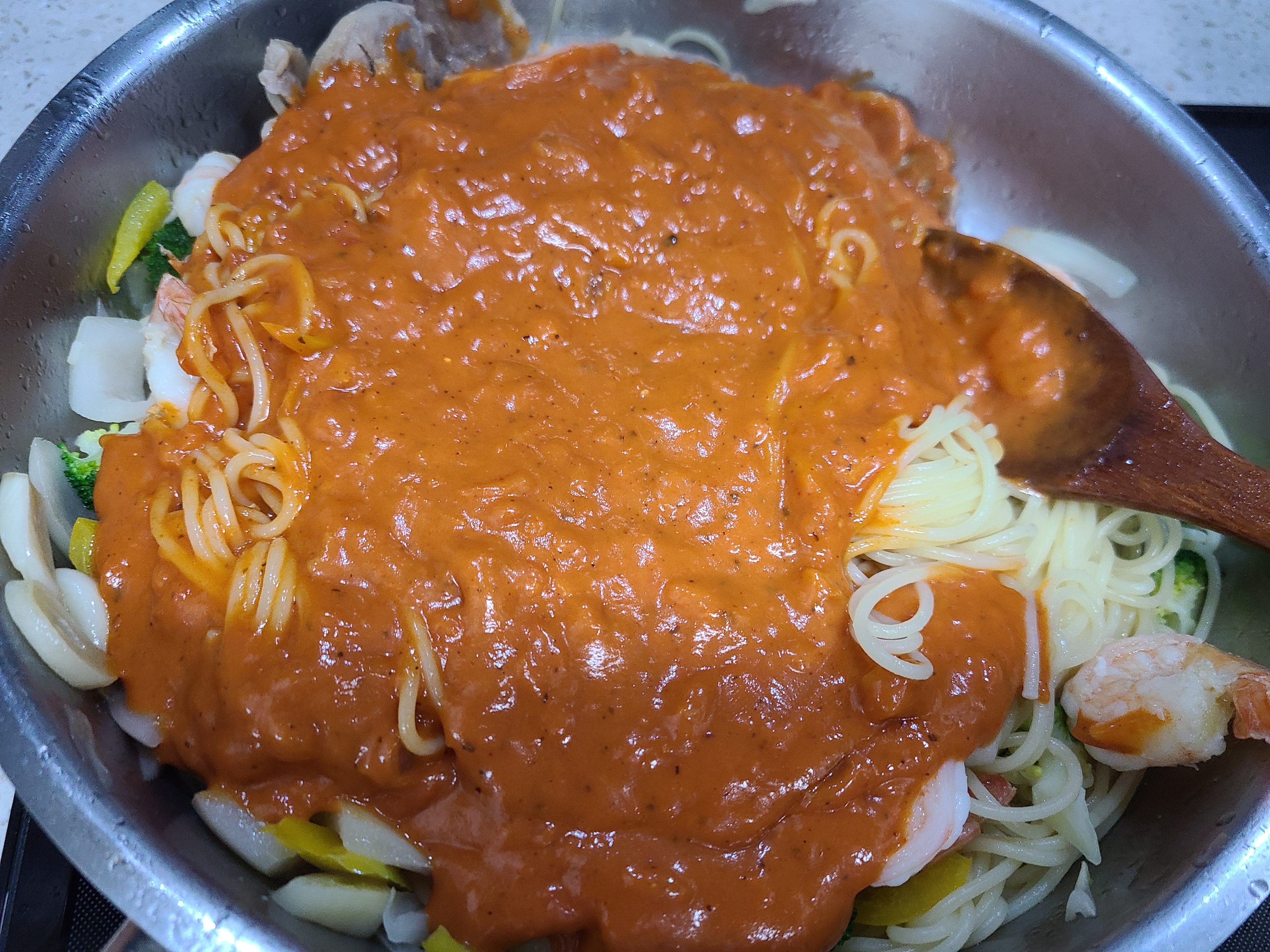 7. 스파게티면에 올리브유가 골고루 섞이면 폰타나 밀라노 크림치즈 로제 소스를 부어준다.