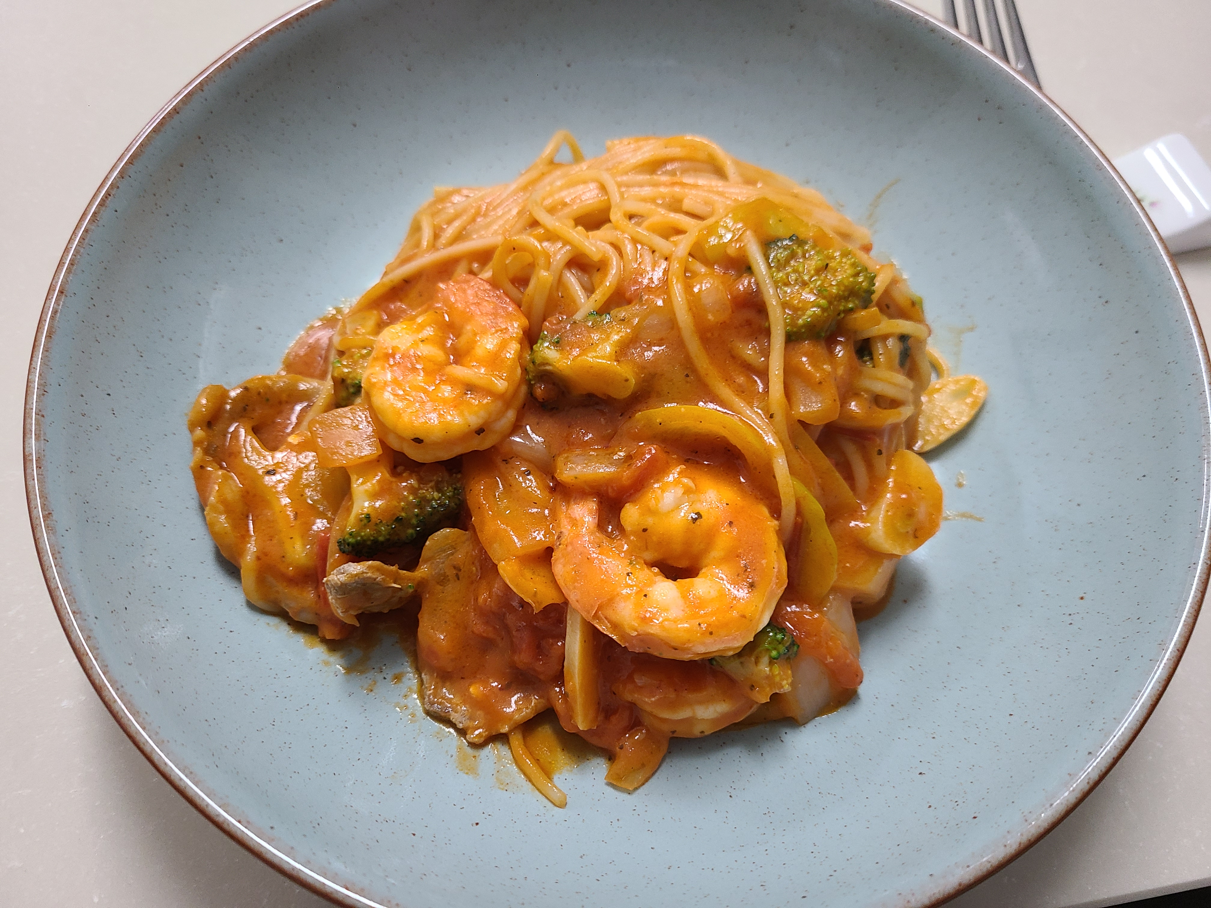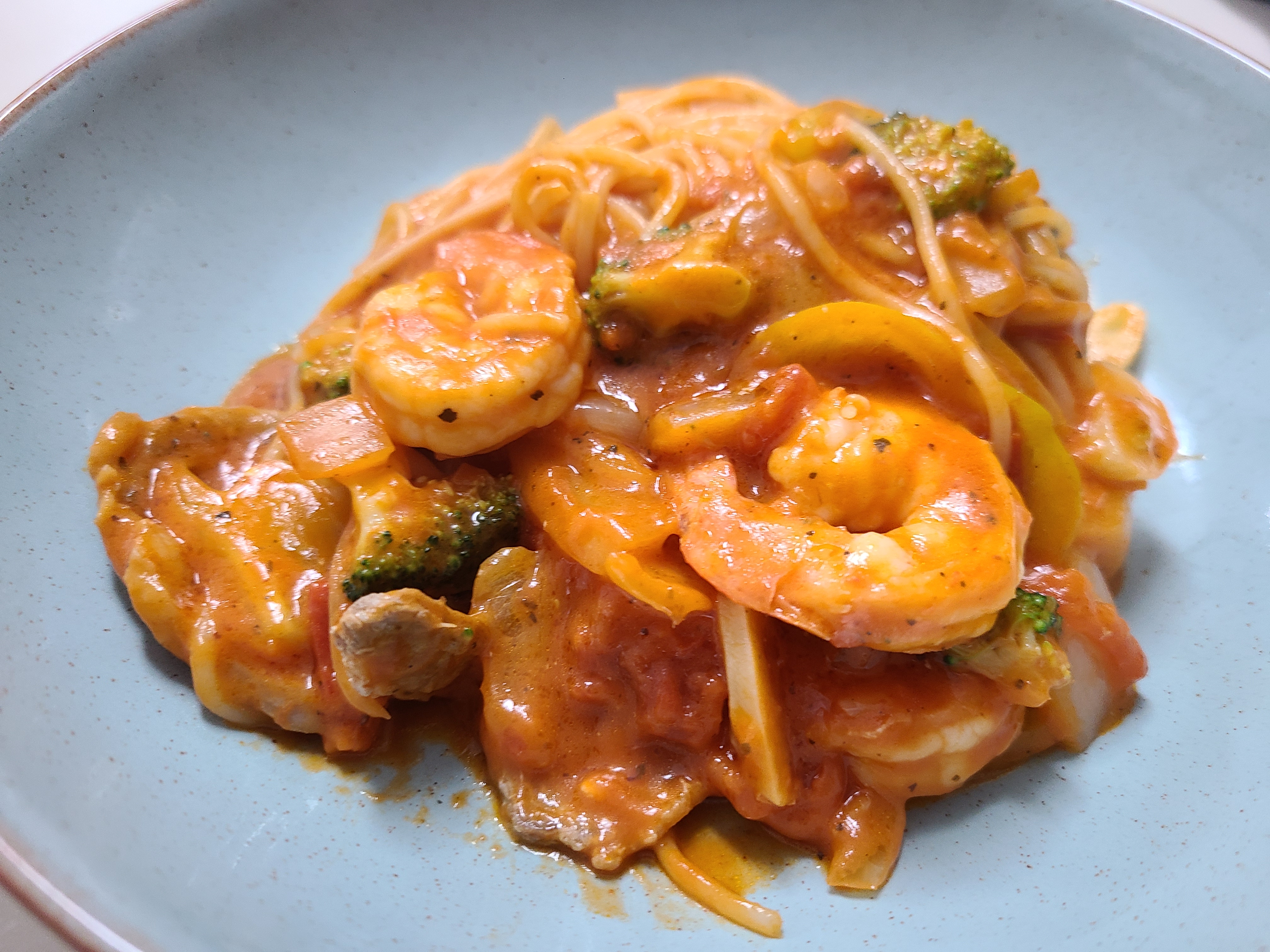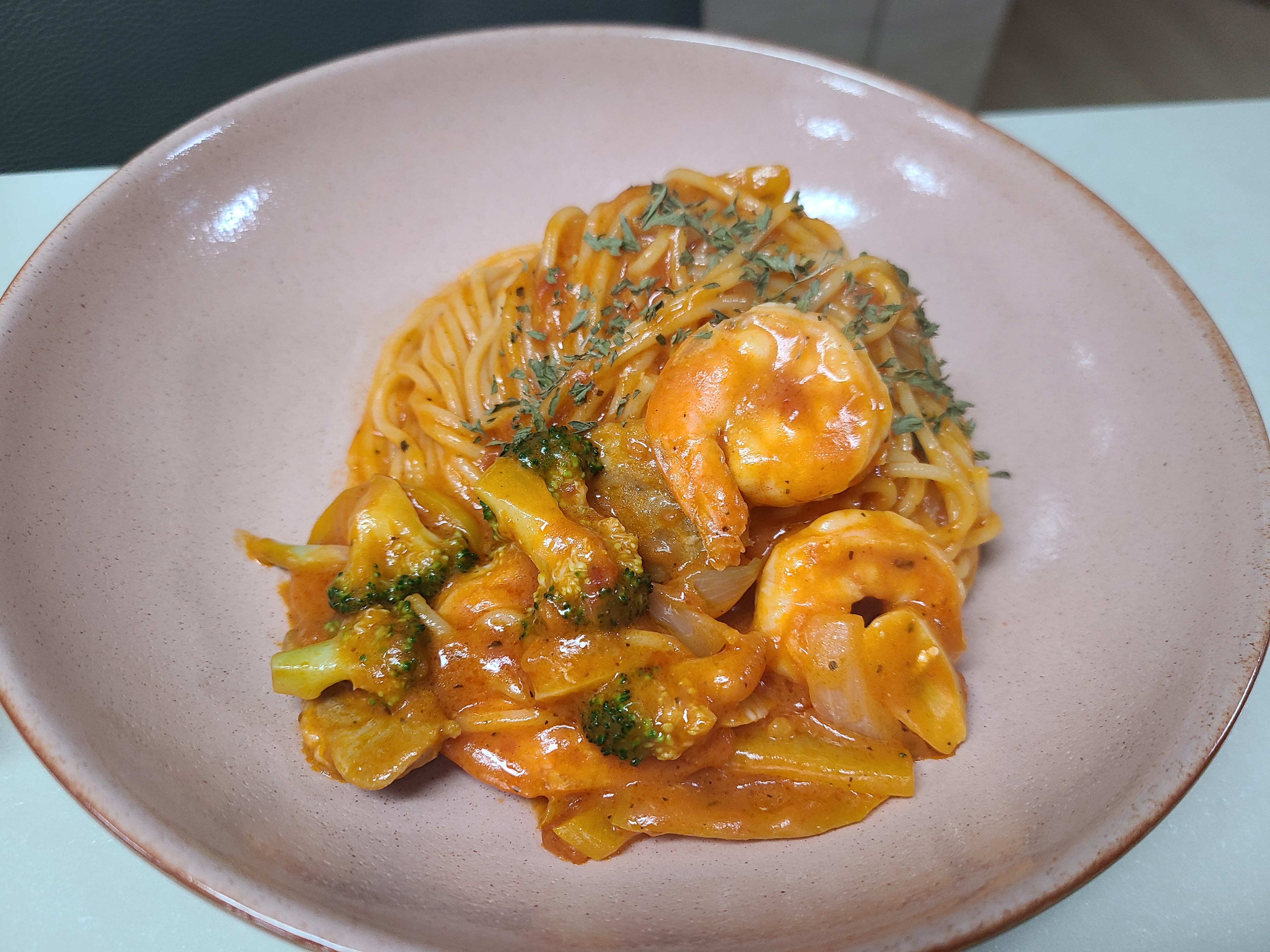 폰타나 밀라노 크림치즈 로제 600g, 파스타면 250g, 오리로스 10개, 냉동새우 10개, 브로콜리, 파프리카, 마늘, 양파