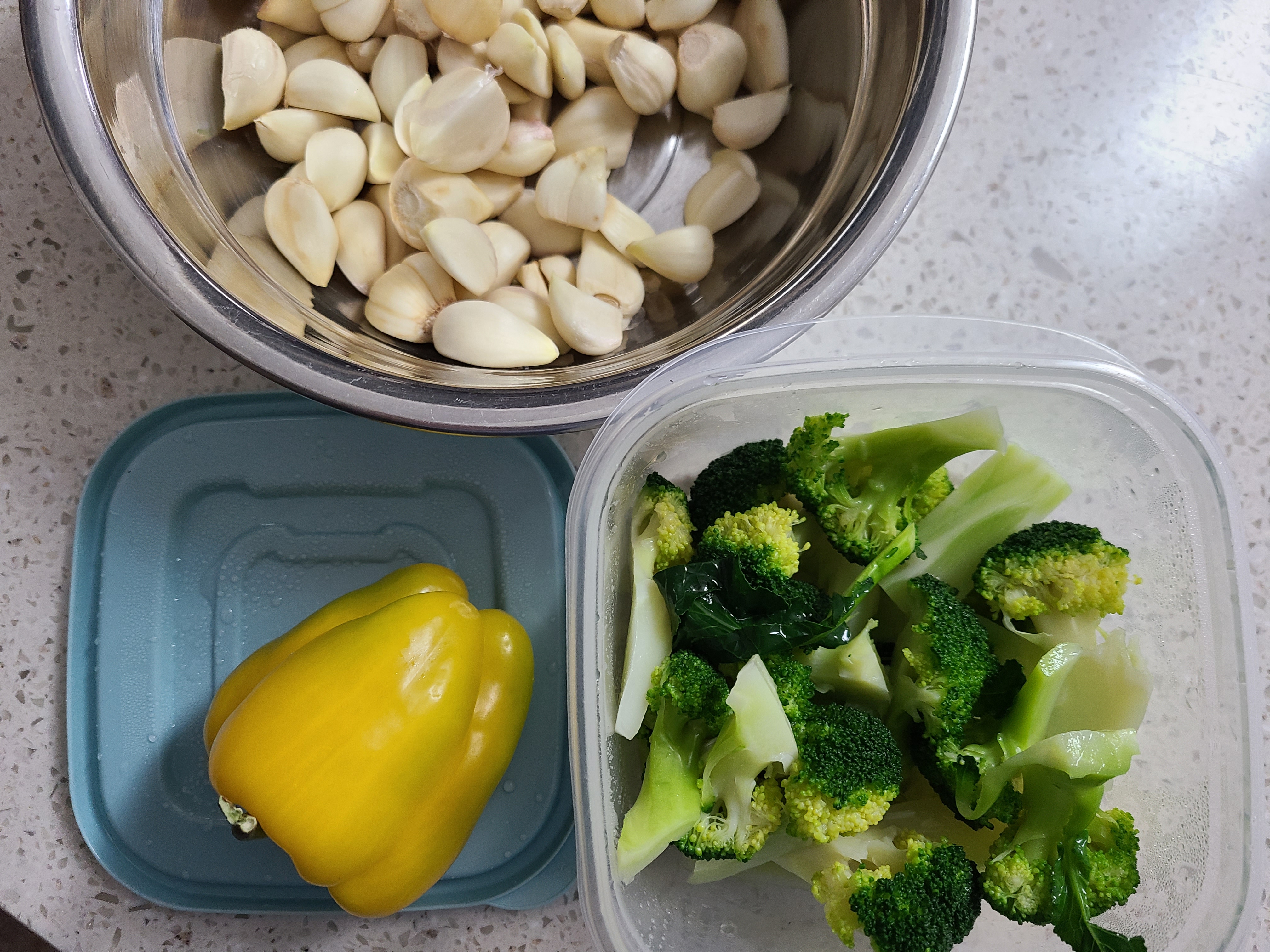 구입한 폰타나 밀라노 크림치즈 로제 소스를 꺼내놓고 냉장고에 파스타 재료 할 만한 것을 찾아보았다. 어제 까놓은 통마늘과 브로콜리, 파프리카가 눈에 들어왔다.