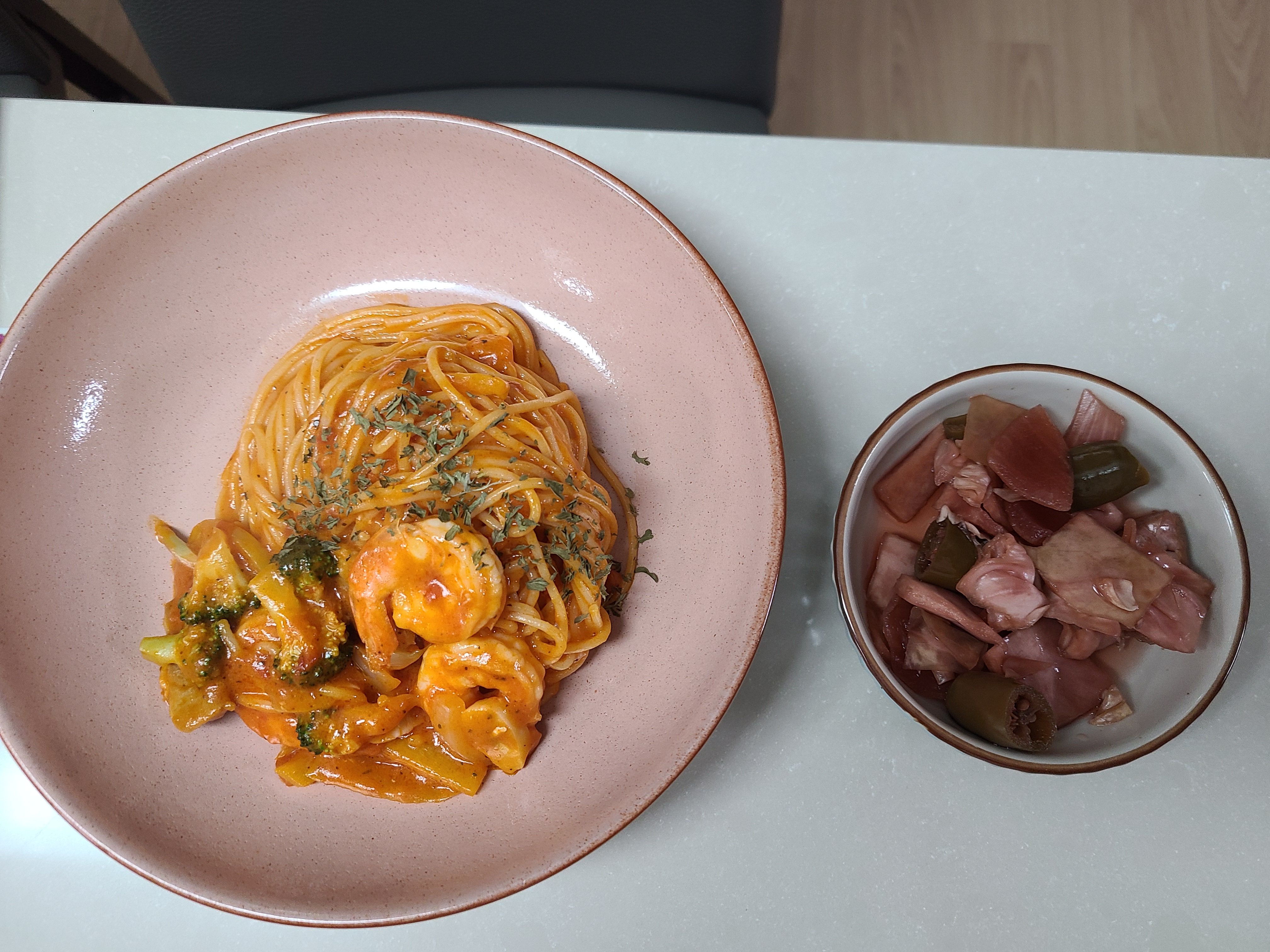 파스타 소스와 면은 구입했지만 다른 재료를 구입하지 않았기에 냉장고에 있는 재료로만 만들어 보았다.