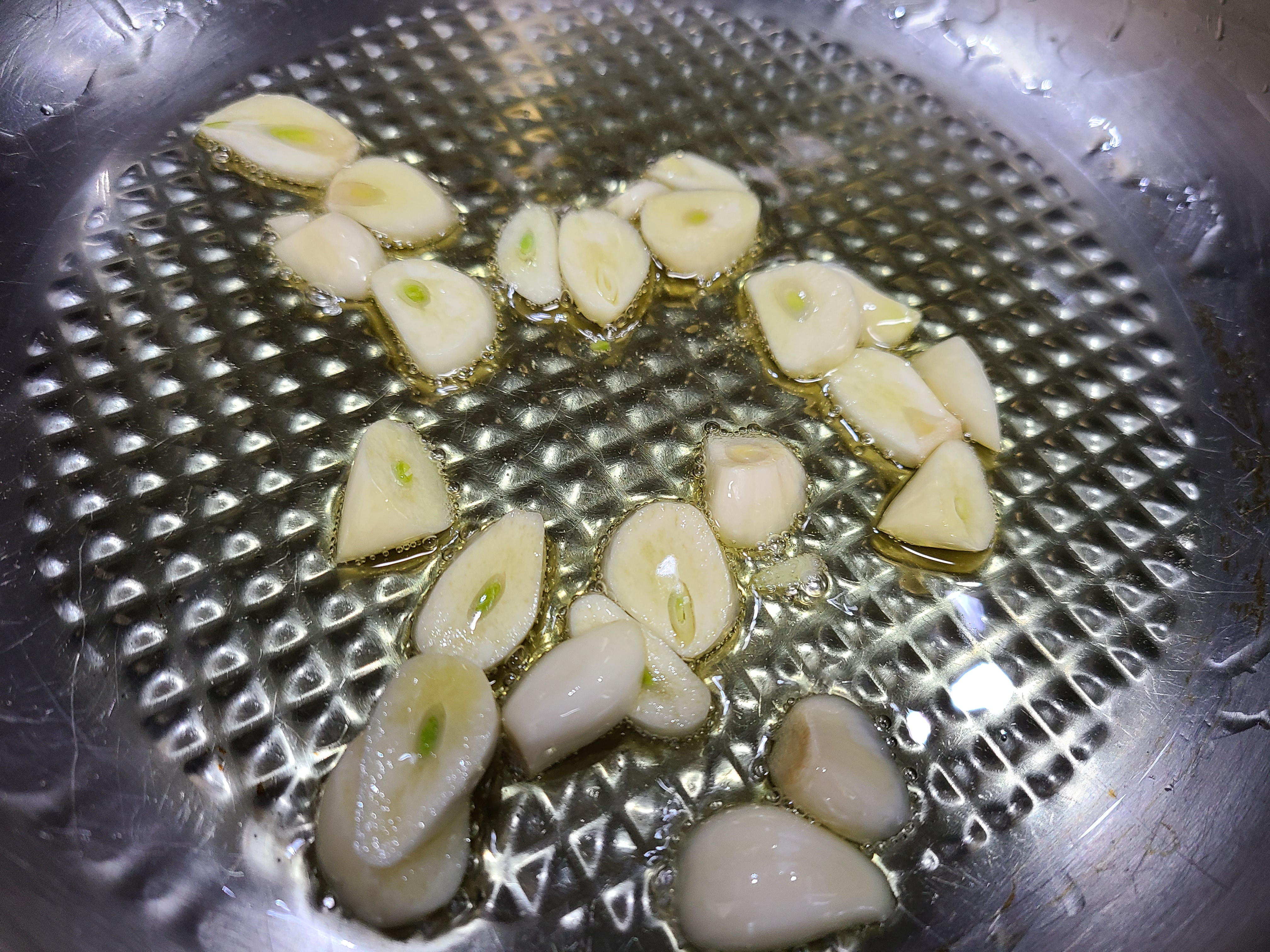 3. 올리브유를 넉넉히 부은 후 납작하게 썰은 마늘을 먼저 볶아준다.