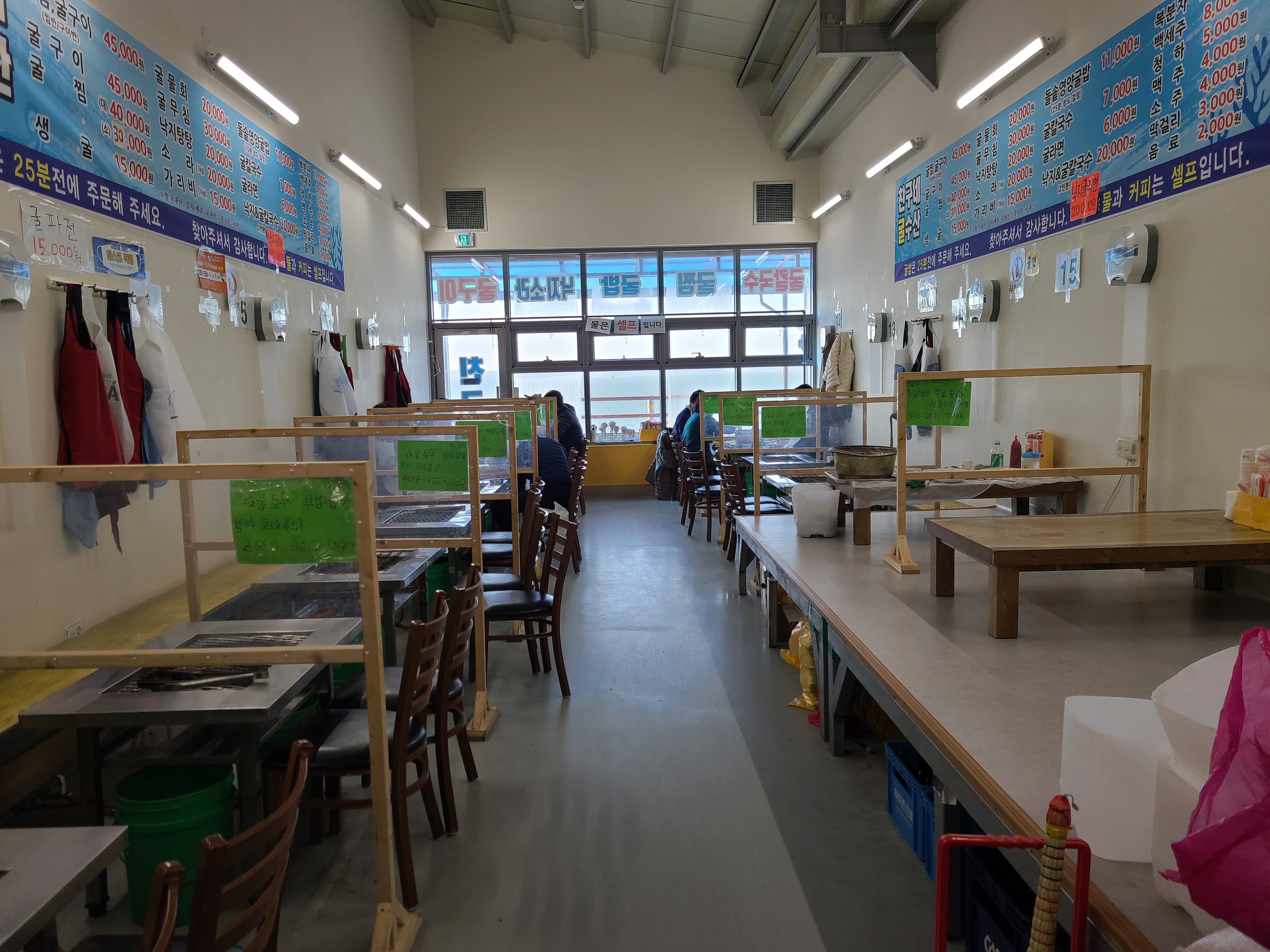 친구네 굴 수산에서는 바다가 내려다 보여 창가에 앉으면 바다를 보며 먹을 수 있는데 이미 다른 손님이 앉아 있었다. 좌석은 입식과 좌식으로 나뉘어 있다. 우리는 굴구이가 아닌 굴찜을 먹으려고 오른쪽 좌식으로 올라가 앉았는데 방바닥이 따뜻하고 좋았다.