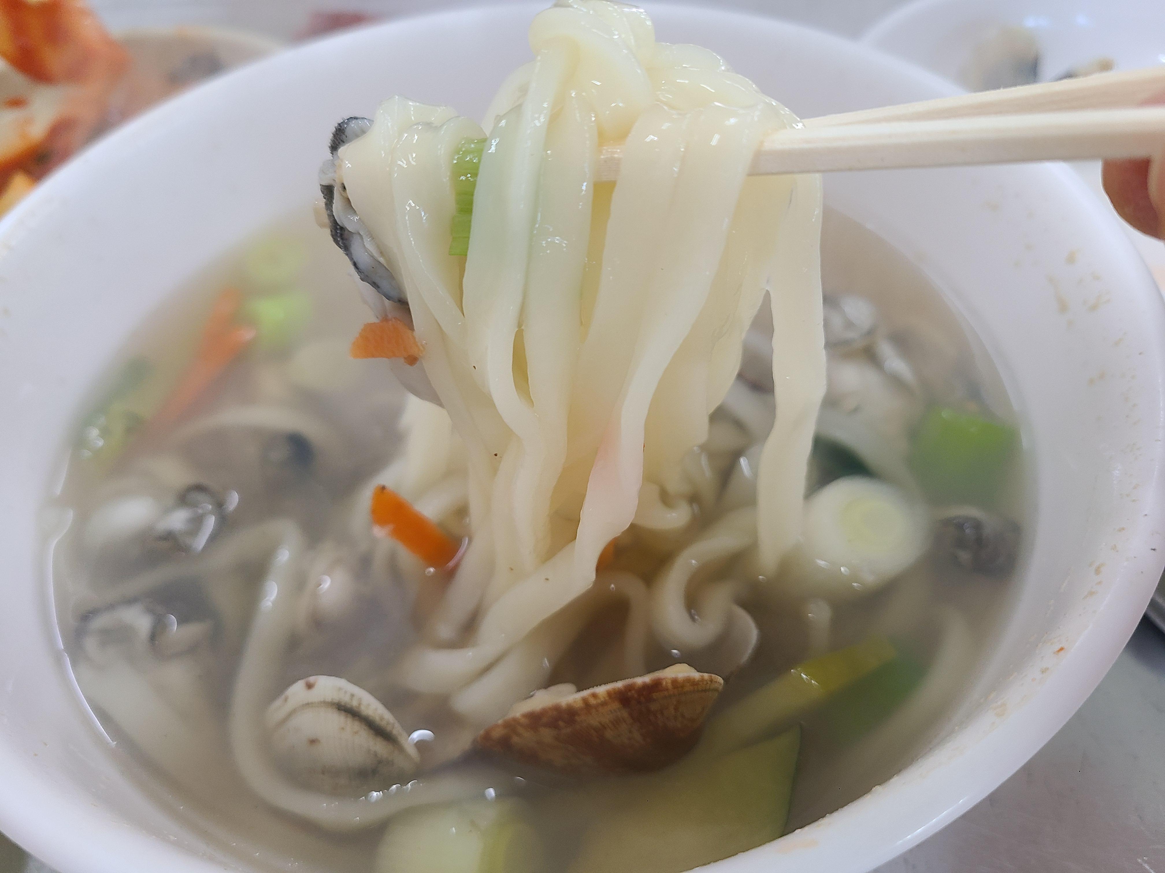 굴 칼국수 국물이 개운하면서도 매운 고추가 들어가 얼큰하다.