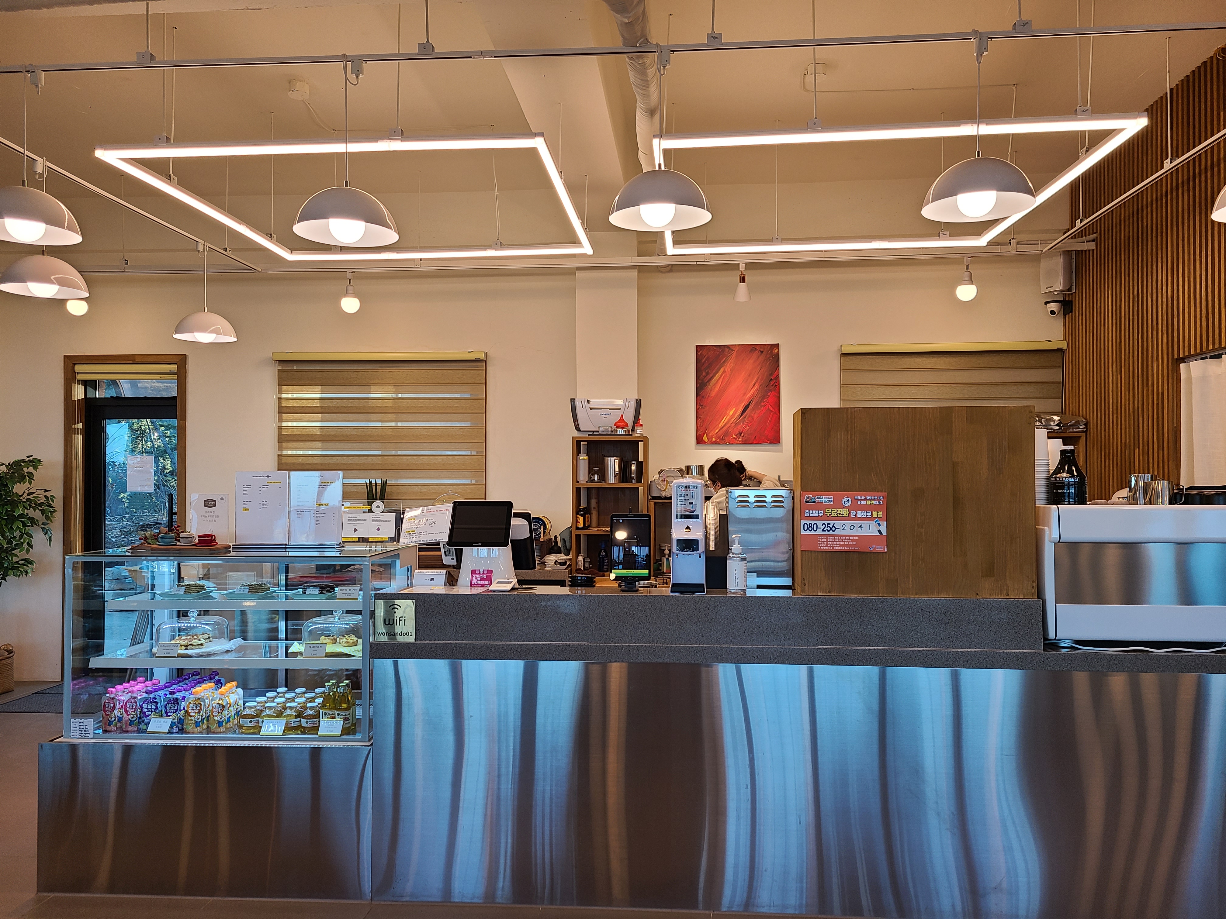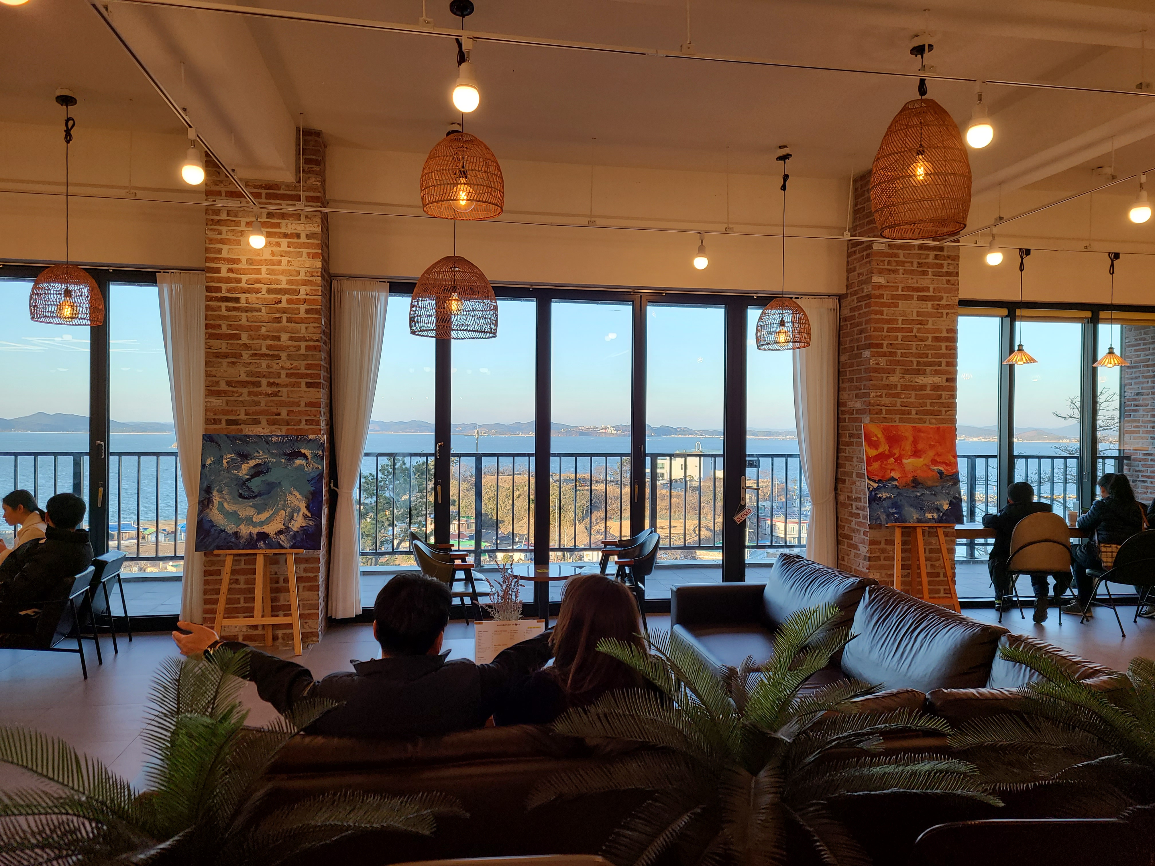 원산도 커피 2층 홀이 아주 널찍하다. 홀 내부에 그림이 많이 걸려있고 전체적인 분위기가 따뜻하다. 좌석 간 거리가 넓어 거리두기가 자연스럽게 되었고, 자리에서 편안히 바다 풍경을 즐길 수 있었다.