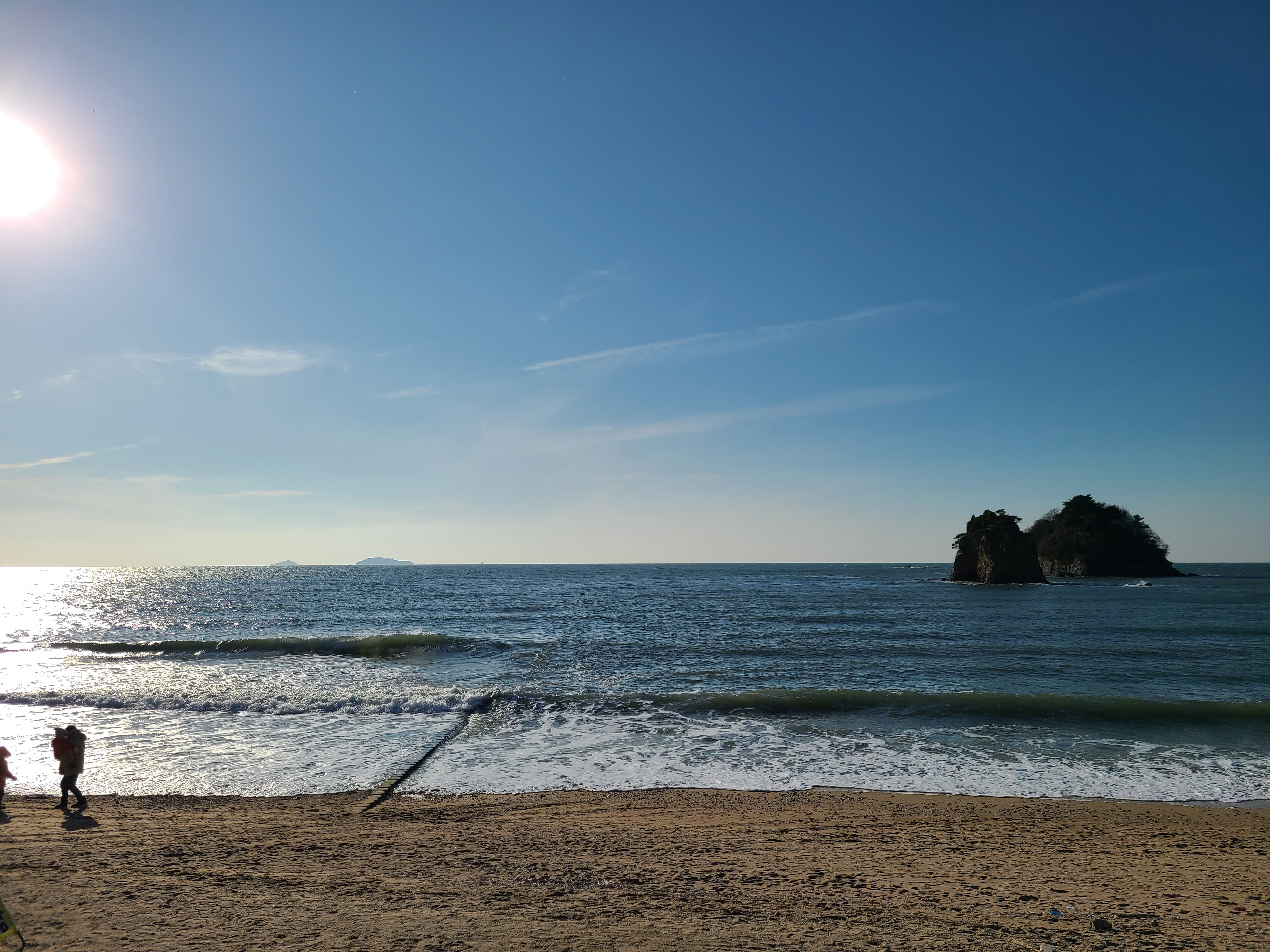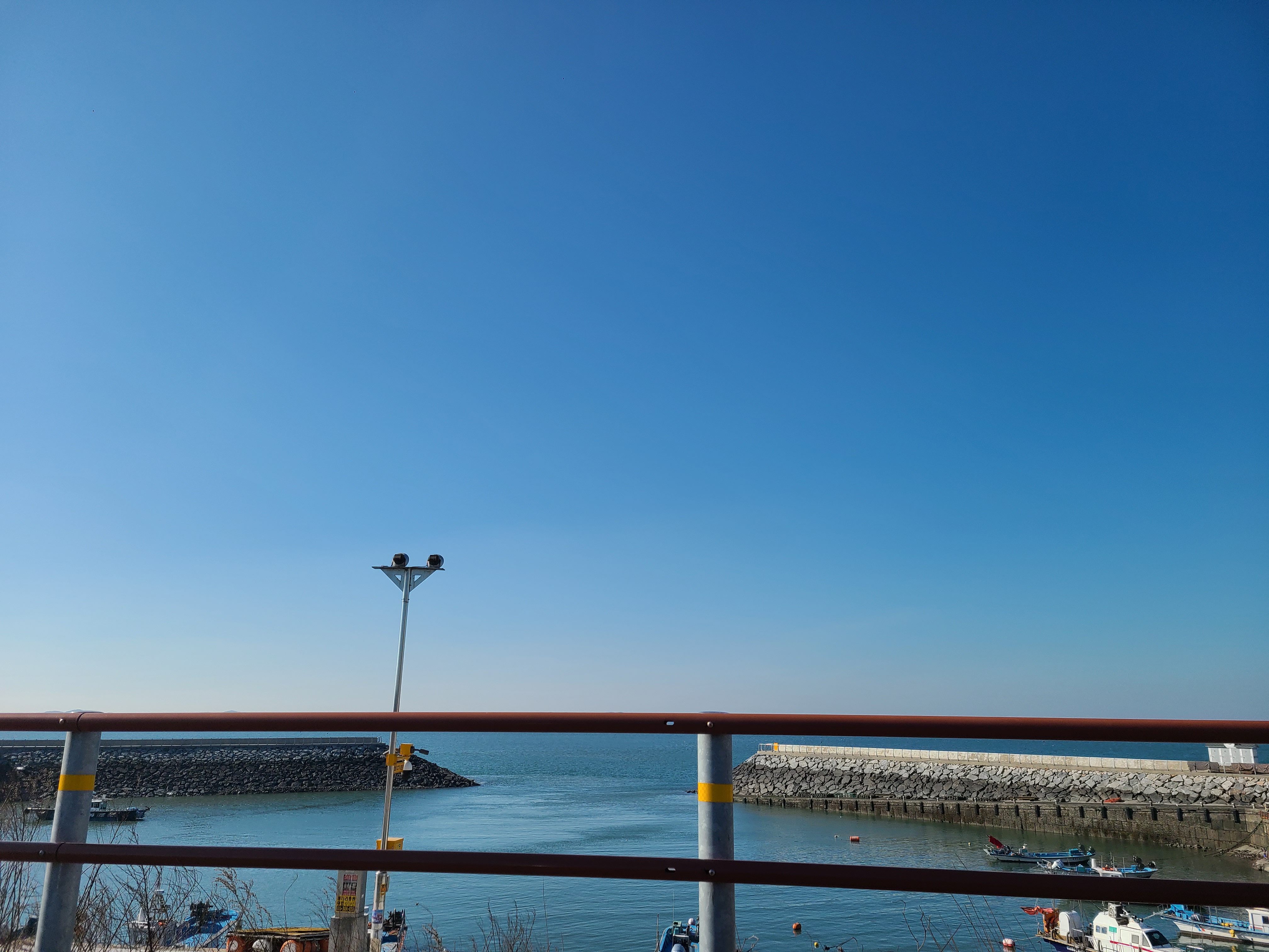 바닷물이 만조여서 할미바위와 할아버지바위 가까이에는 갈 수가 없다. 날씨가 맑아 하늘도 바다도 예쁜데 바람이 세게 불어 추웠다.