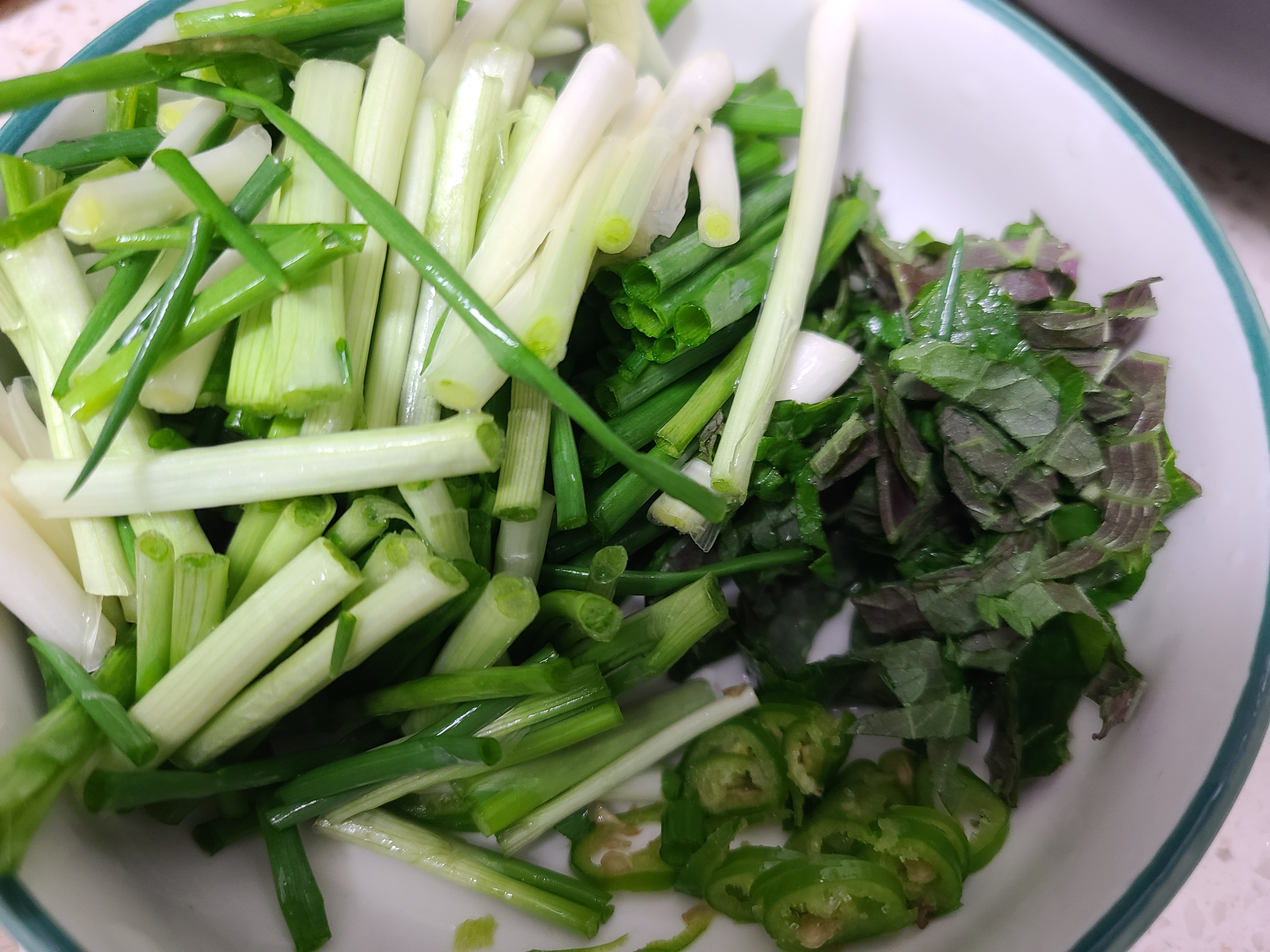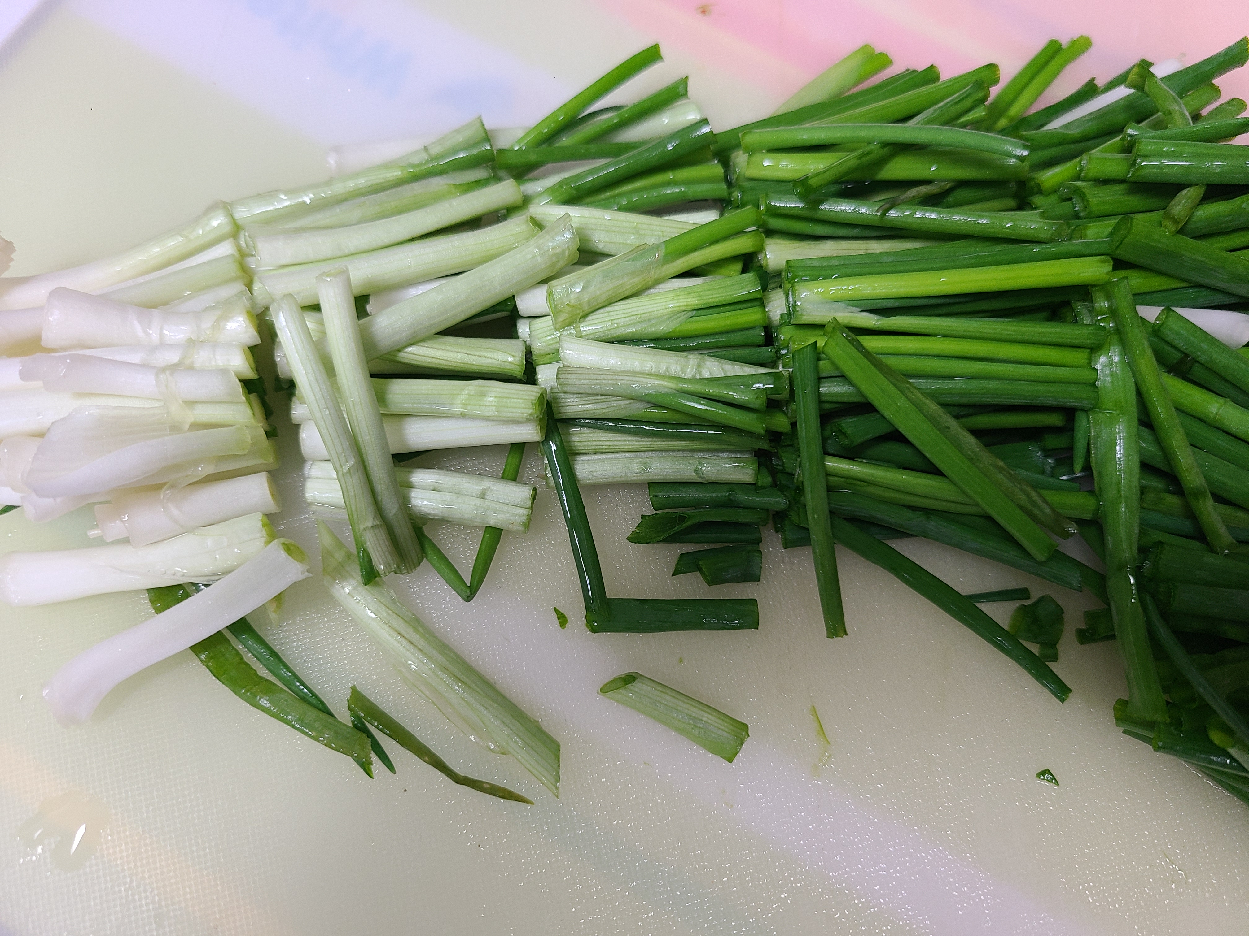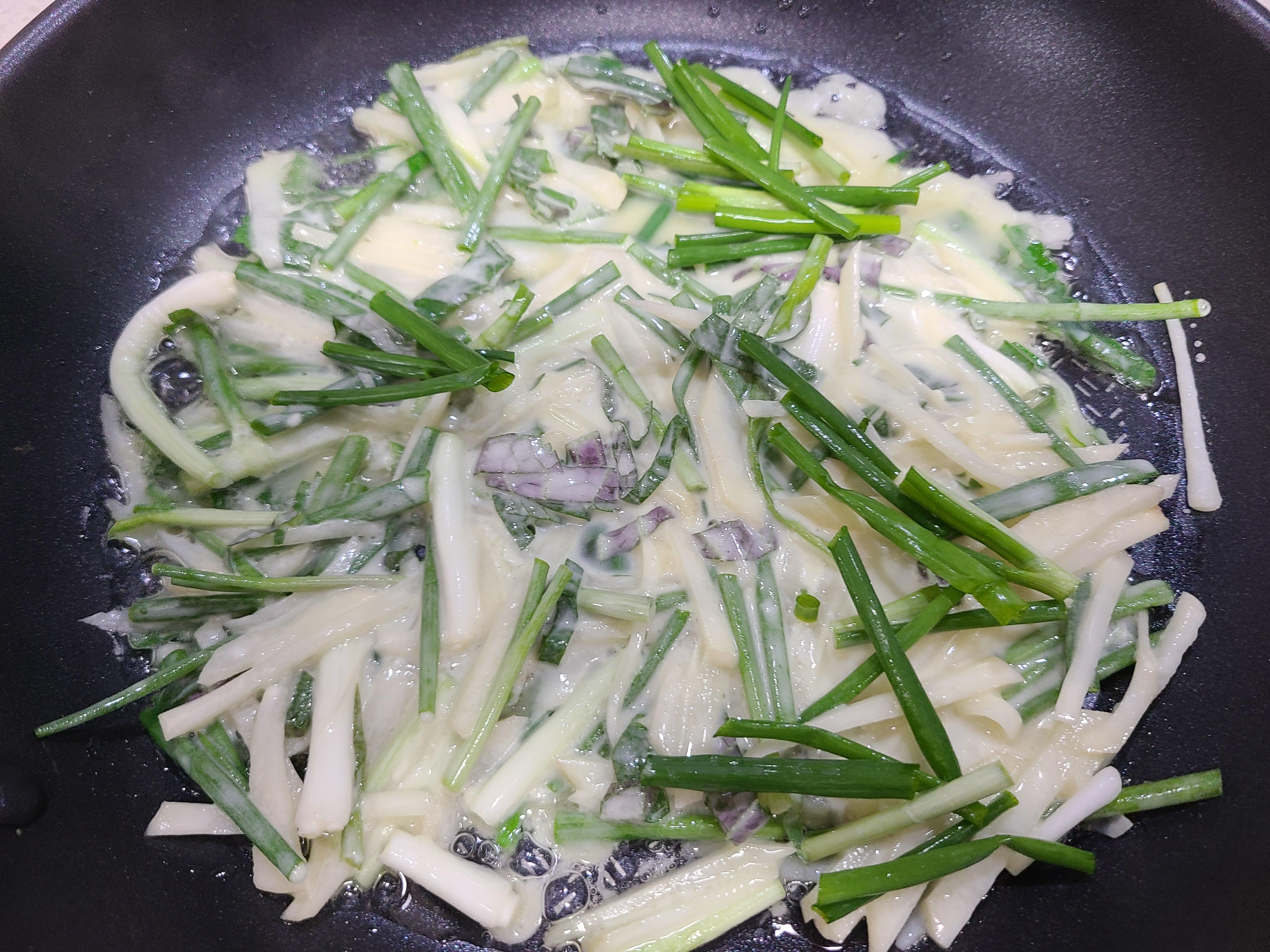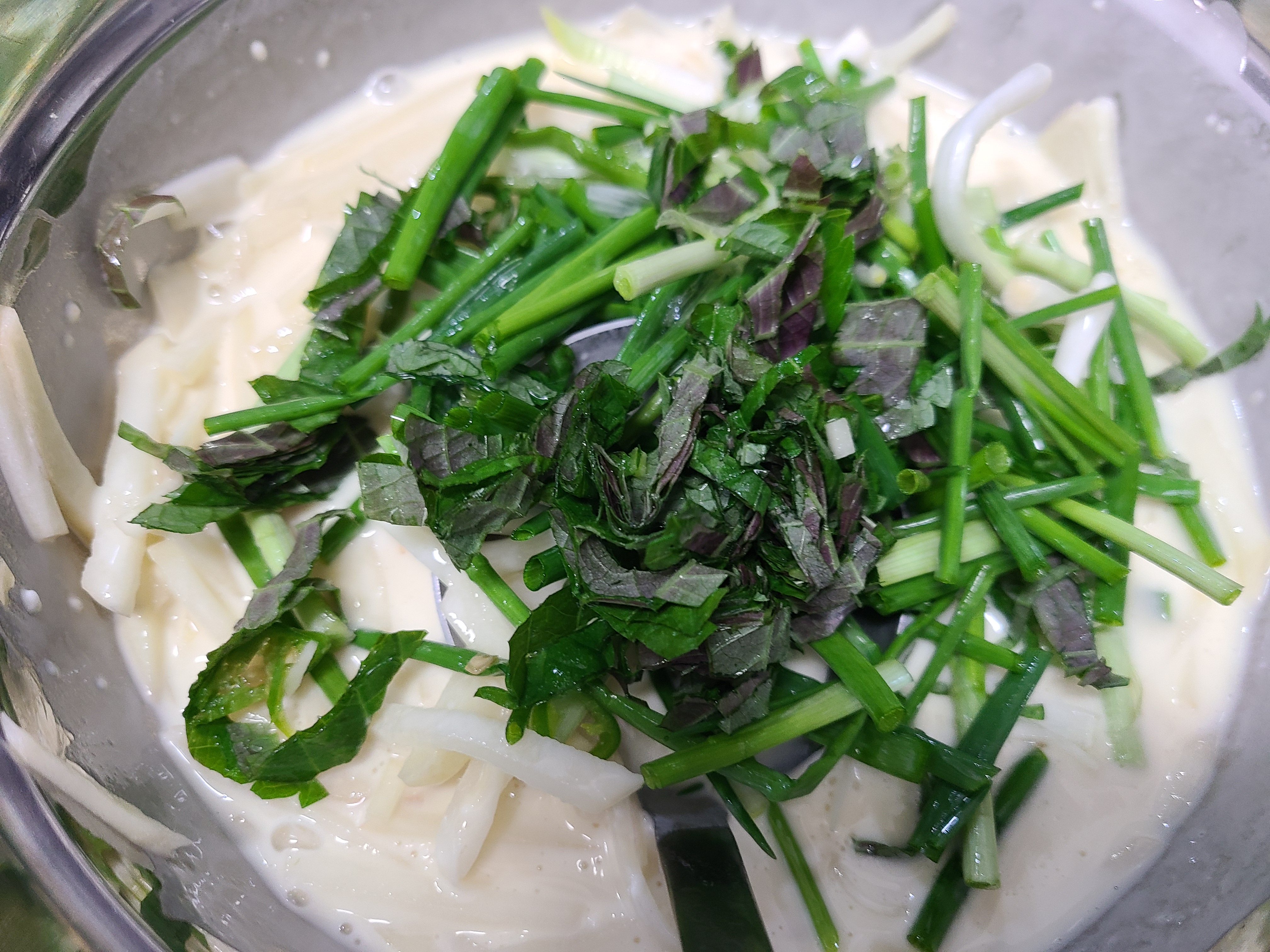 1. 감자 작은 것 2개를 채를 썰고 쪽파 한 줌을 4cm 길이로 썰어준다. 깻잎 4장과 청양고추 한 개를 썰어준다.