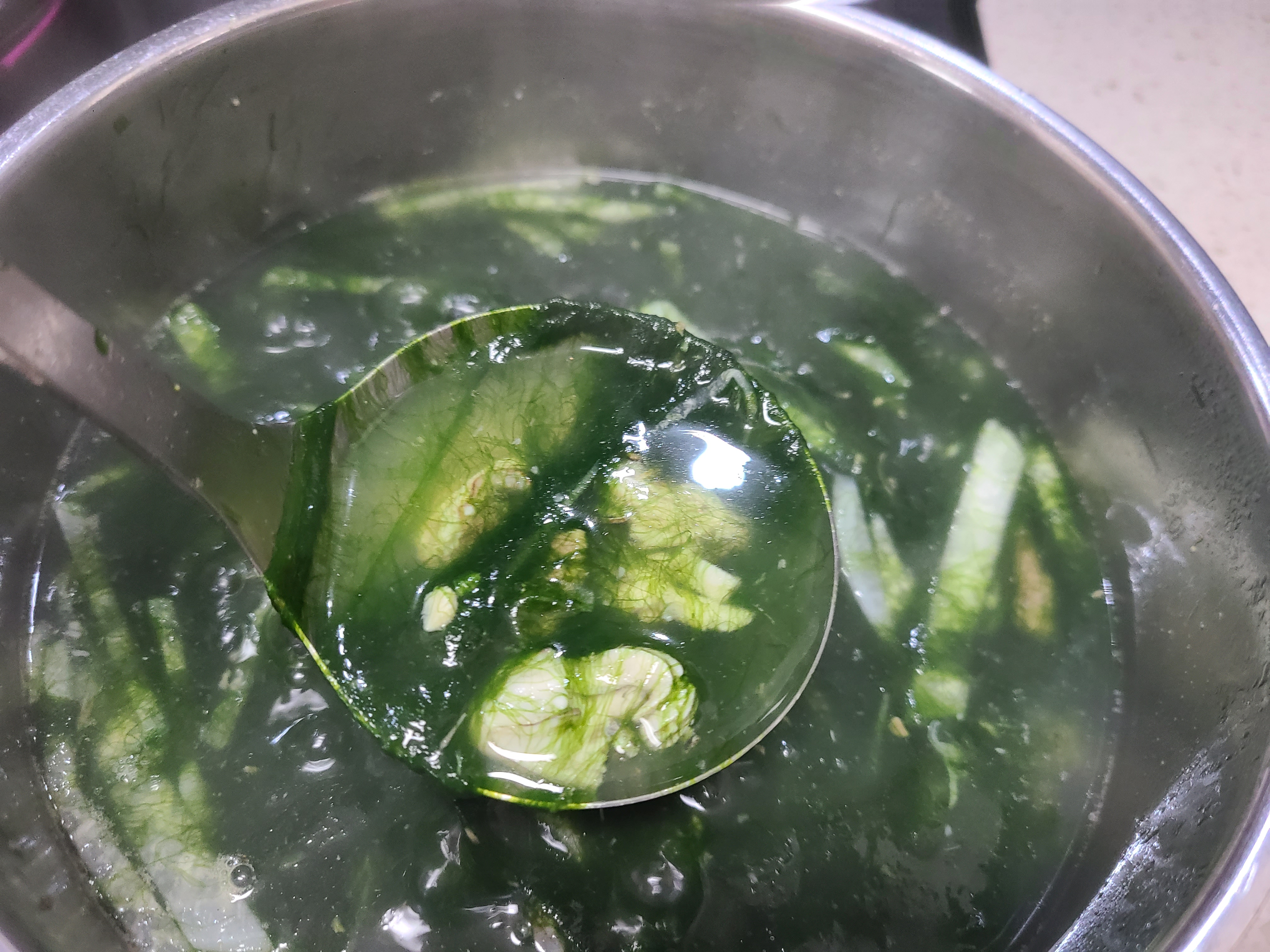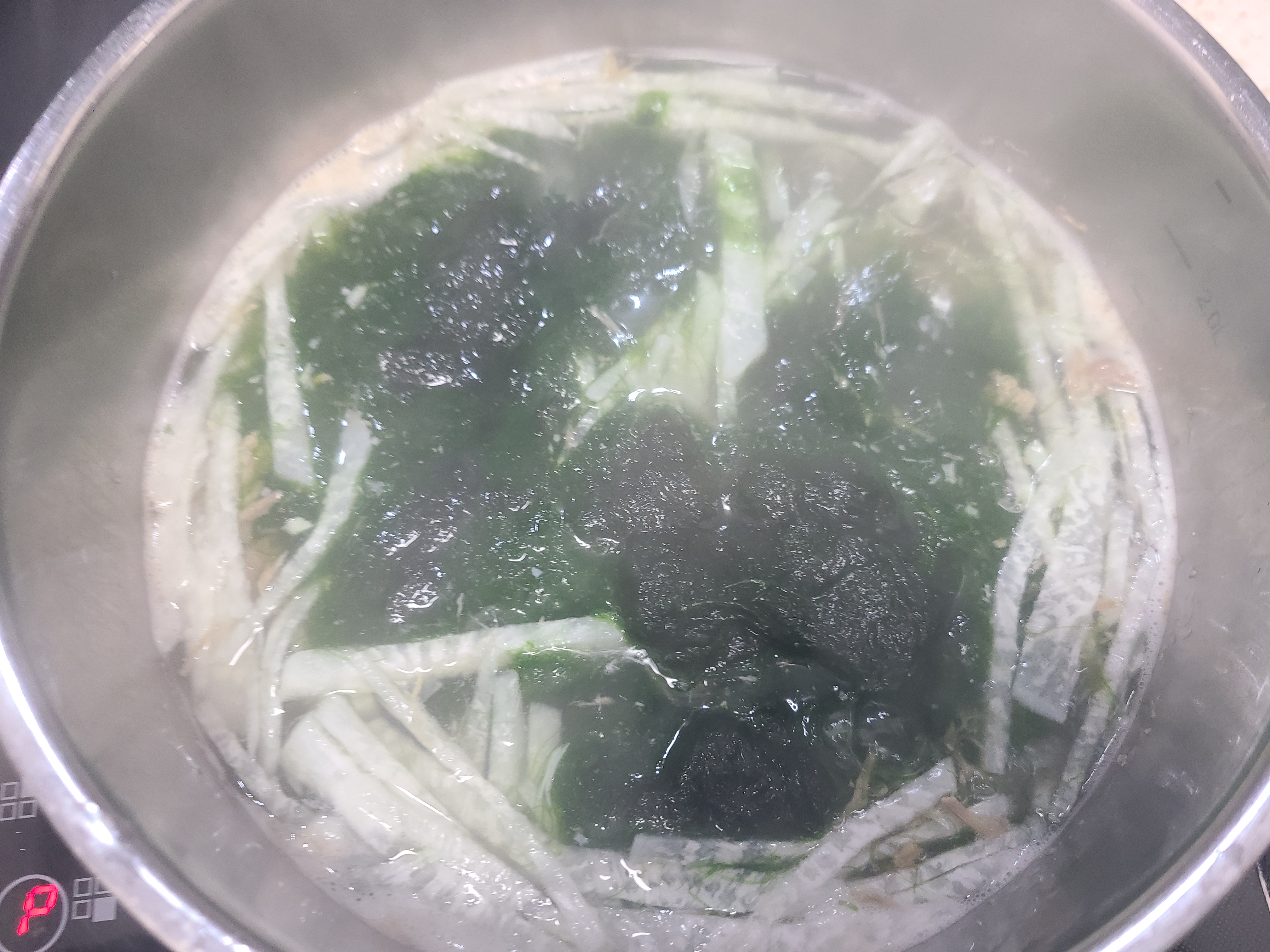 3. 쇠고기 육수가 팔팔 끓으면 채친 무를 넣고, 매생이는 칼로 듬성듬성 3~4번 썰어준 후 넣어준다. 쇠고기 육수에 다진 마늘을 미리 넣고 끓였다.