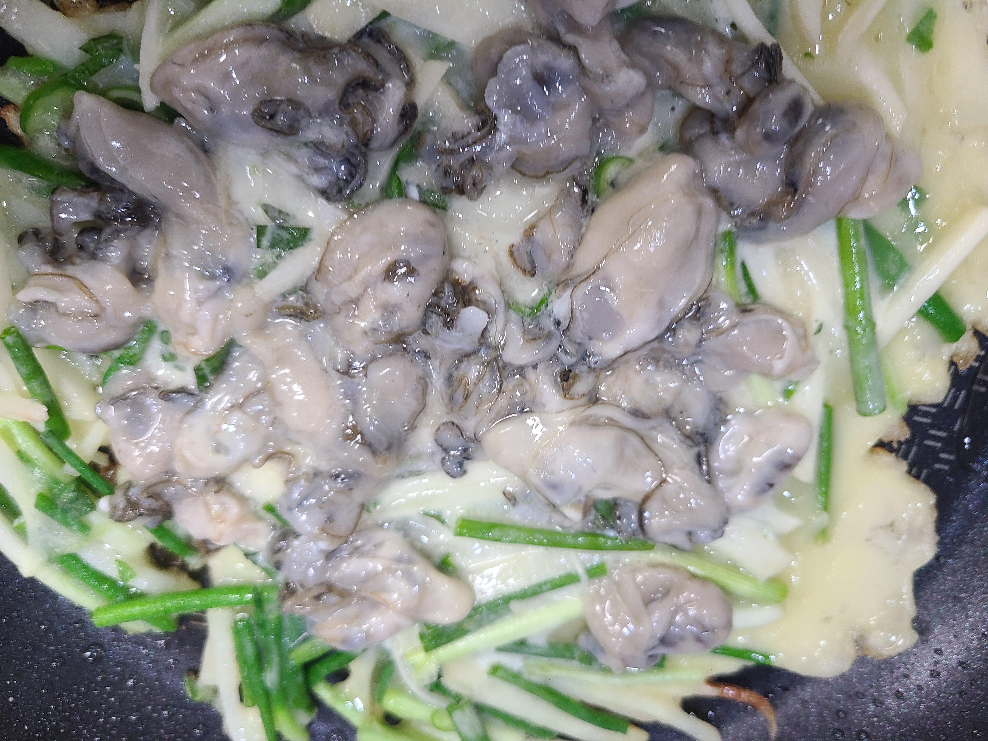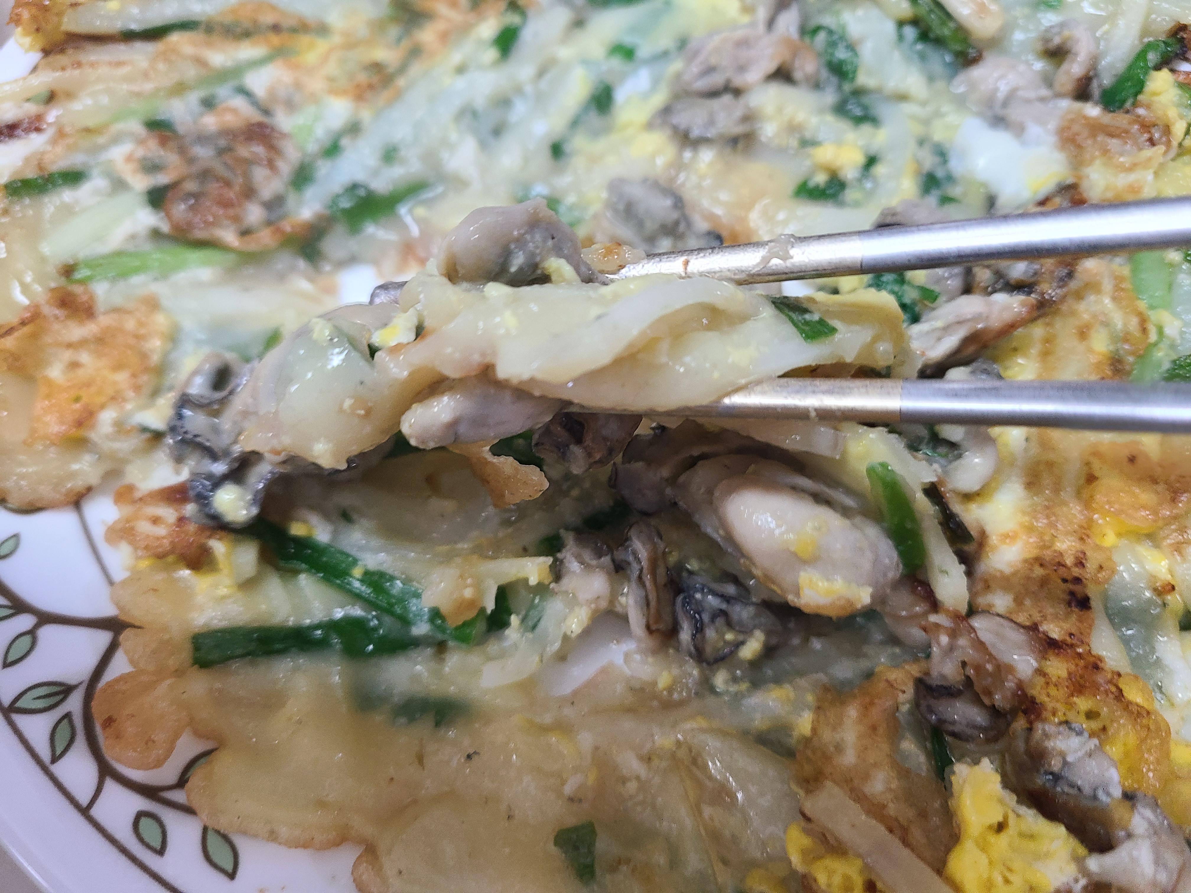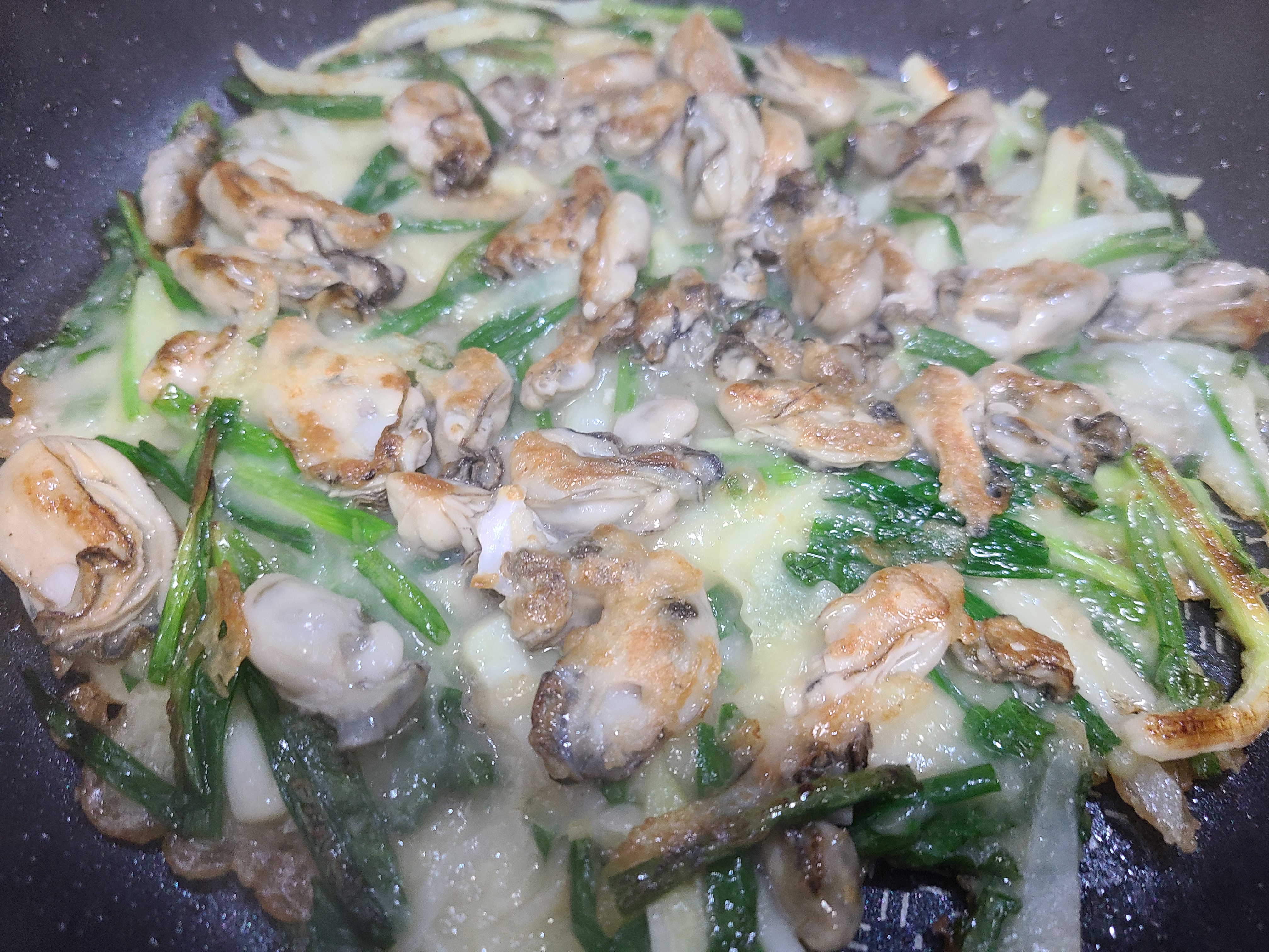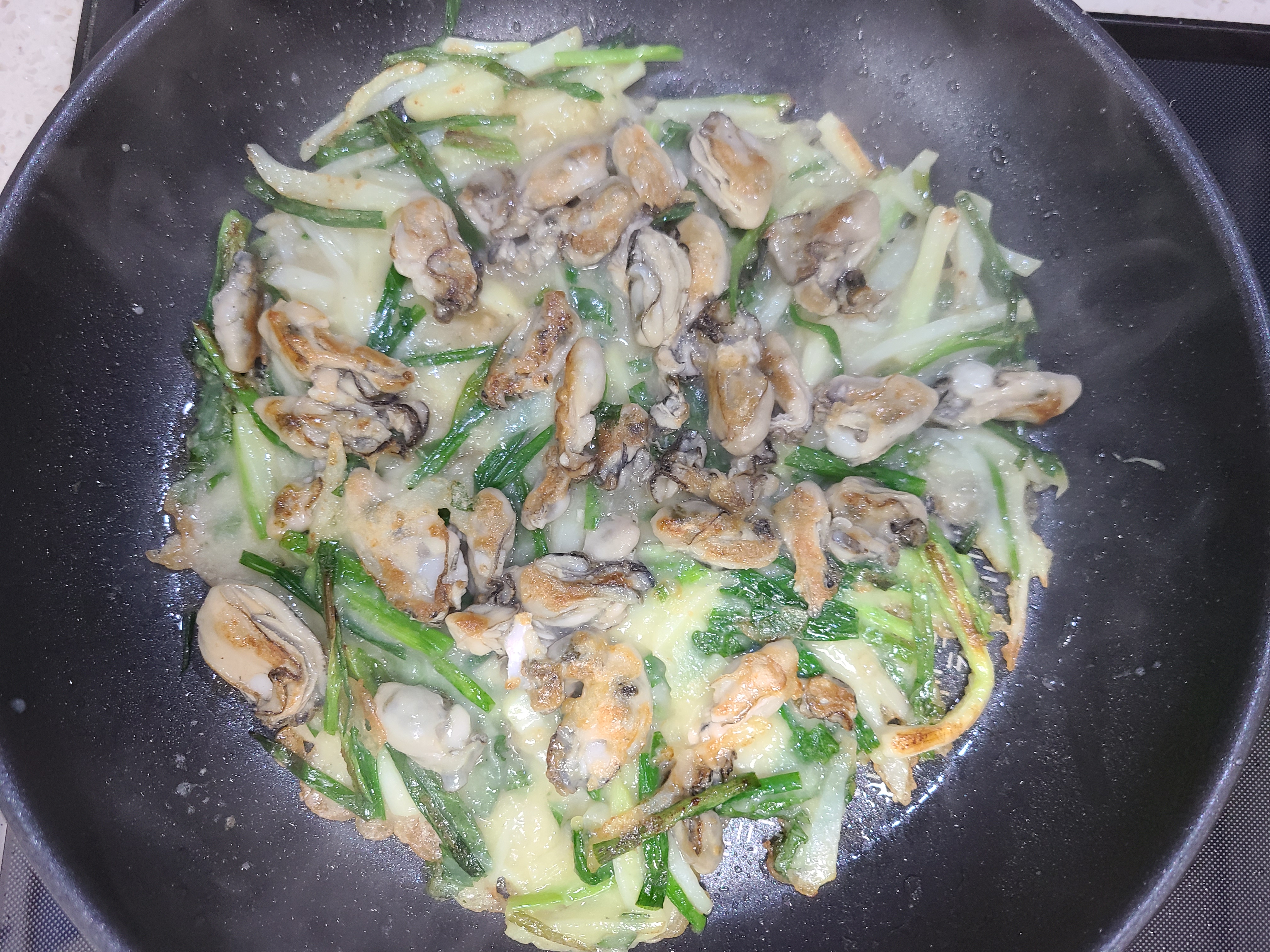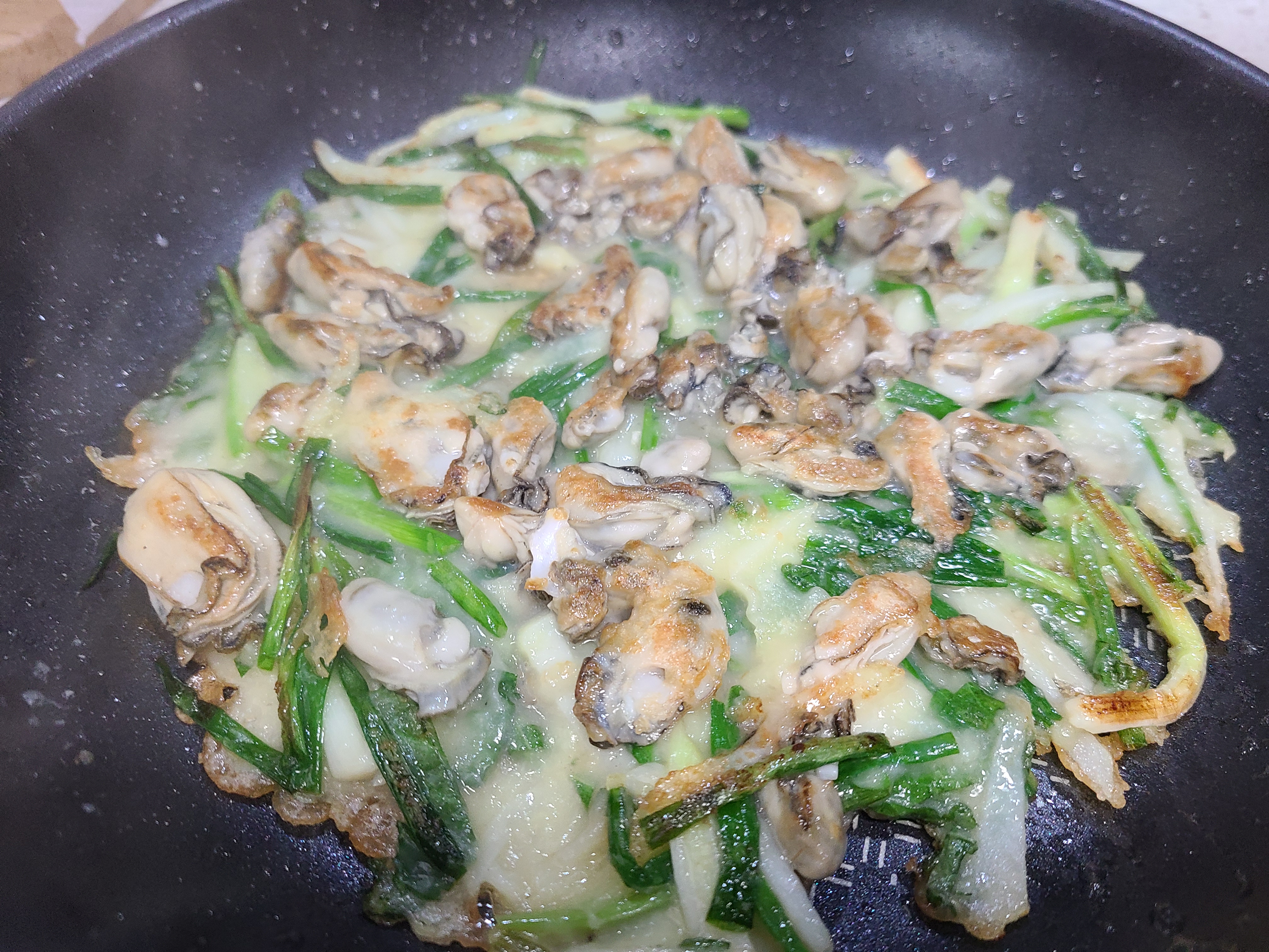 두 번째 만든 굴전에는 굴 위에 계란을 하나 풀어서 얹어 보았는데 개인적으로는 계란을 얹지 않은 게 더 맛있는 것 같다.