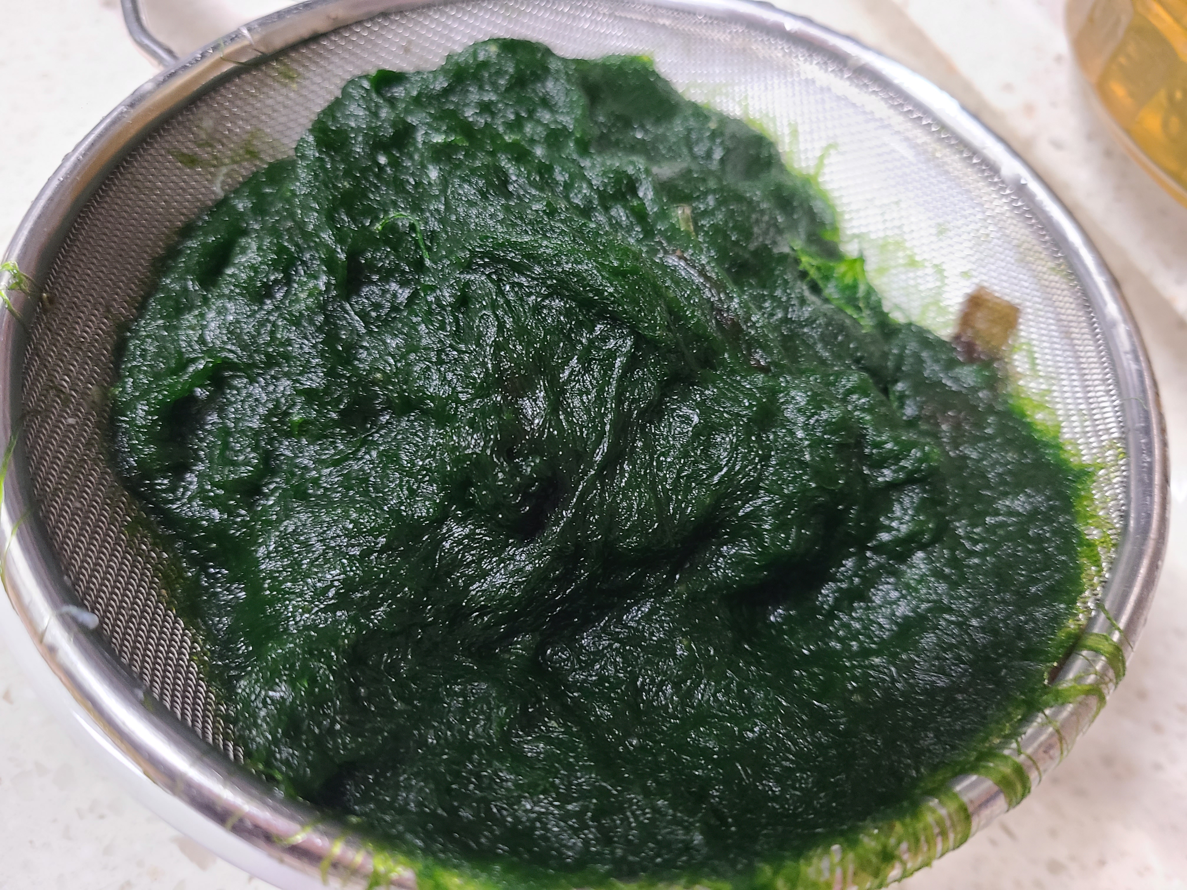 2. 물을 채워 담은 후 매생이를 조금씩 잡아 살살 흔들어 주며 체에 옮겨 담는다.