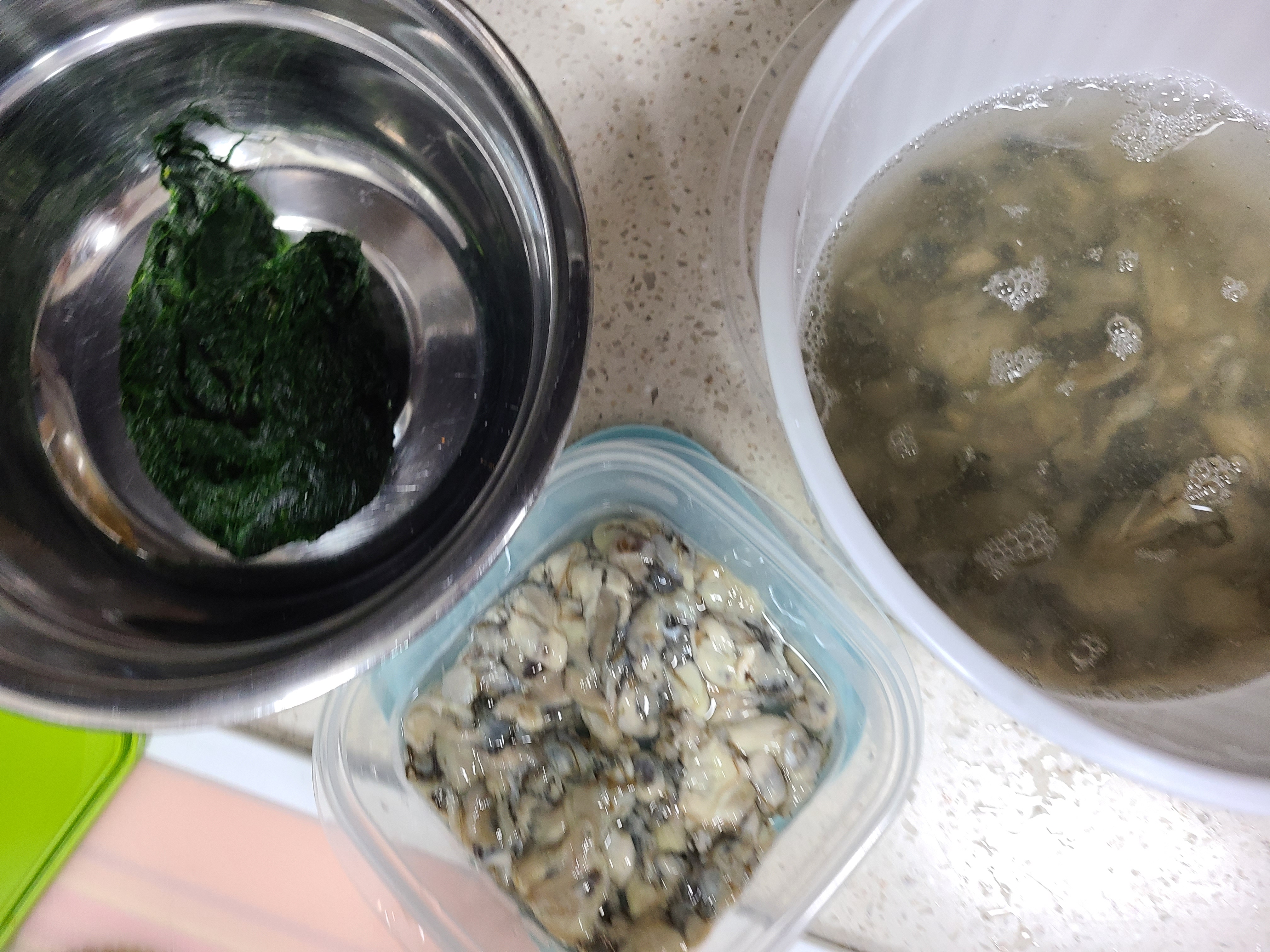 굴과 매생이가 도착하자, 굴을 세척해서 일부는 한번 먹을 양씩 나눠서 찬통에 담고 매생이는 세척하지 않고 1 제기를 반씩 나누어 바로 먹을 것만 남기고 굴과 매생이를 냉동실에 얼렸다.