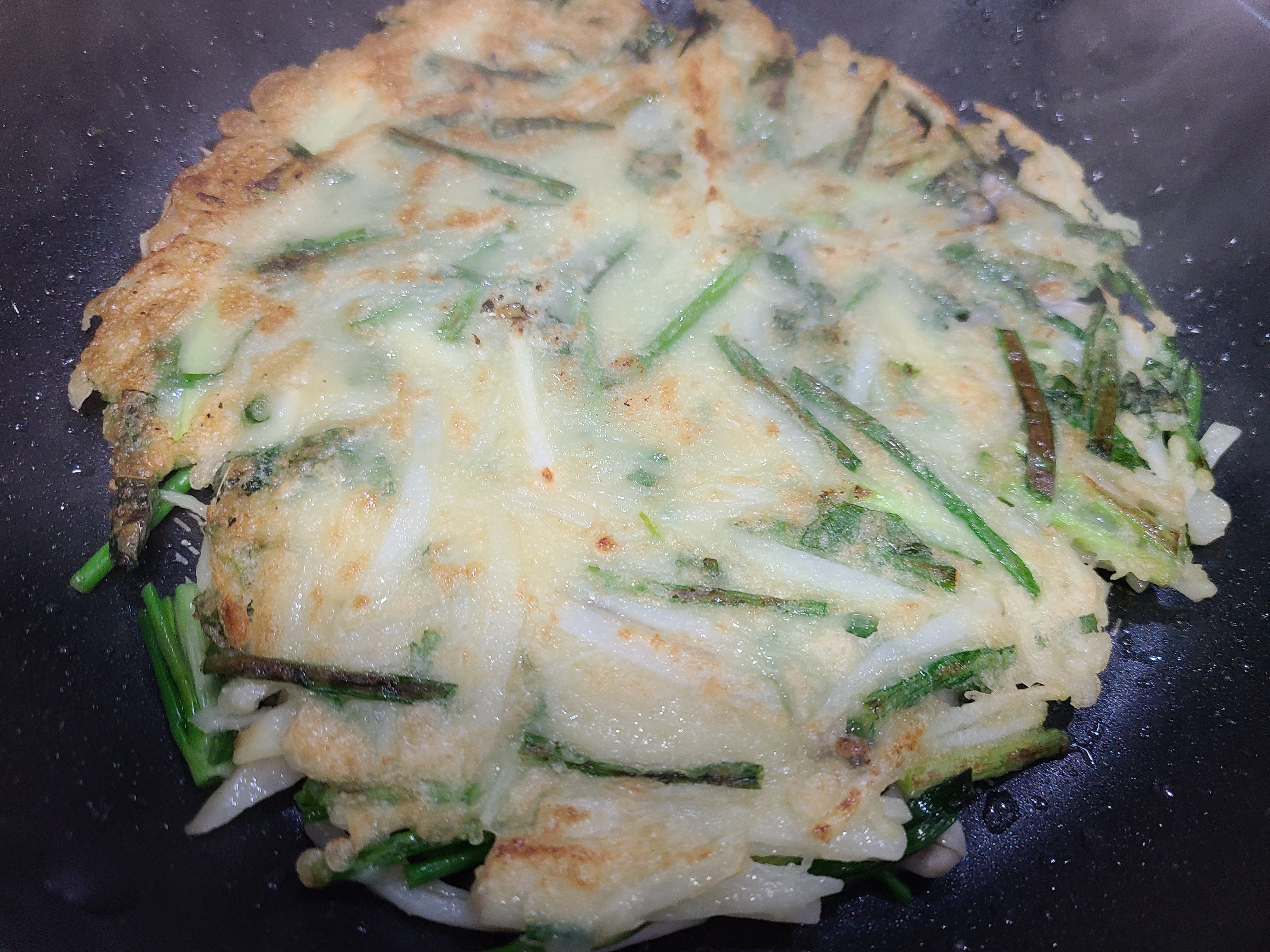 3. 부침개 가장자리가 노릇하게 구워지는 것이 보이면 뒤집어 준다. 보통 3분 정도면 바닥이 이렇게 노릇하게 구워진다.