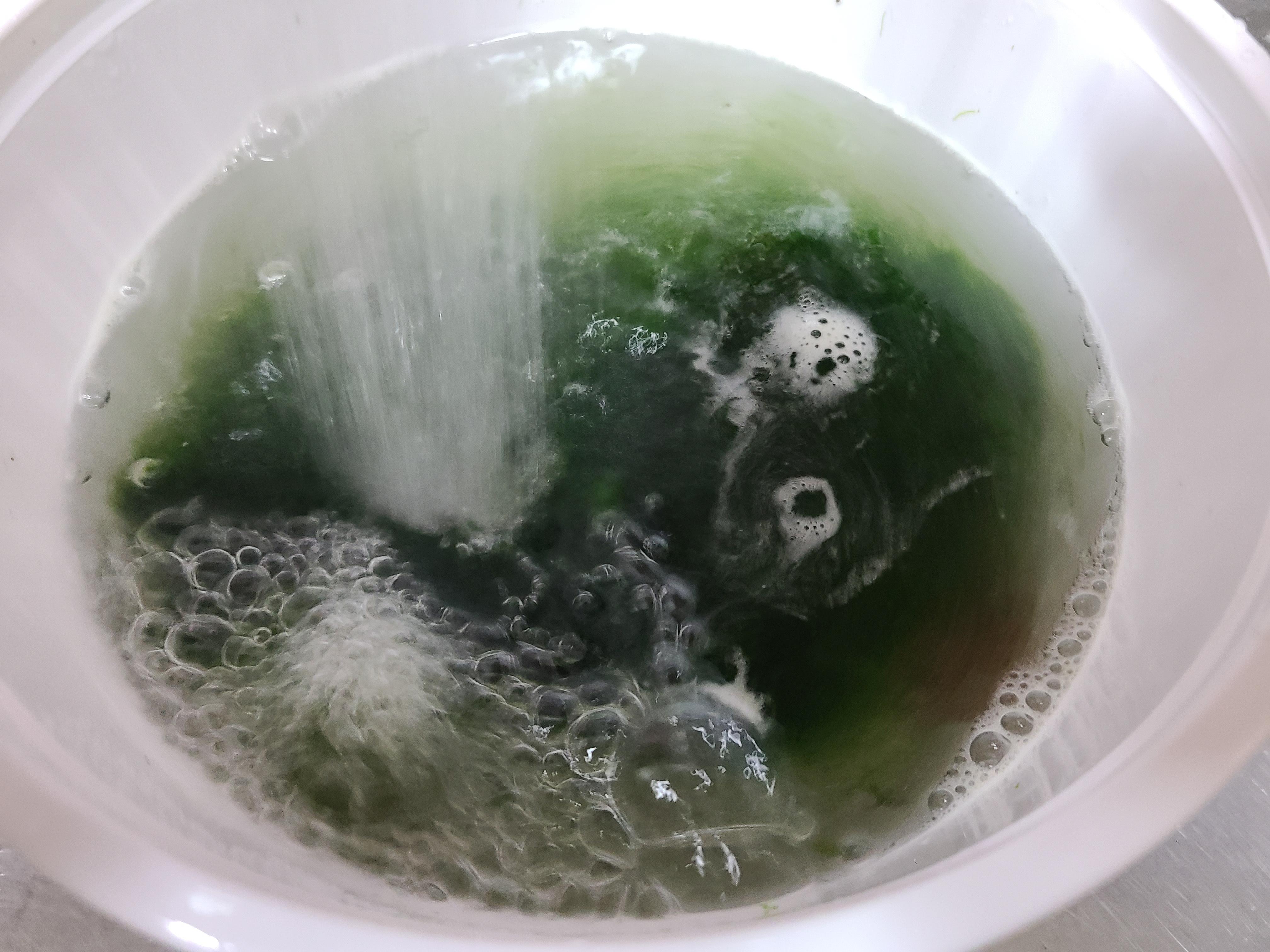 1. 매생이를 소금을 풀어놓은 물에 담가 손으로 조물조물 주물러 준다.