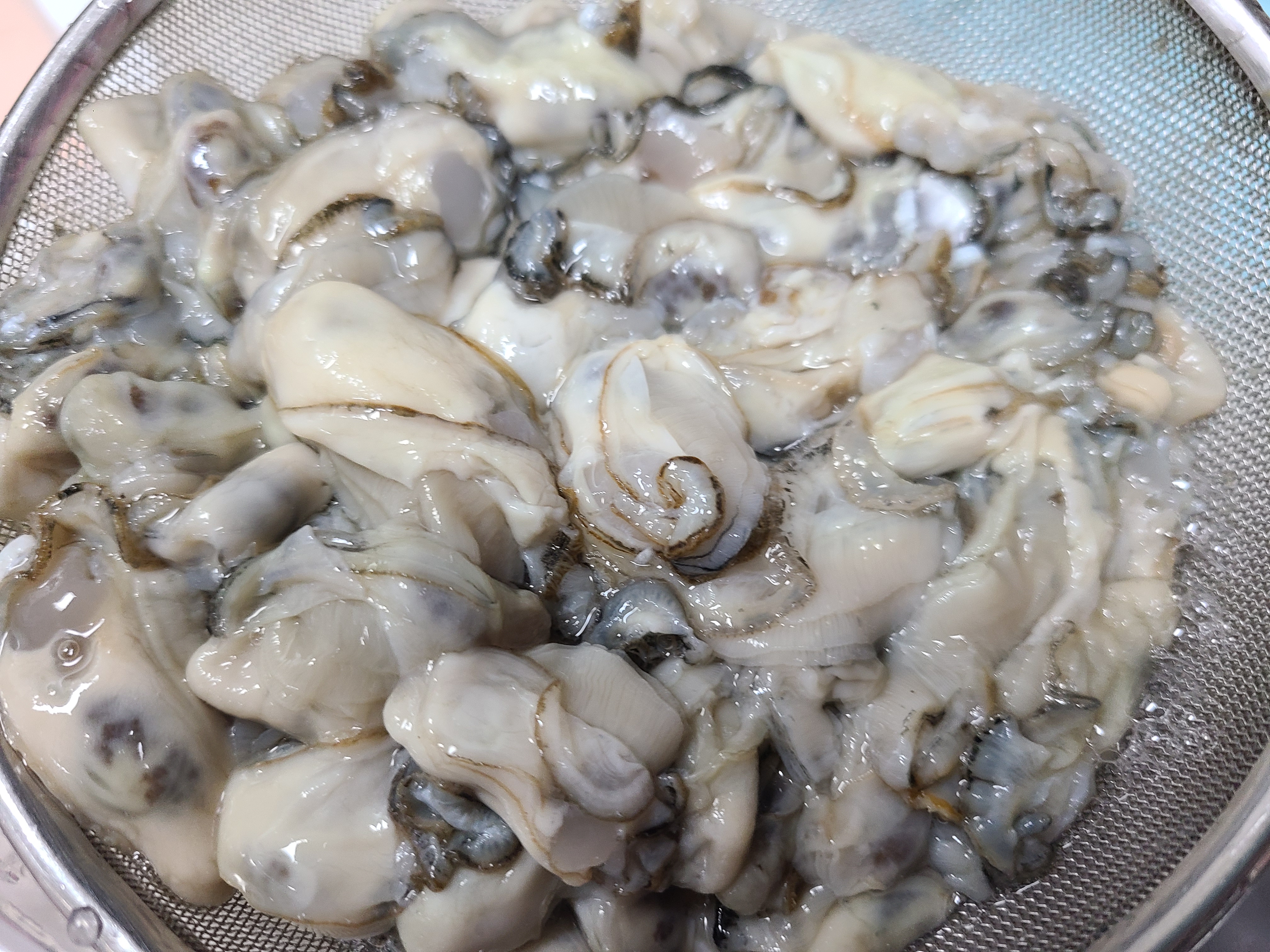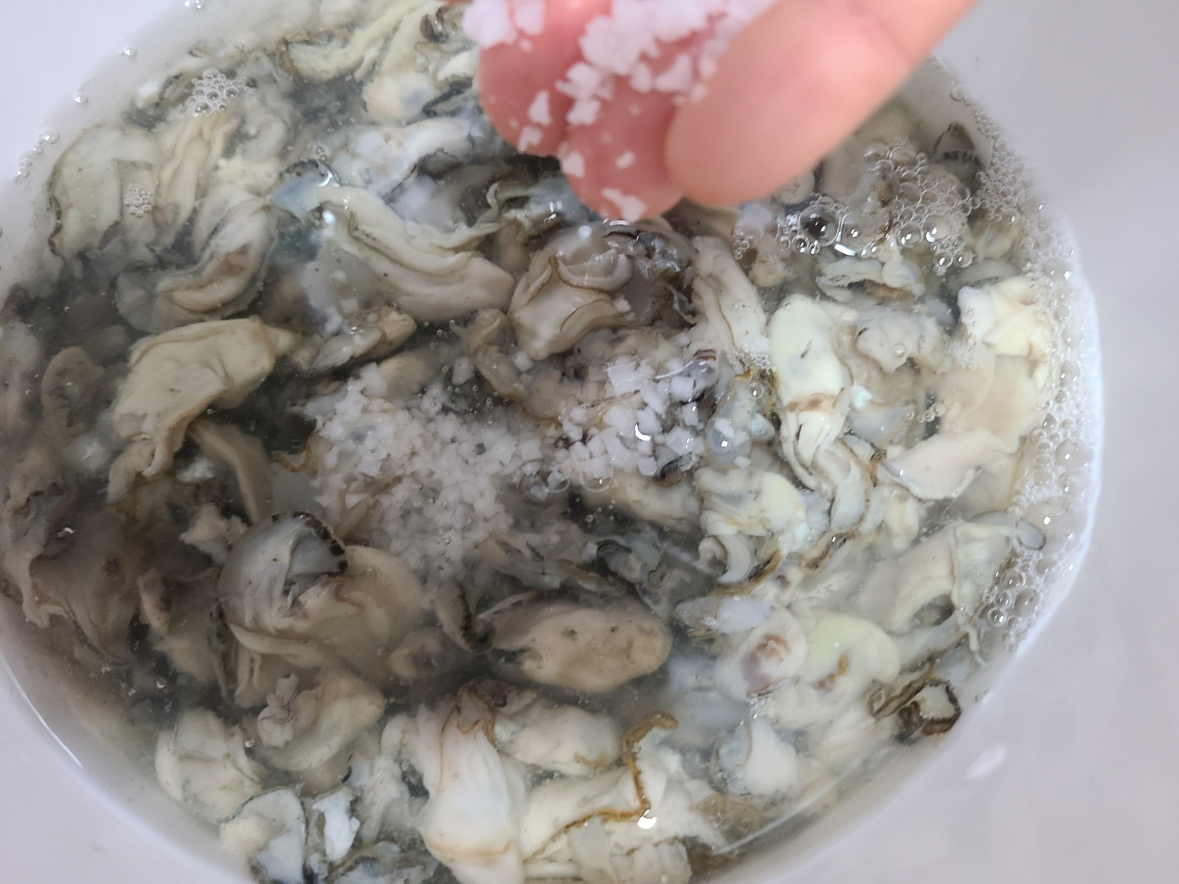 1. 굴은 천일염 1큰술을 넣고 손으로 살살 저어 준후 체에 옮겨 담는다.