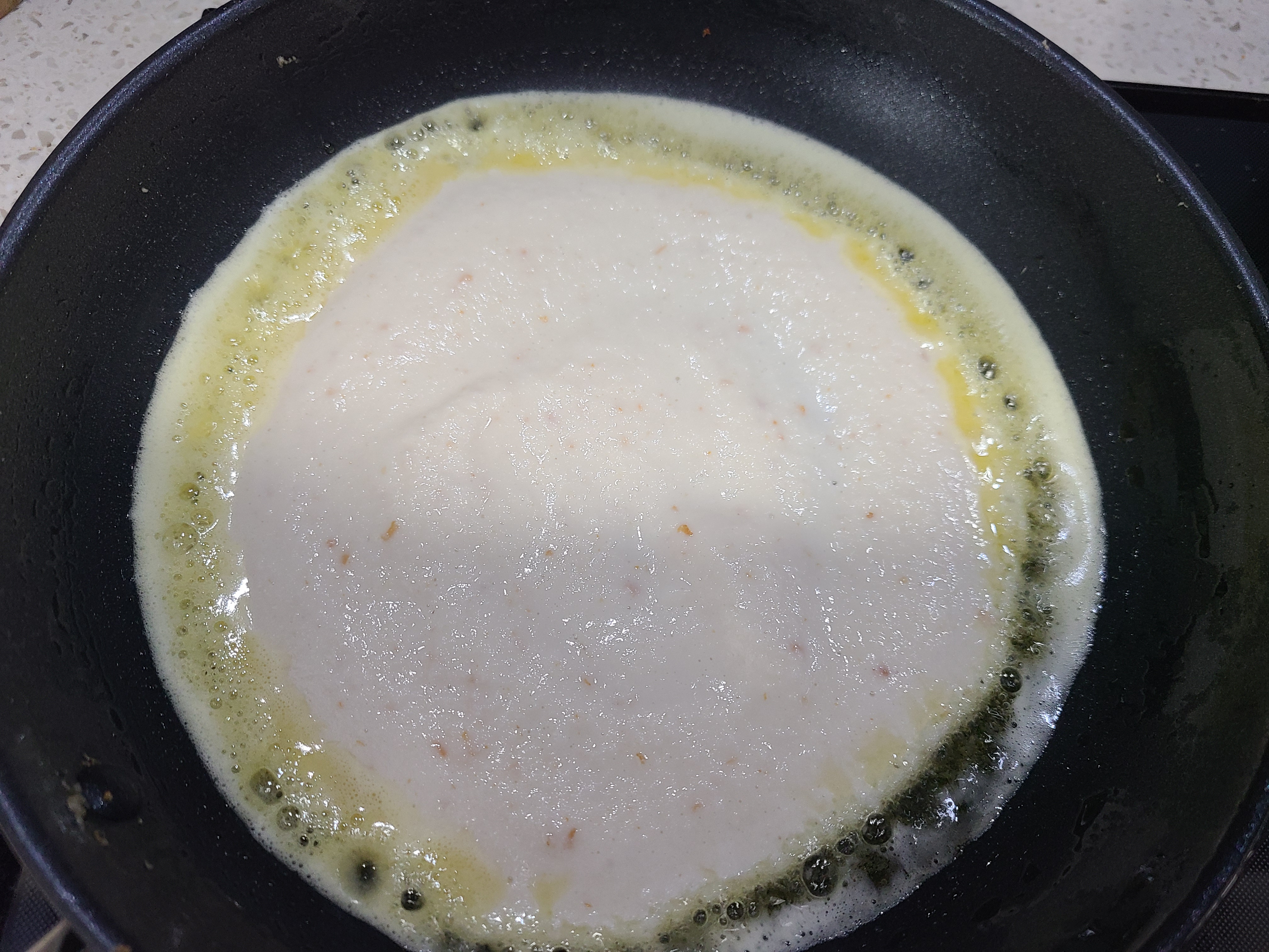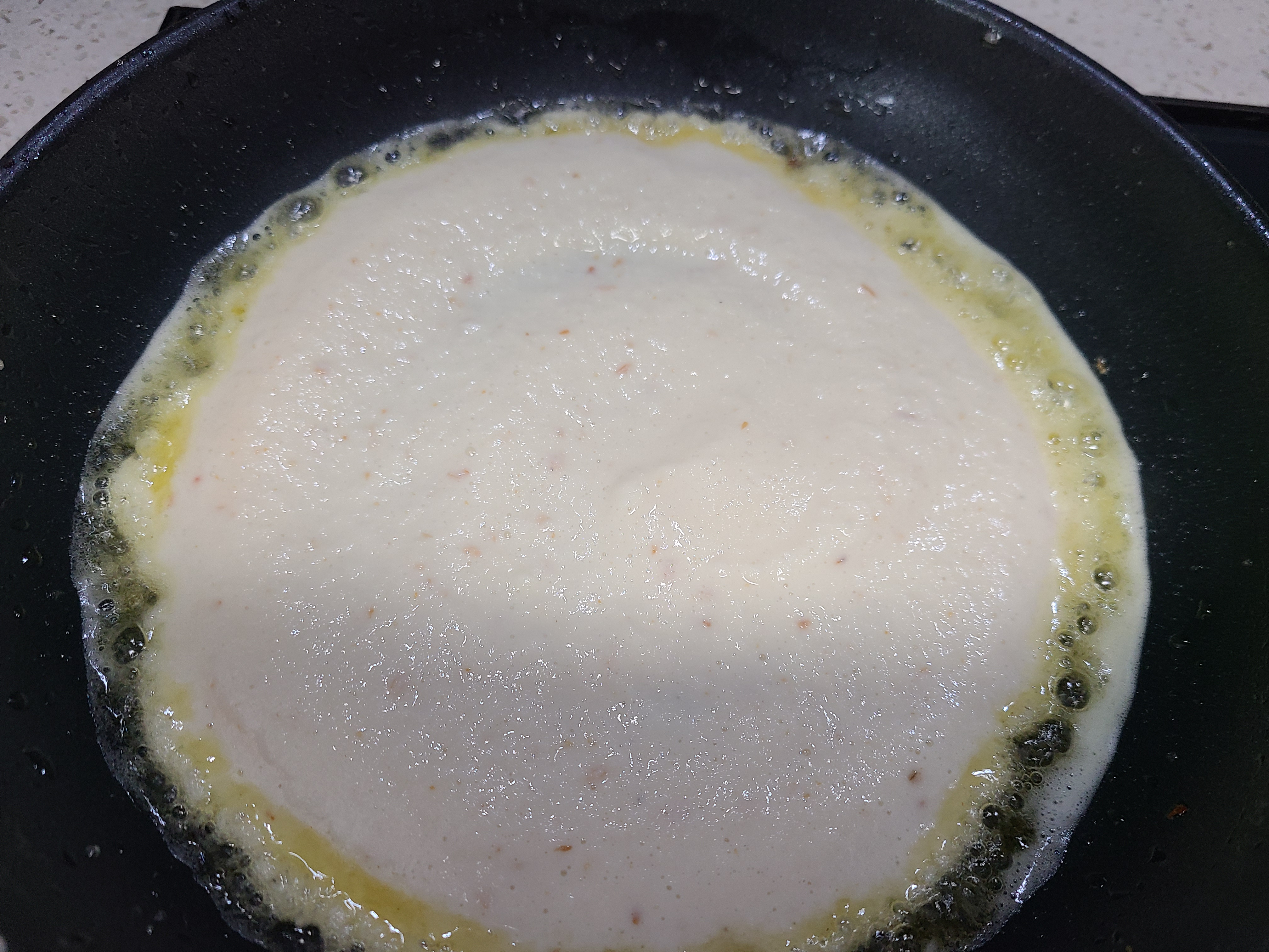 2. 프라이팬에 믹서기에 갈아놓은 동부 반죽을 한국자 부어준 후 동그랗게 펴준다,