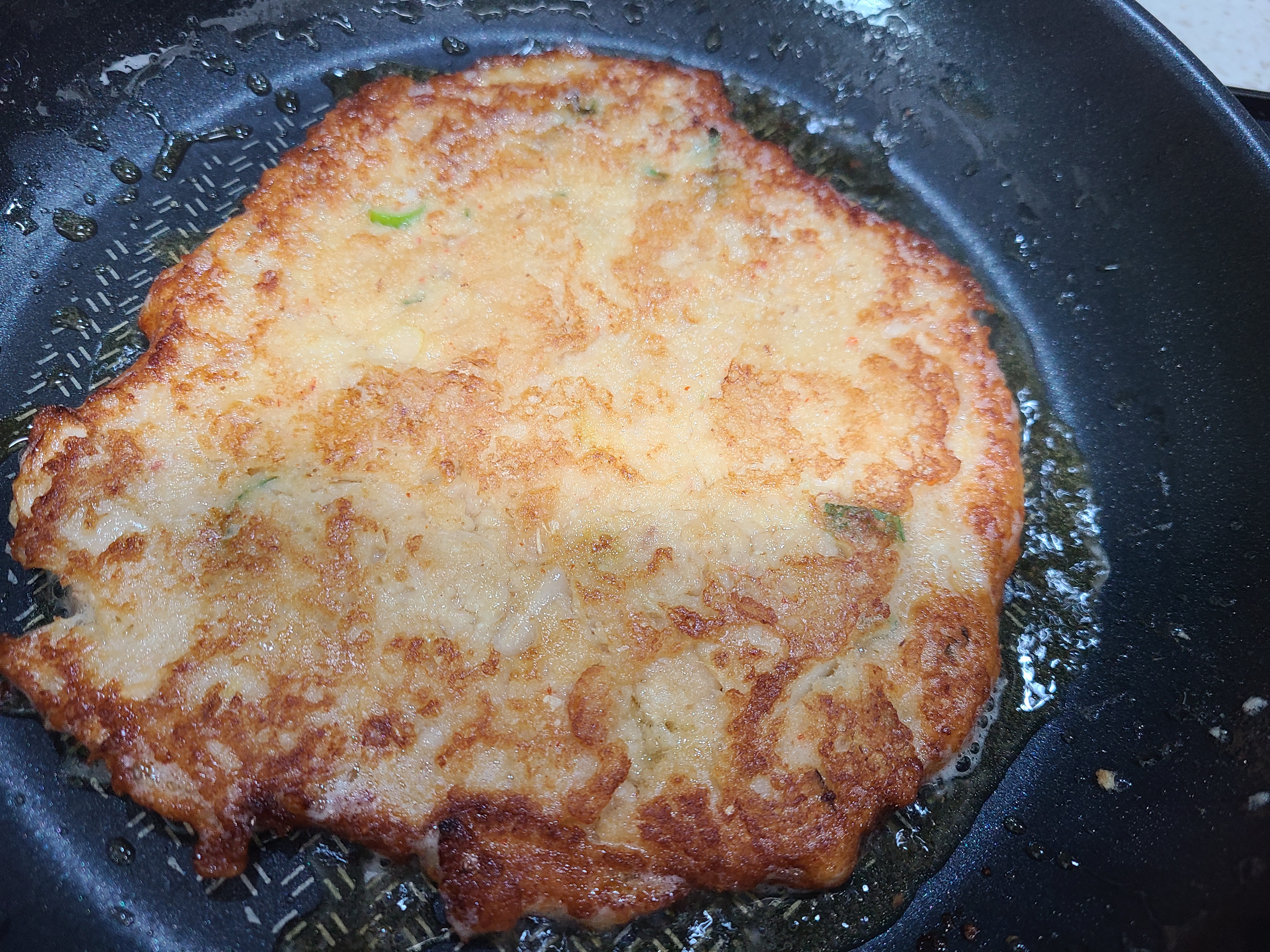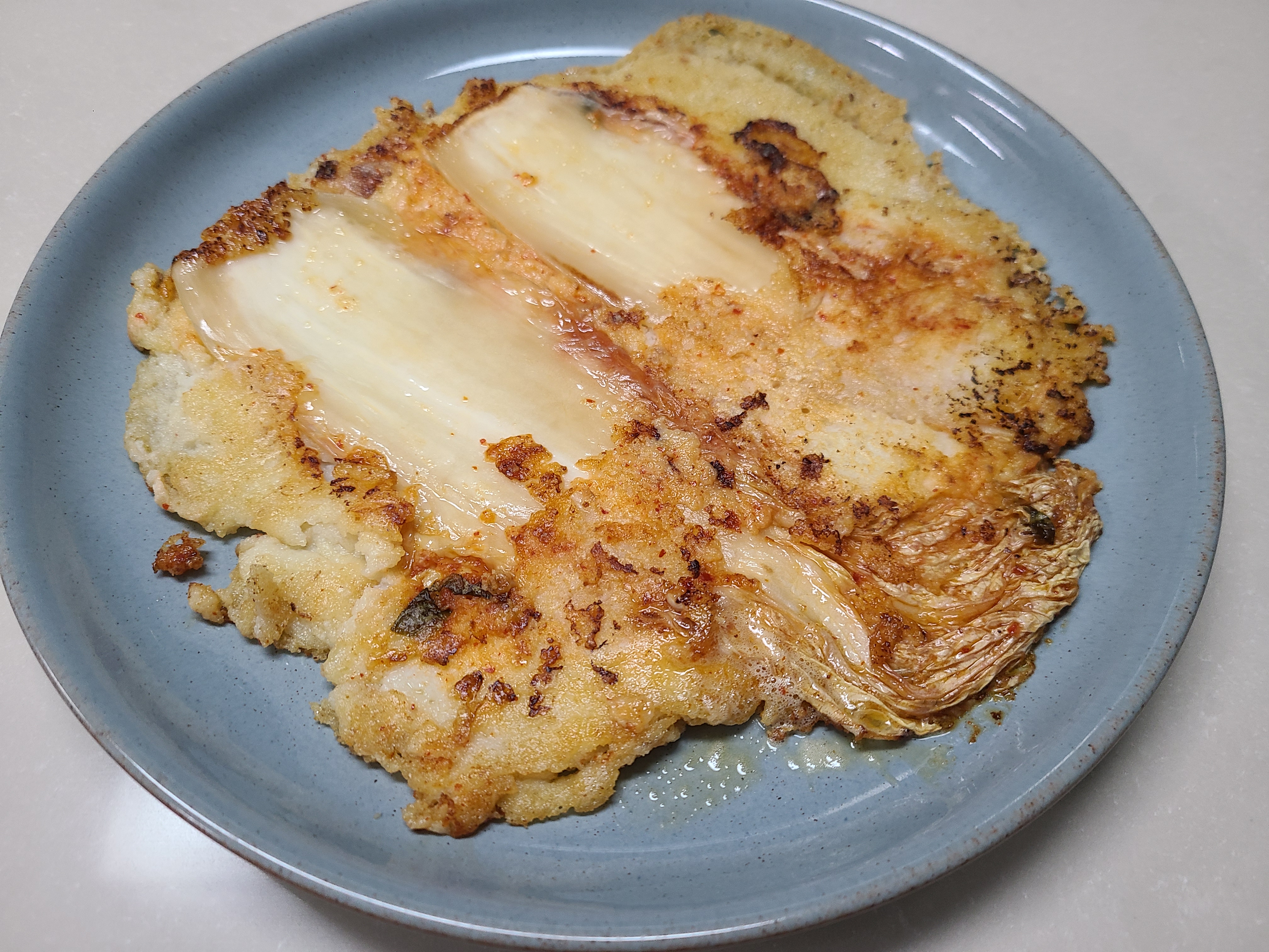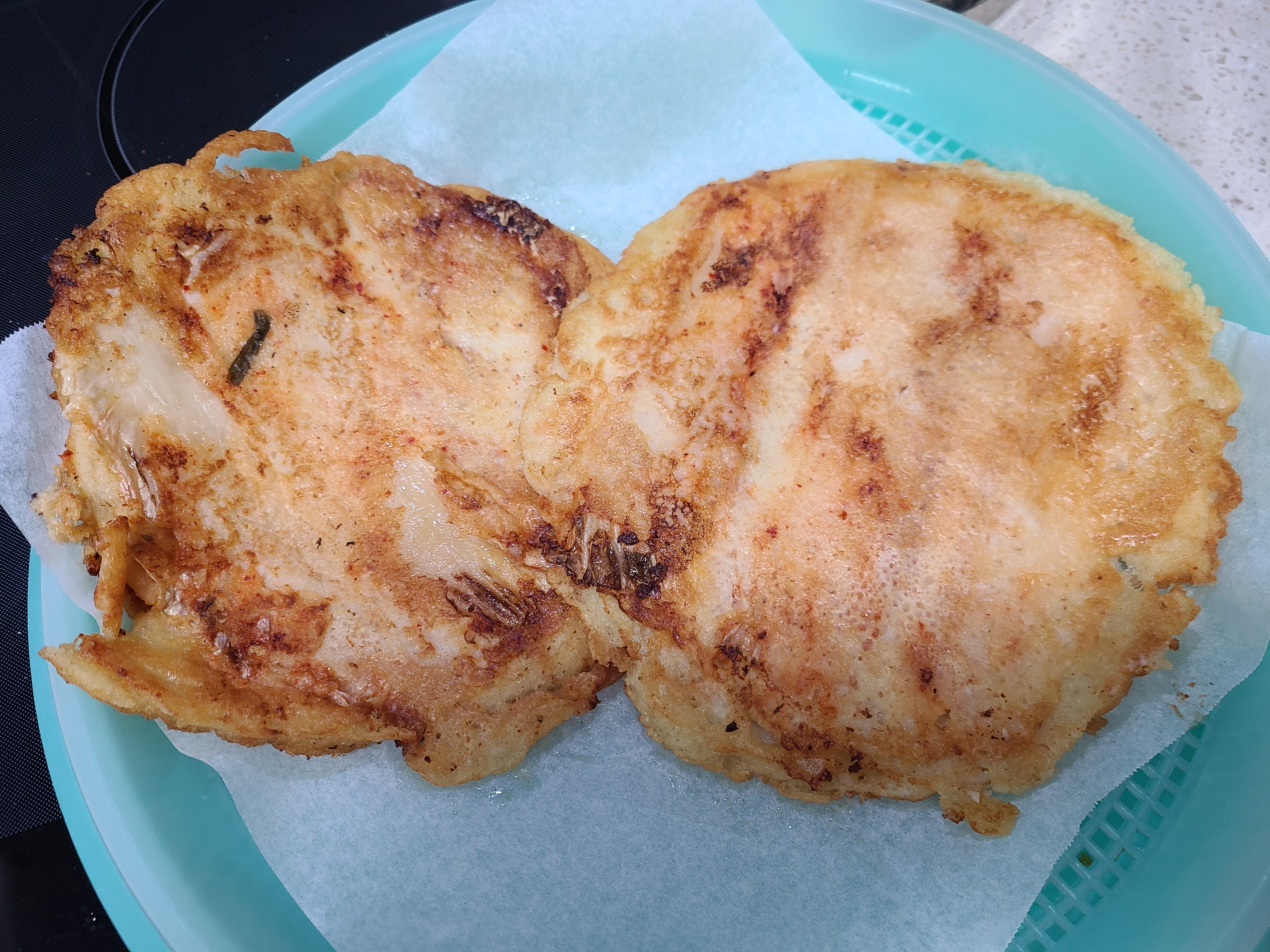 남은 반죽을 큼직하게 부치니 두쪽이 되었다.