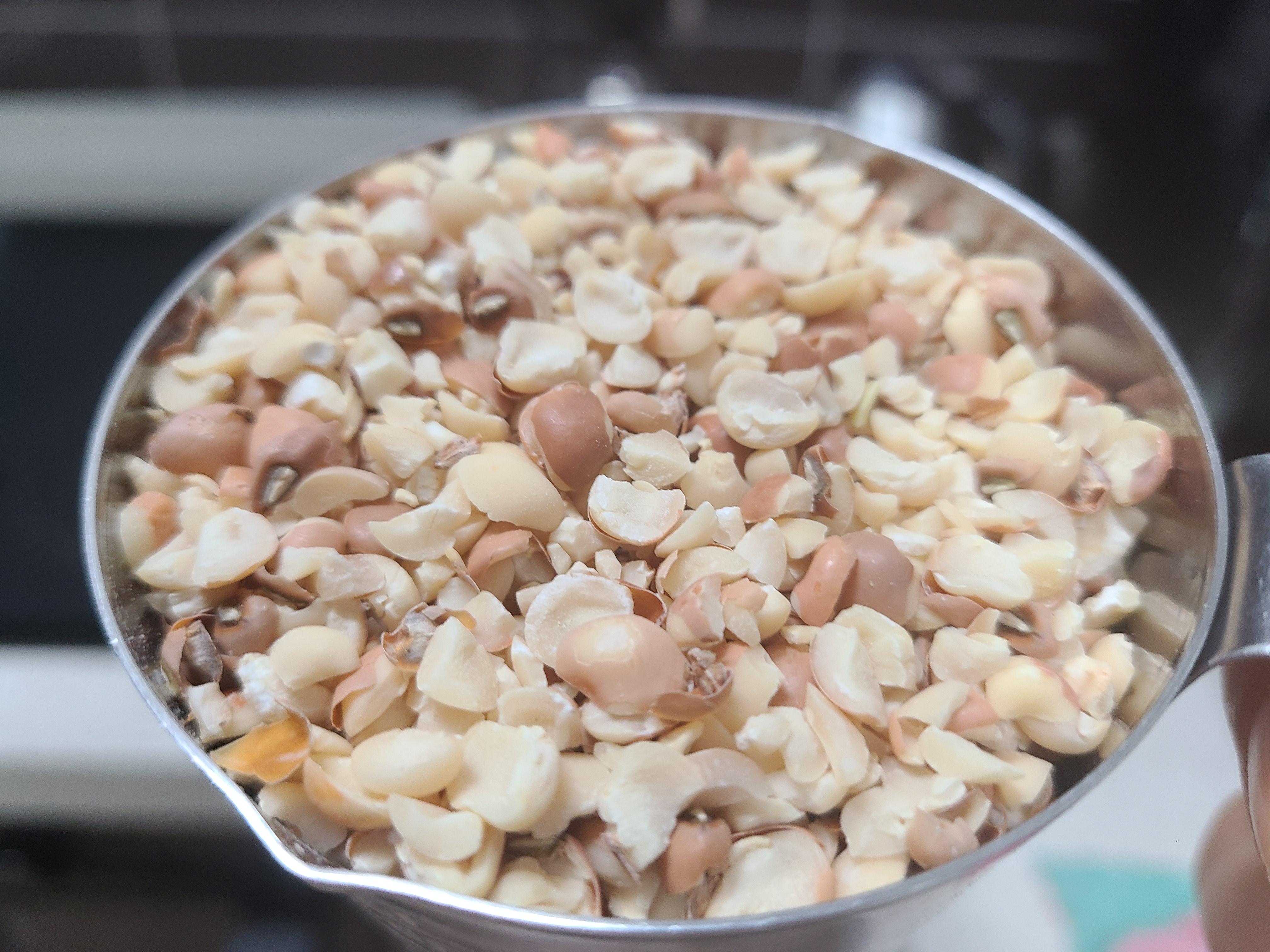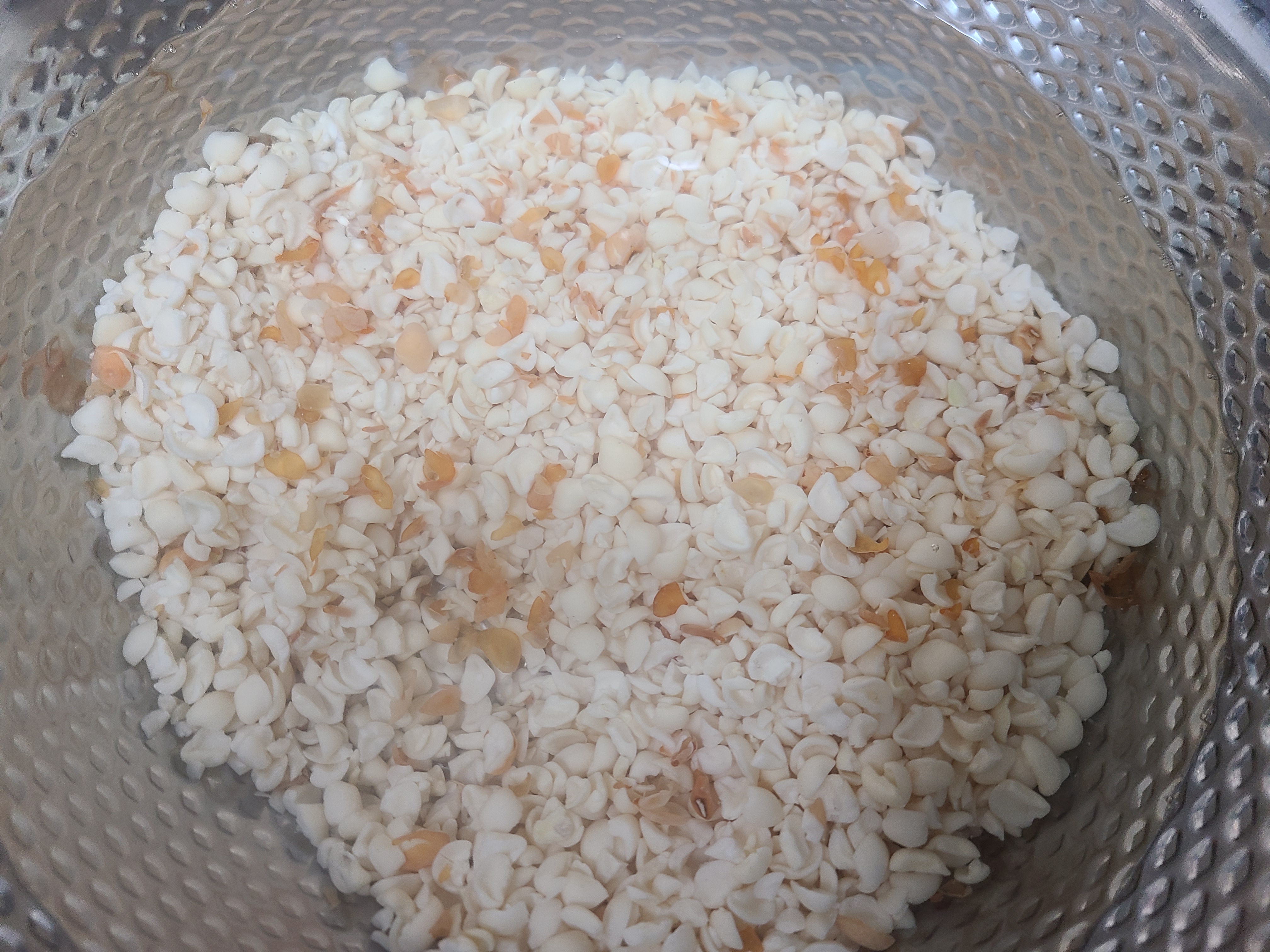 2. 동부가 불어나면 여러 번 헹구며 동부 껍질을 물에 흘려버린다. 동부 알맹이만 남겨준다.