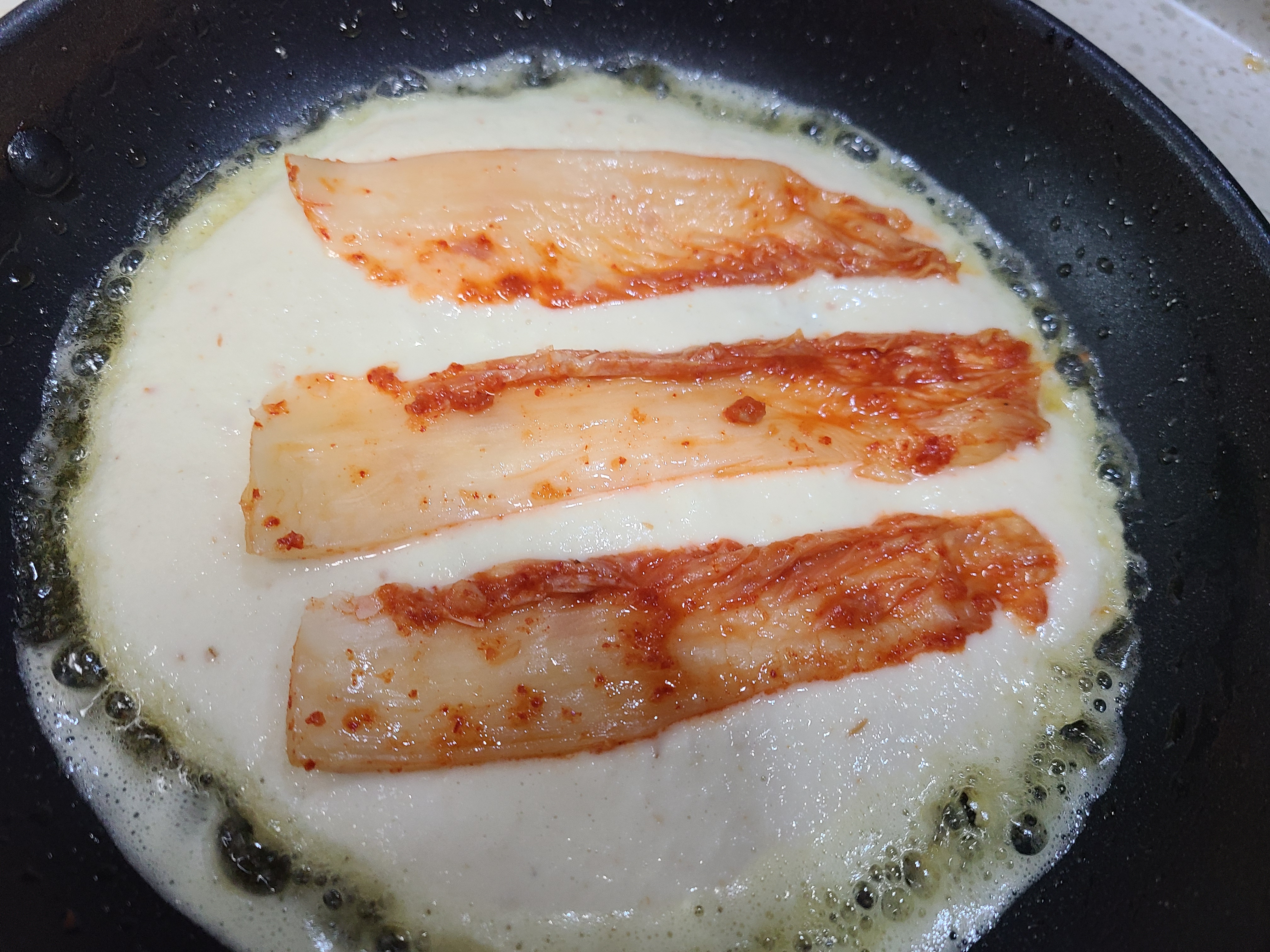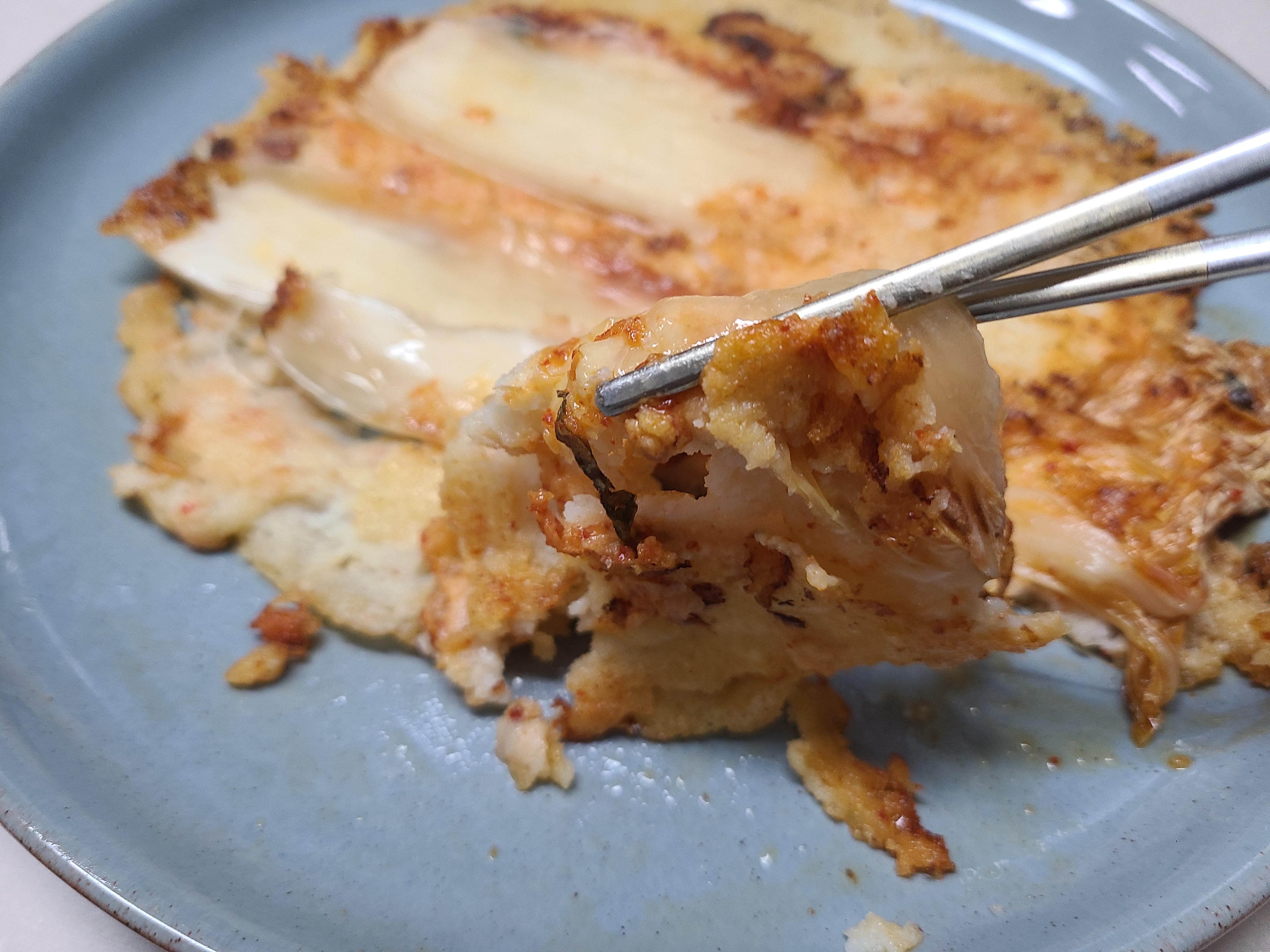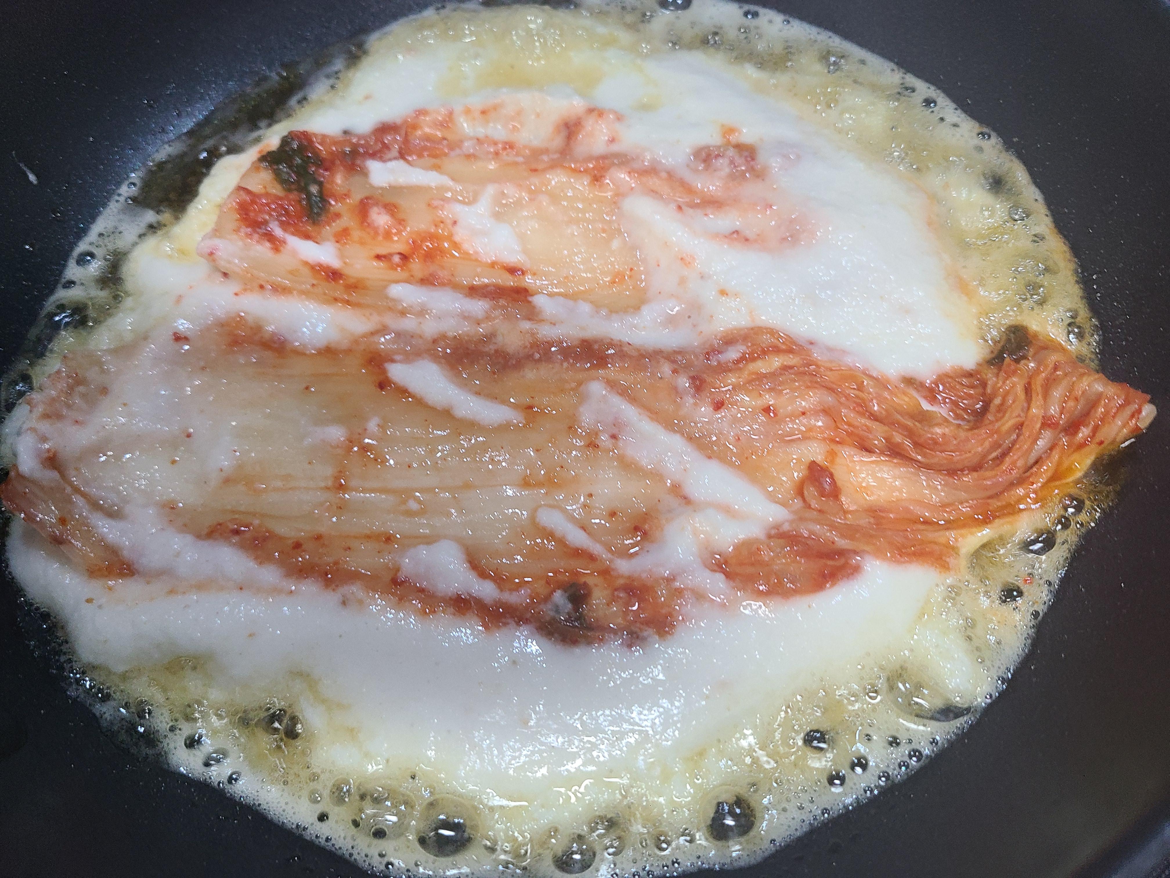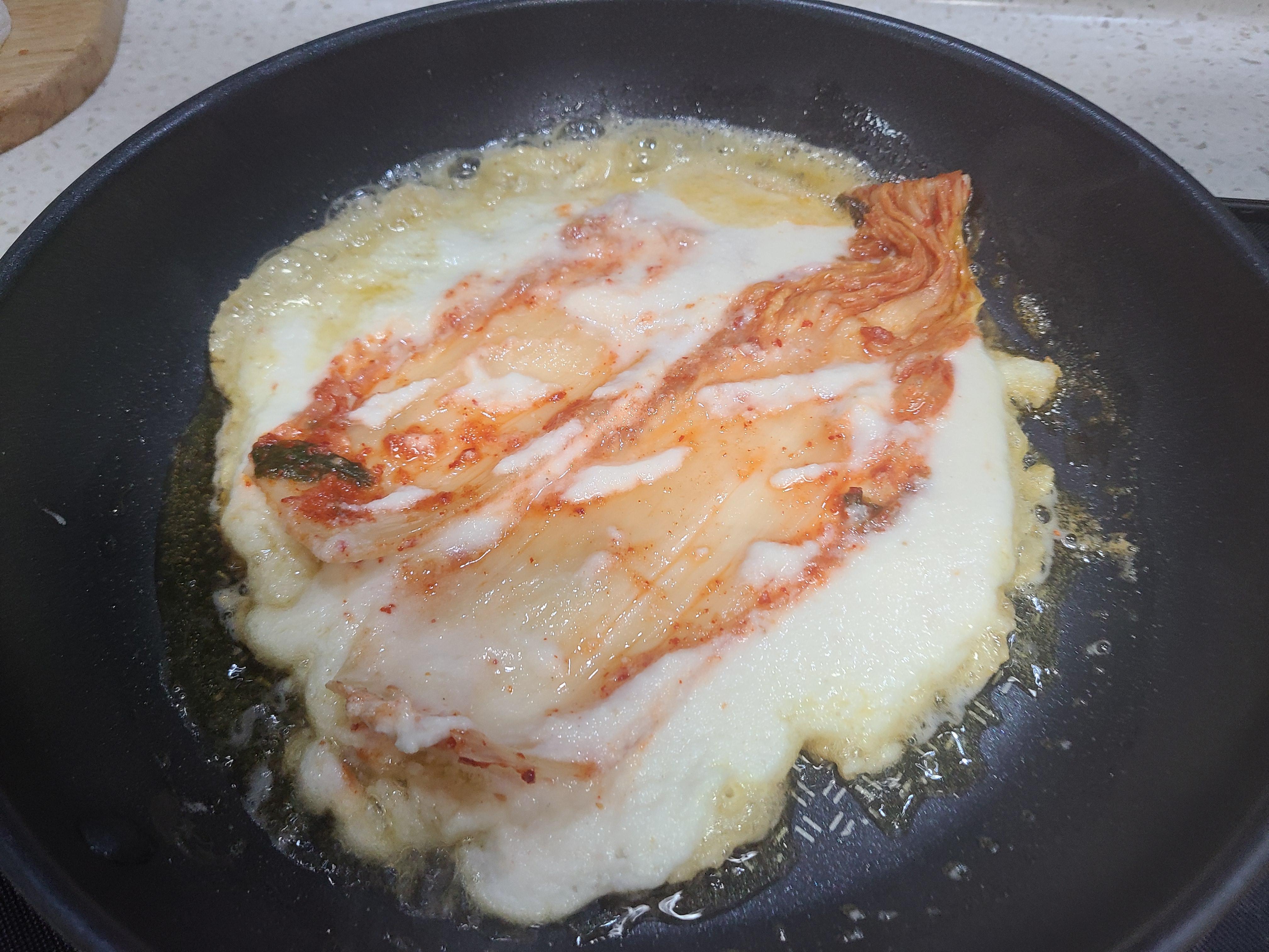 이번에는 김치를 길게 반을 자르고 잎사귀 끝부분을 잘라내고 얹어 부쳤다.