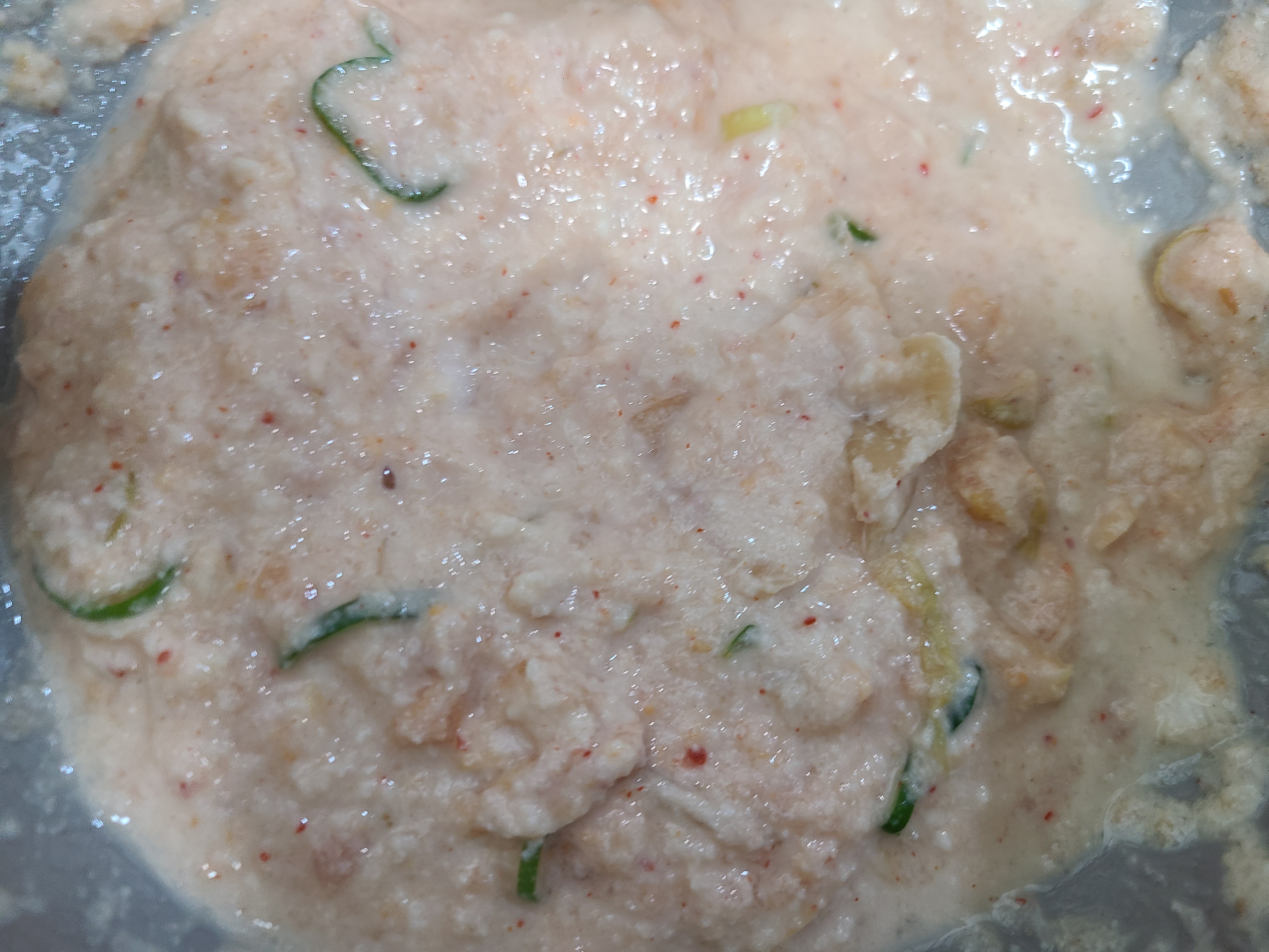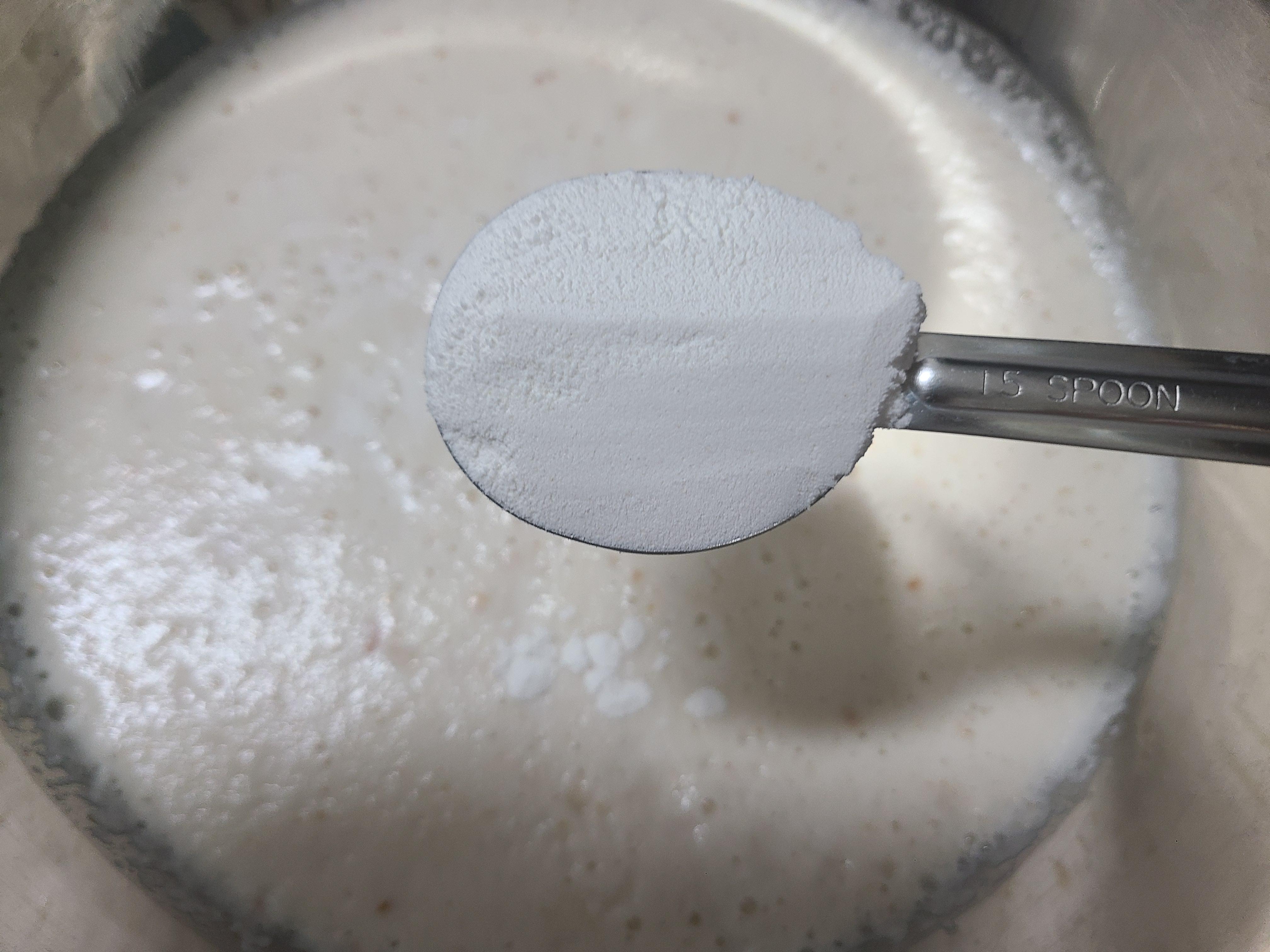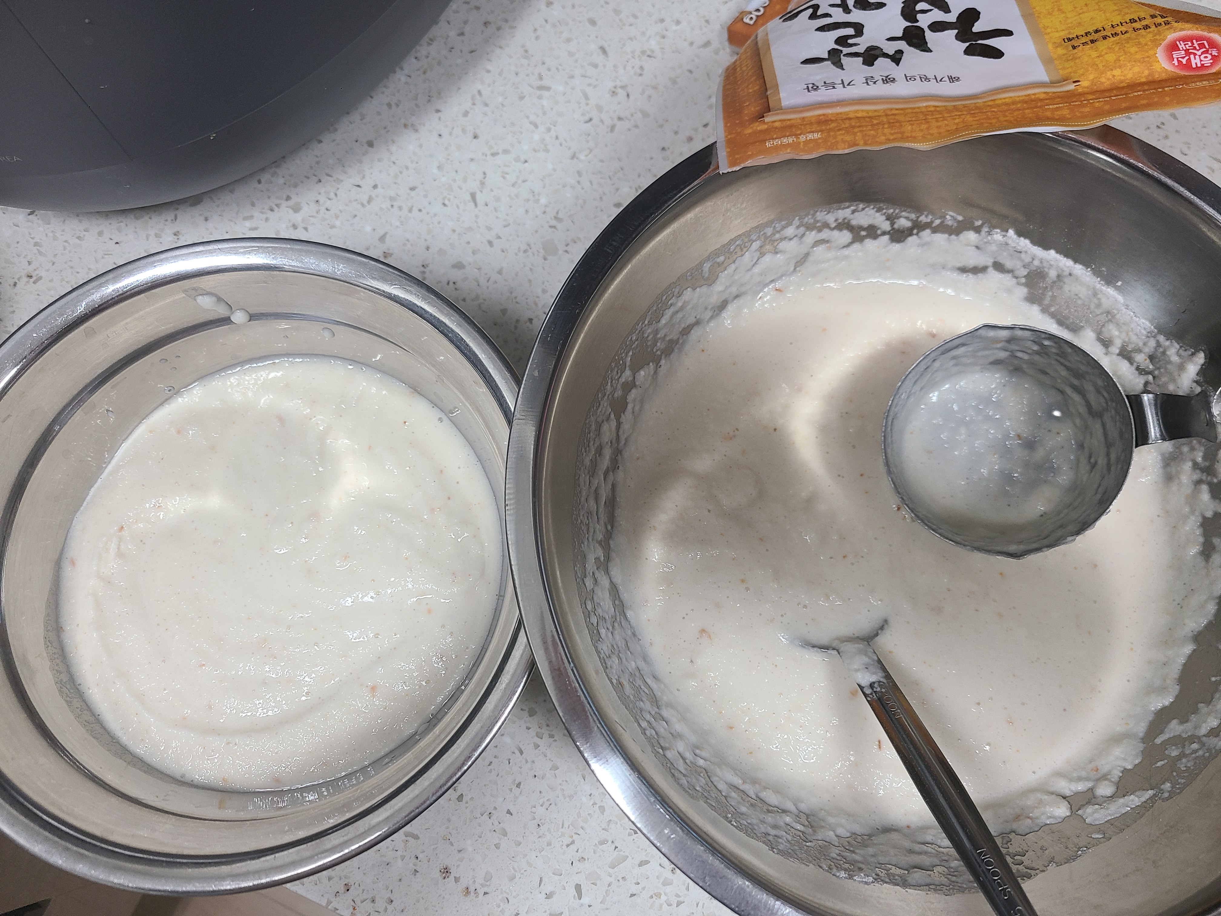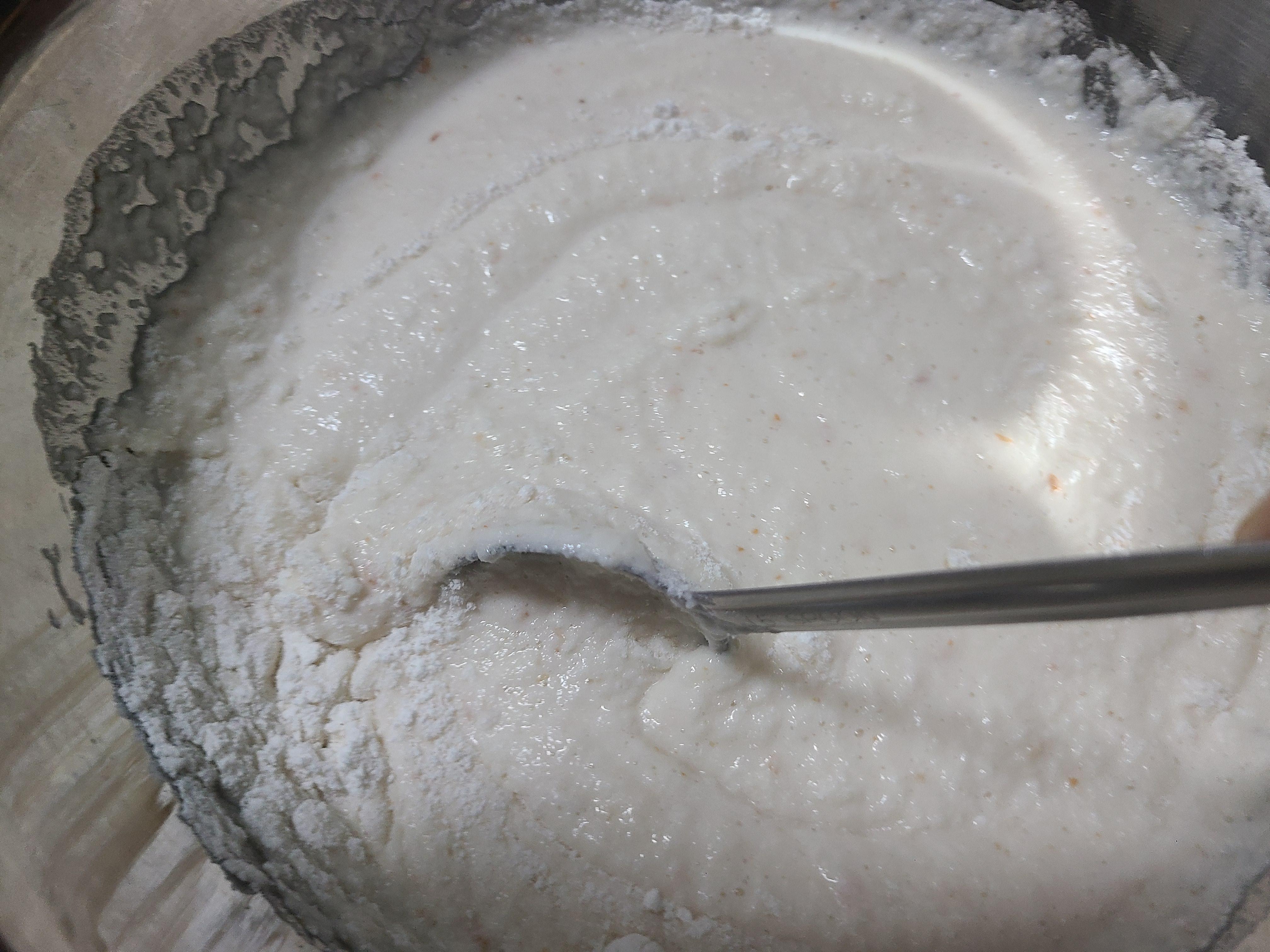 6. 믹서기에 간 동부가 묽어서 이기도 하고, 동부 부침개는 식으면 뻣뻣해서 식감이 떨어지기 때문에 찹쌀가루를 넣어준다. 묽기에 따라 양을 조절하면 되는데 찹쌀가루 4큰술을 넣어주니 농도가 적당했다.