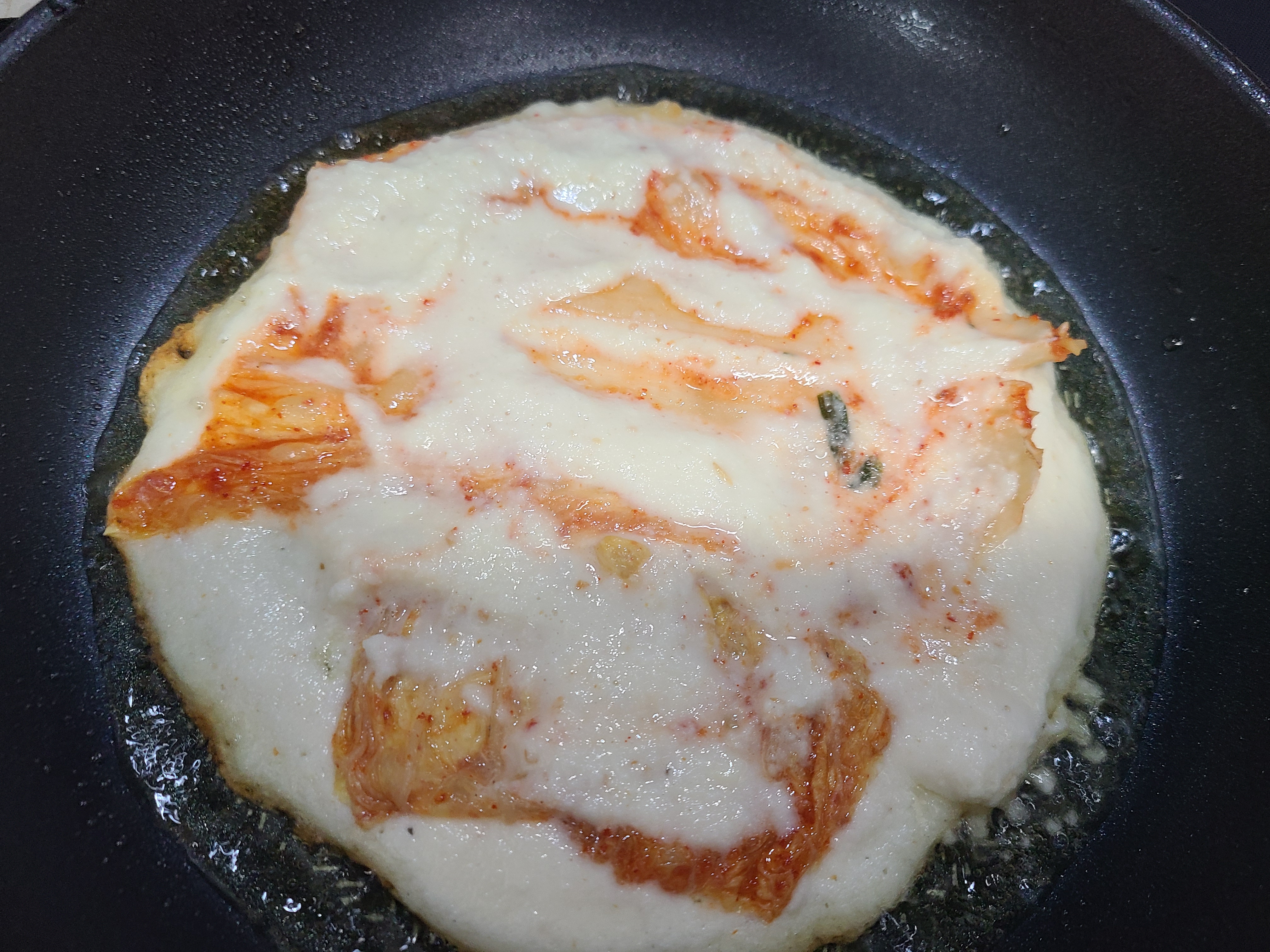 5. 첫 작품은 김치 양념 때문에 거뭇거뭇하긴 해도 찢어지지 않고 잘 부쳐졌다.
