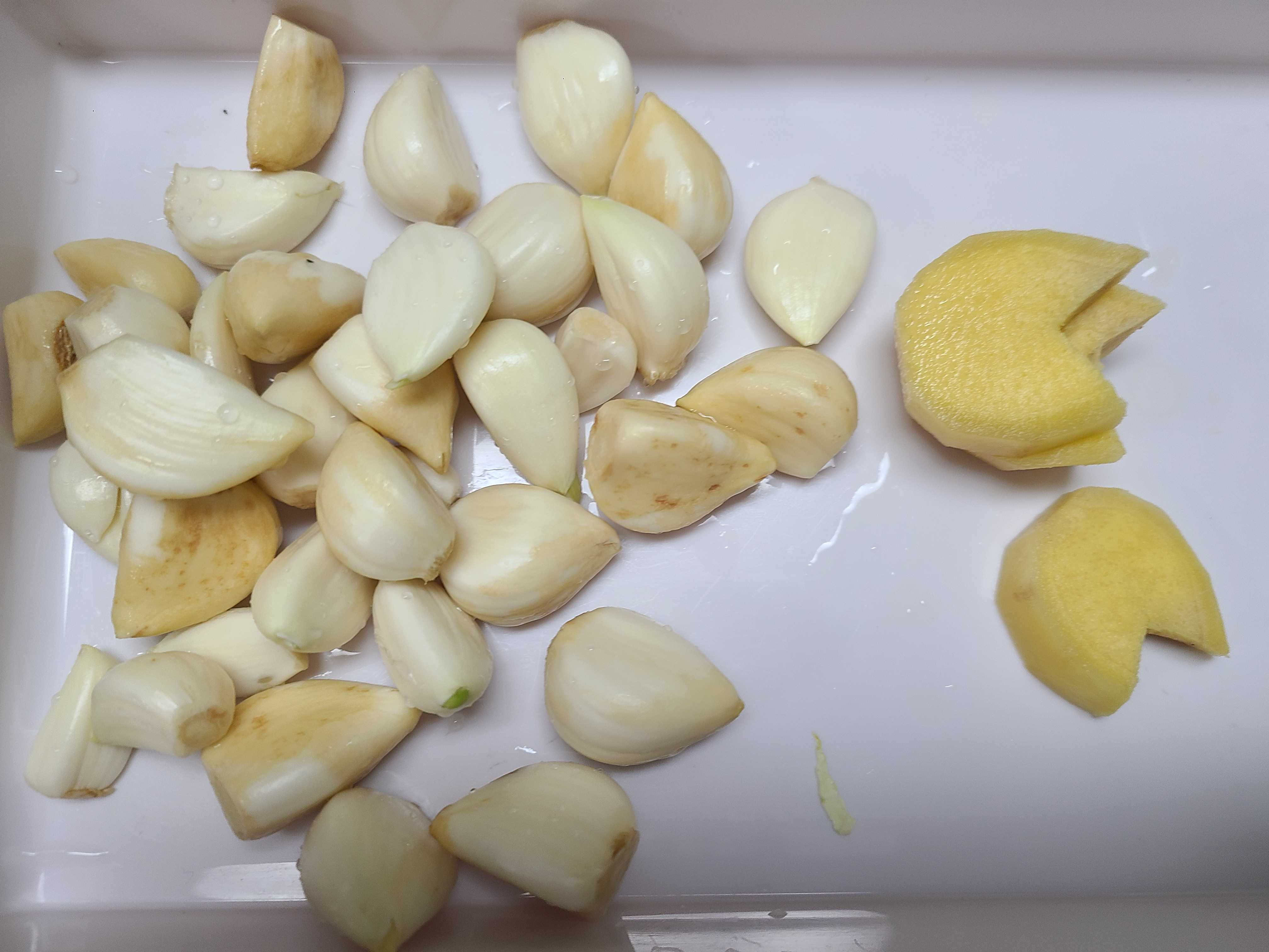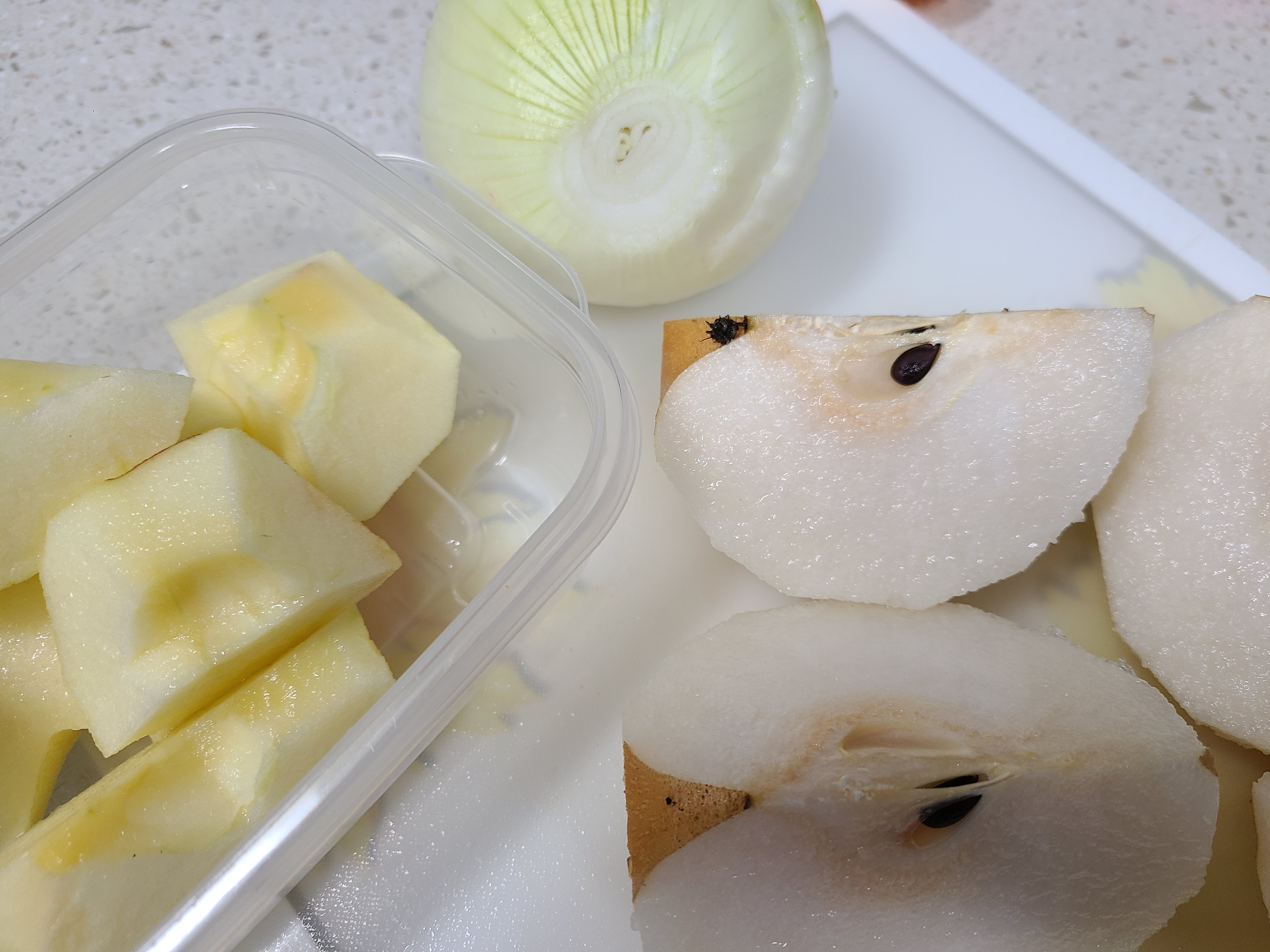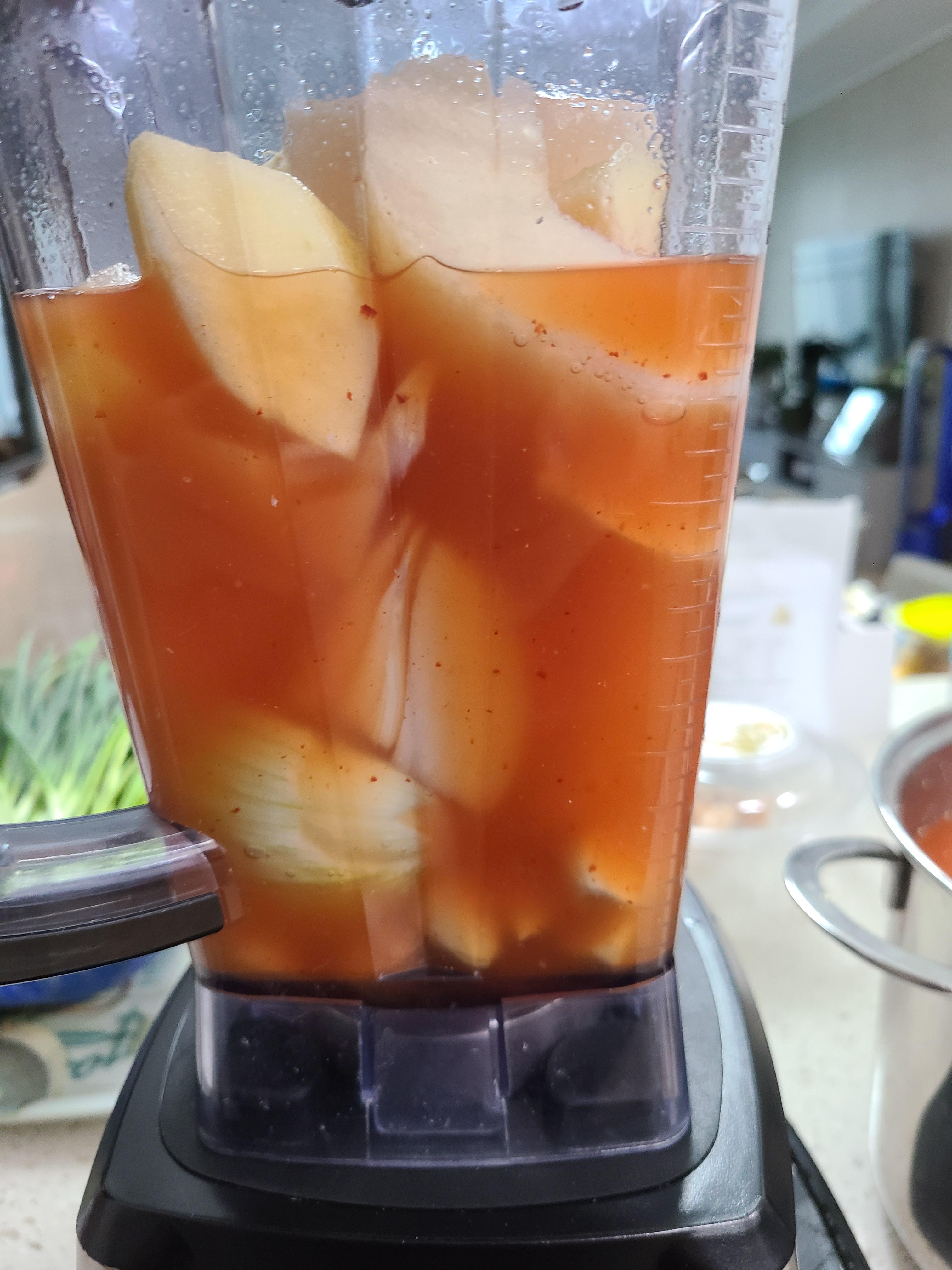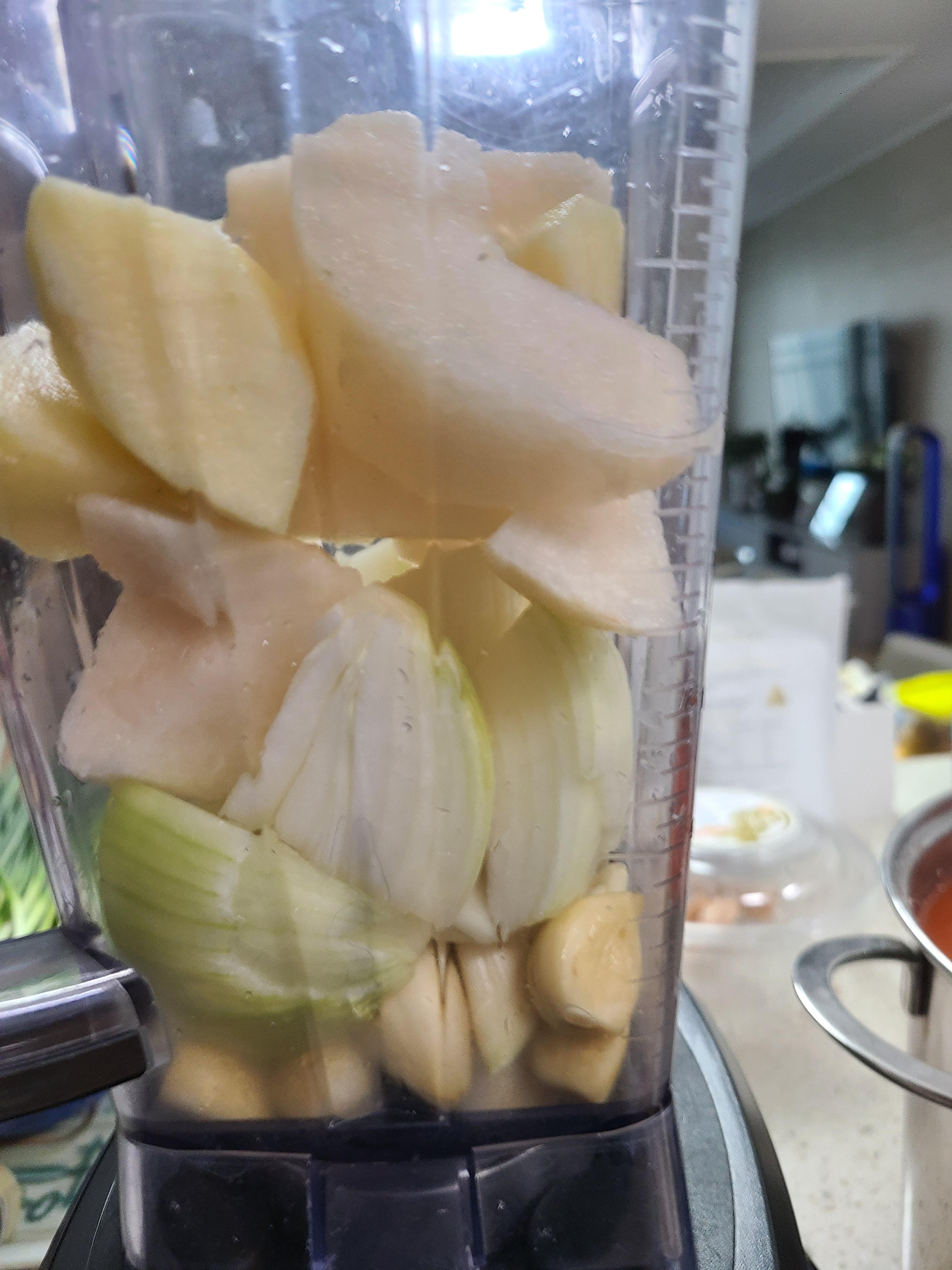 1. 양파 한 개와 사과 배는 3/4을 썰어서 블렌더에 마늘 생강과 함께 넣어준다.