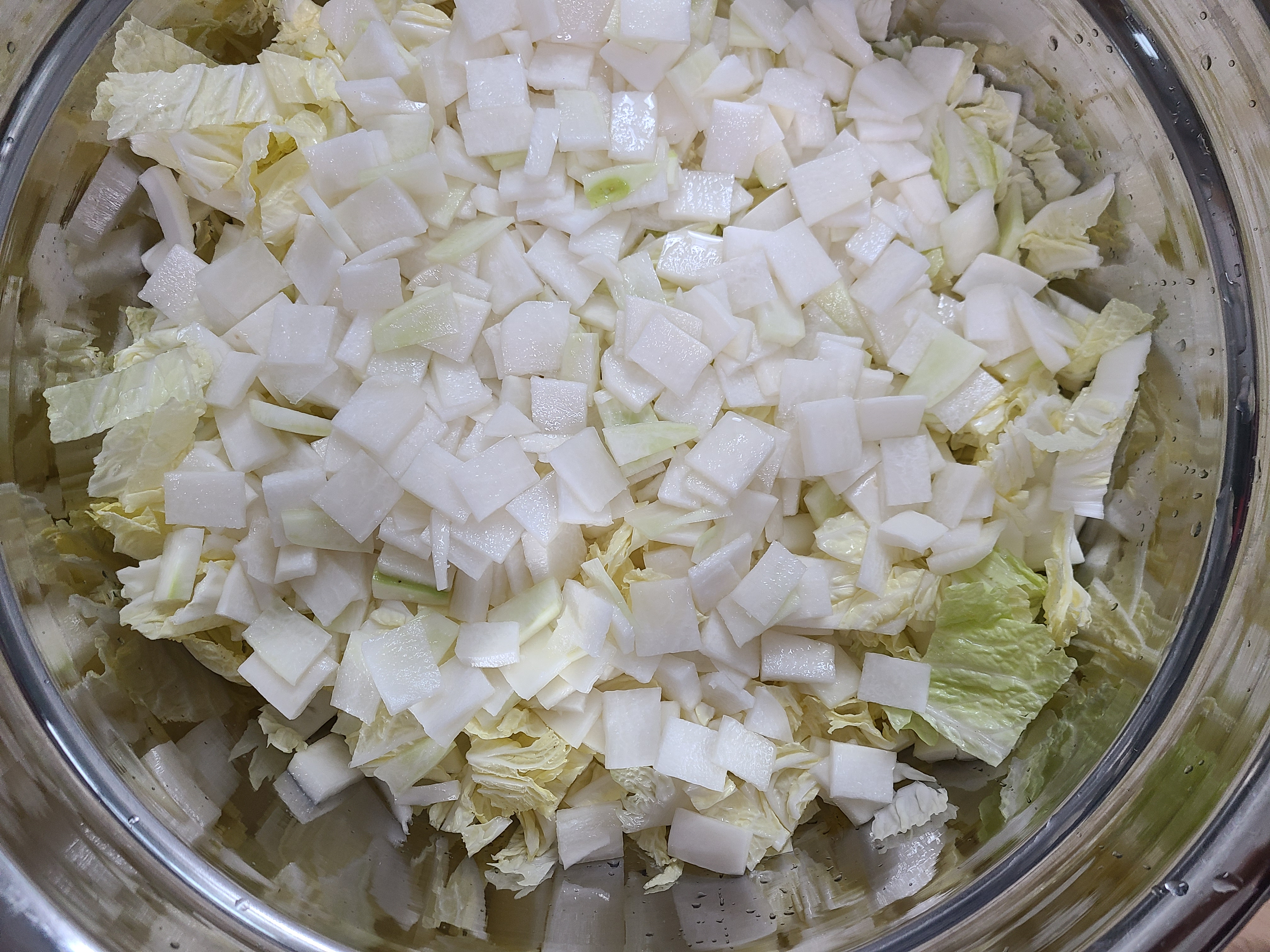 9. 무를 20분 정도 절인 후 썰어 놓은 배 추위에 쏟아 넓게 펴준다. 절인 무와 절임물의 소금기가 배추에 배이게 해 준다.