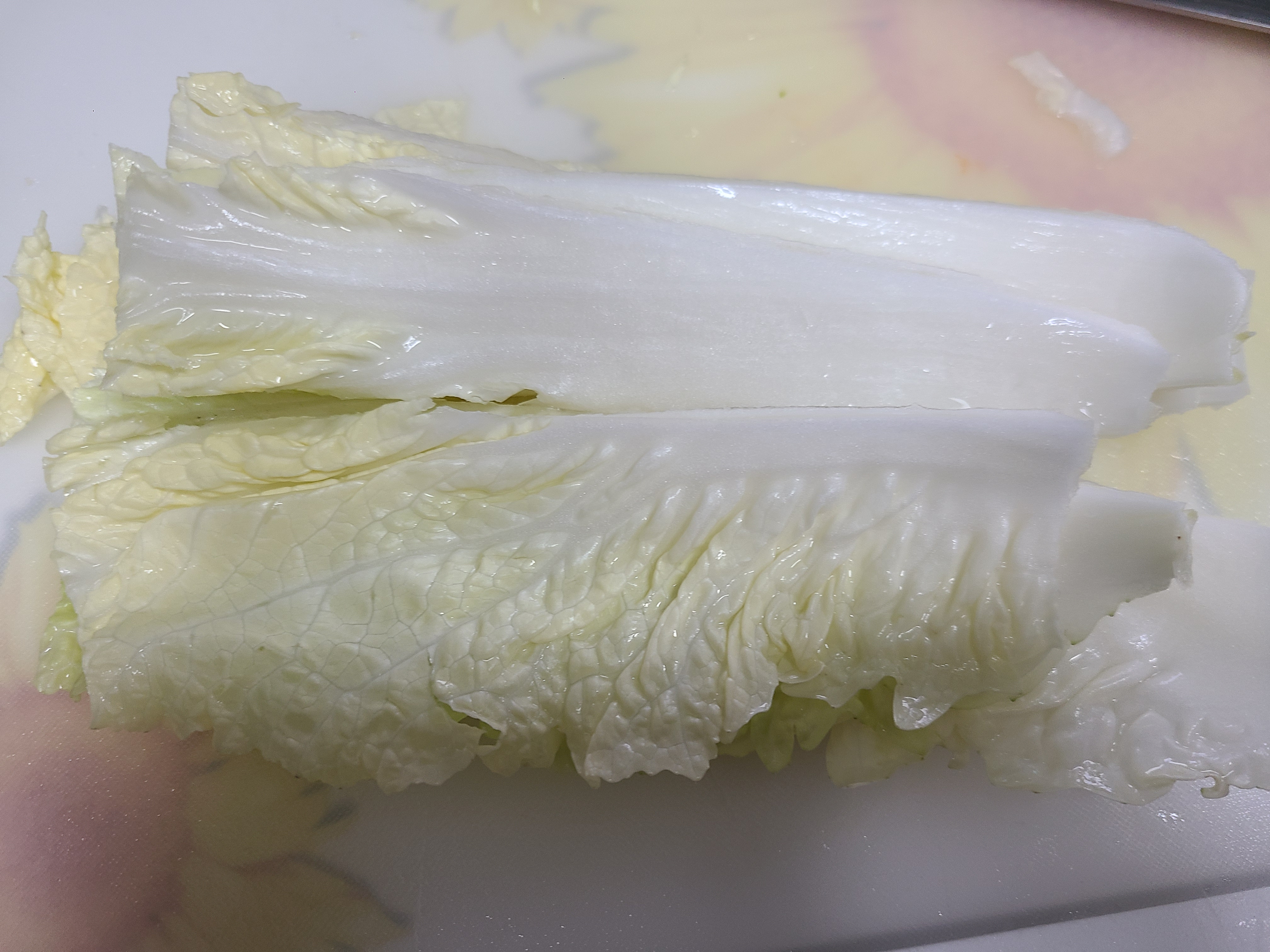 6. 배추 줄기 부분을 길게 2~4등분 한 후 썰어준다.