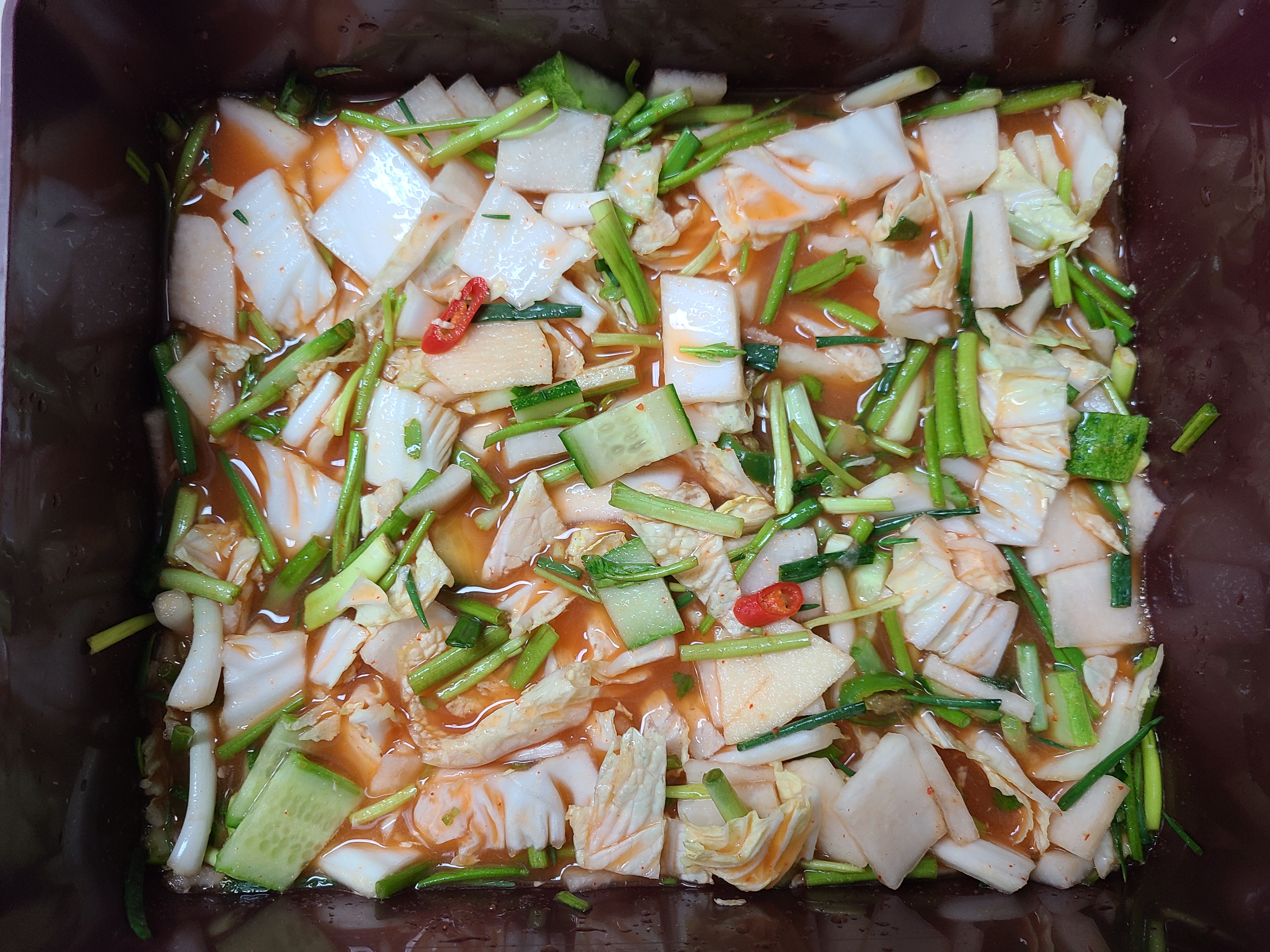 5. 청홍고추, 오이 한 개, 사과와 배 1/4를 납작하게 썰어서 넣어준다. 재료를 골고루 섞어준 후 맛을 보아 간이 만족스러우면 김치통에 옮겨 넣어주면 된다.