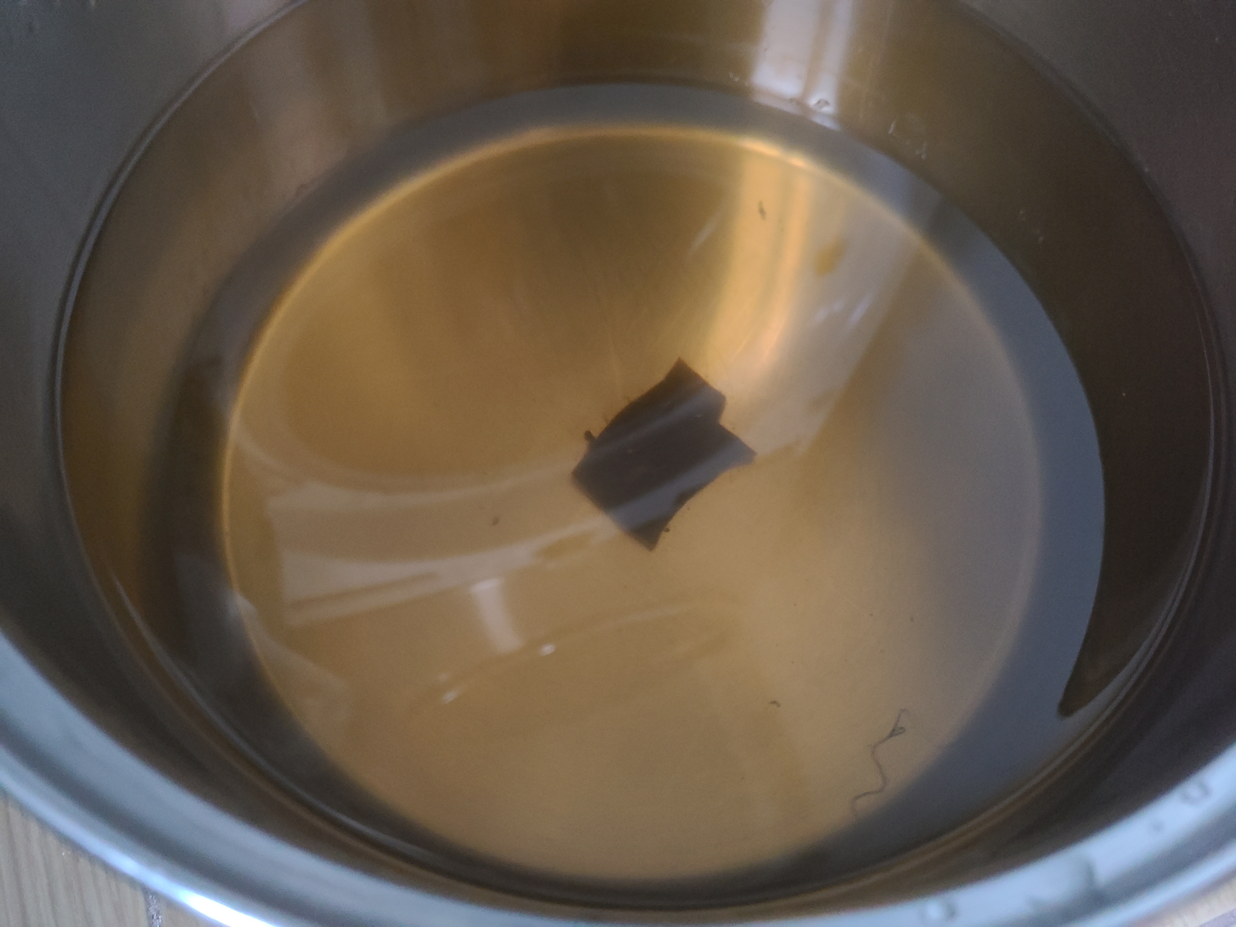 다시마 A4 사이즈 2장을 흐르는 물에 솔질을 가볍게 하며 씻은 후 큰솥에 넣고 생수를 가득 담아 1시간쯤 담가놓았다가 10분만 끓인 후 다시마를 건져냈다. 다시마 육수 6리터가 완성되었다.