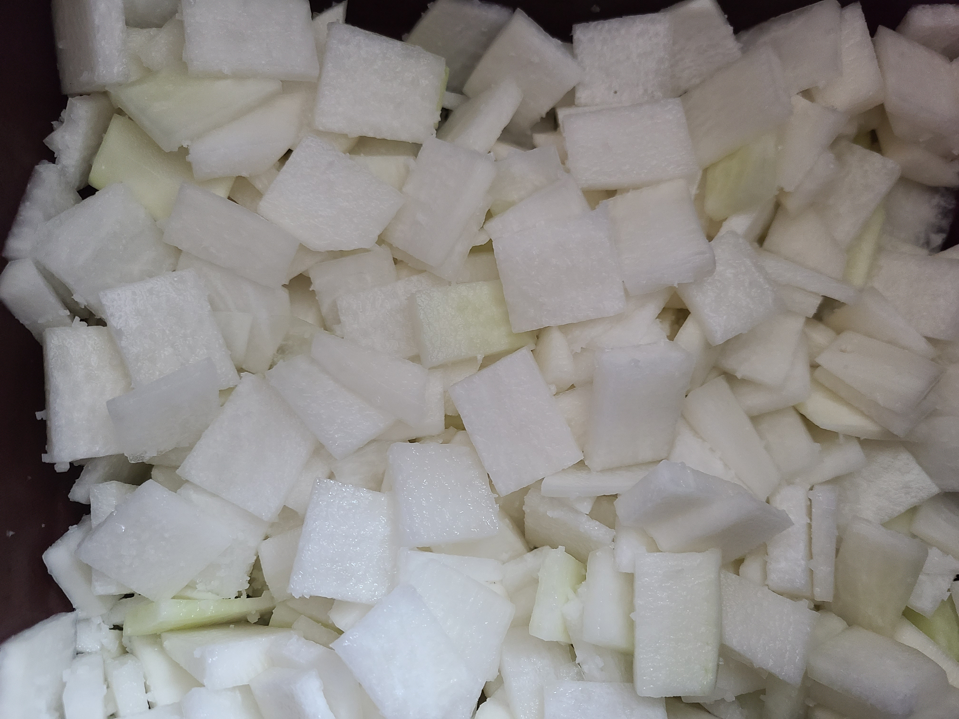 8. 썰어놓은 무에 천일염 3큰술과 뉴슈가 1/2작은술을 넣고 무를 훌훌 섞어 절여준다.