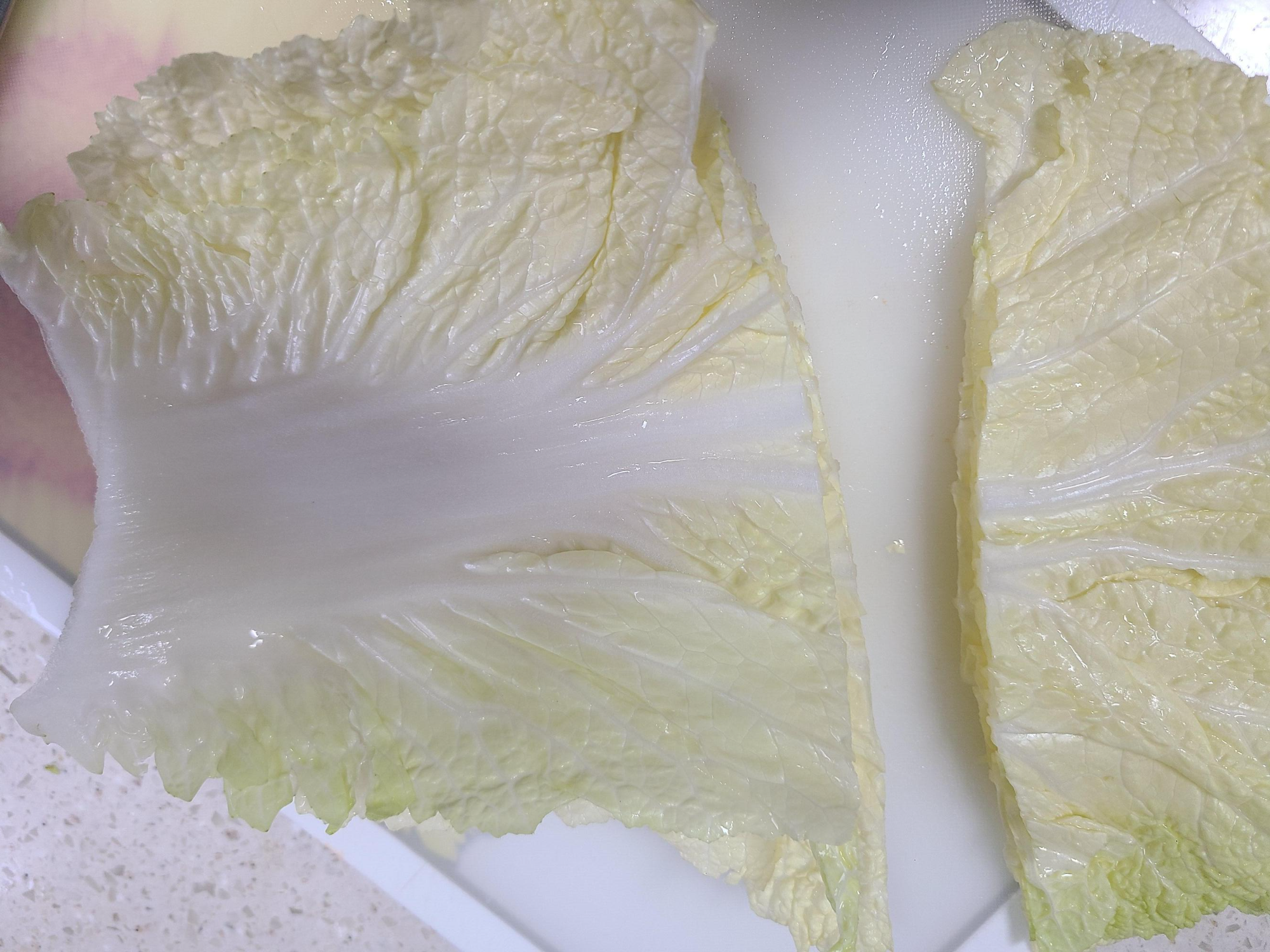 5. 배추 잎사귀 넓은 부분은 나박김치를 담그면 지저분할 수 있어 잘라낸다. 배추 넓은 잎사귀는 된장국을 끓일 때 넣어줘도 좋고 배추쌈으로 먹어도 좋다.