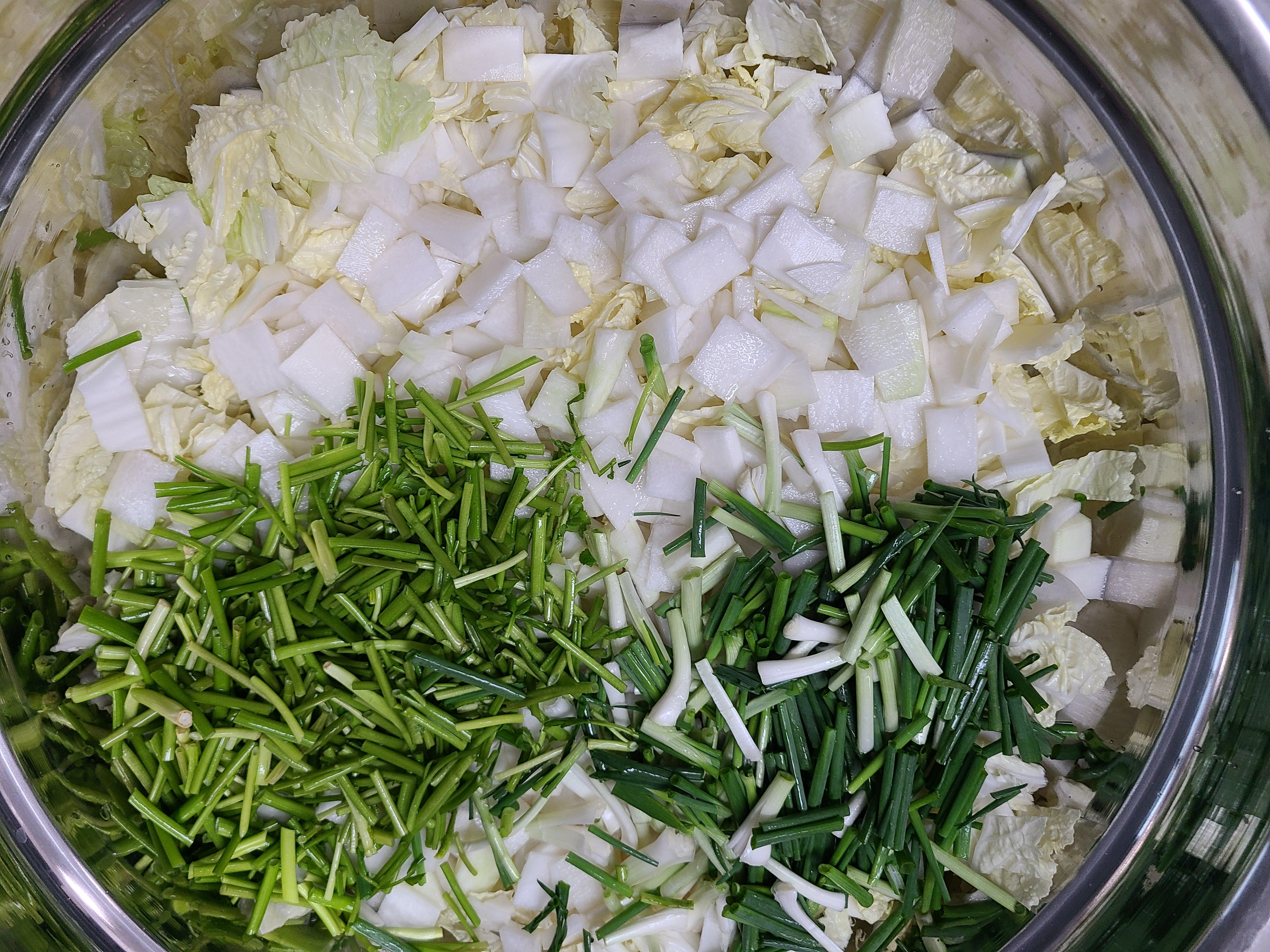 11. 미나리와 쪽파 썰은 것을 배추와 무 썰어놓은 것에 담아놓는다.