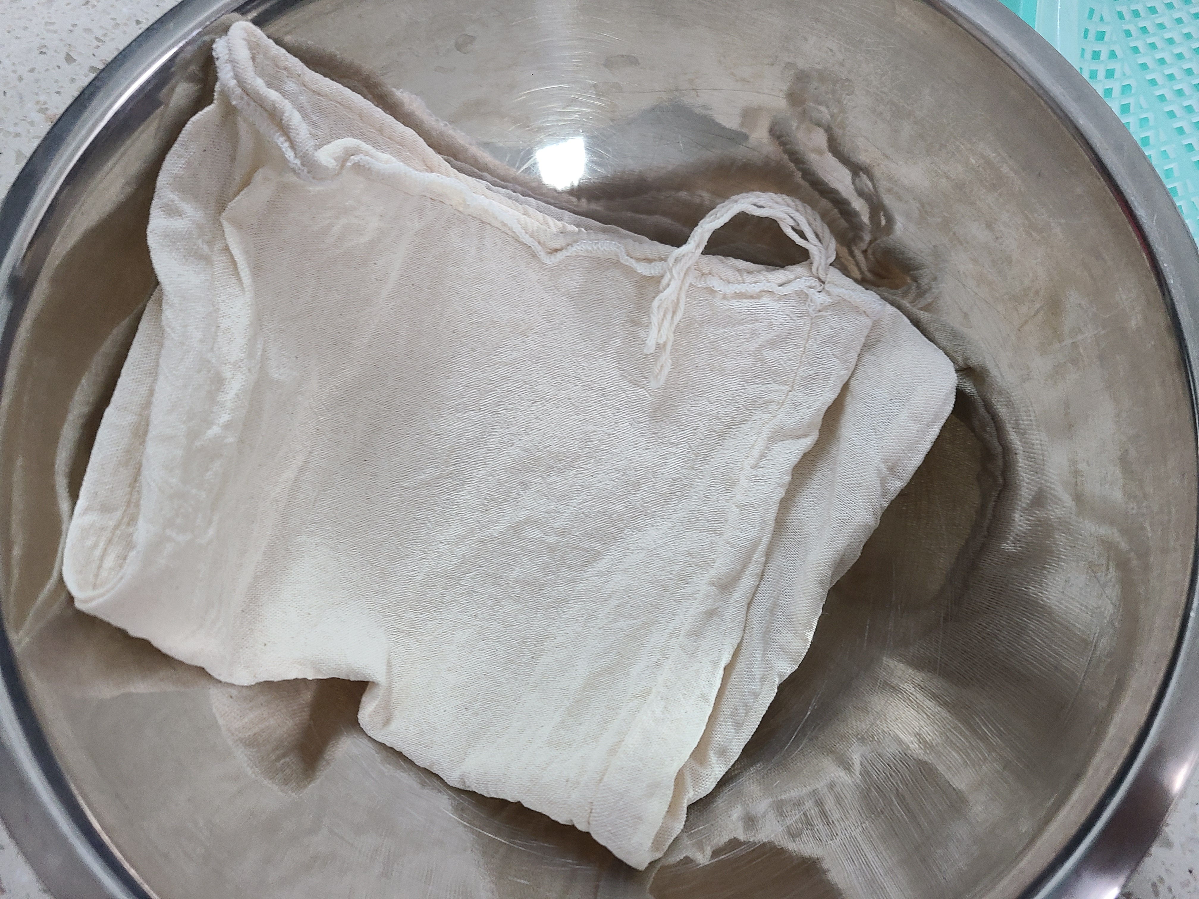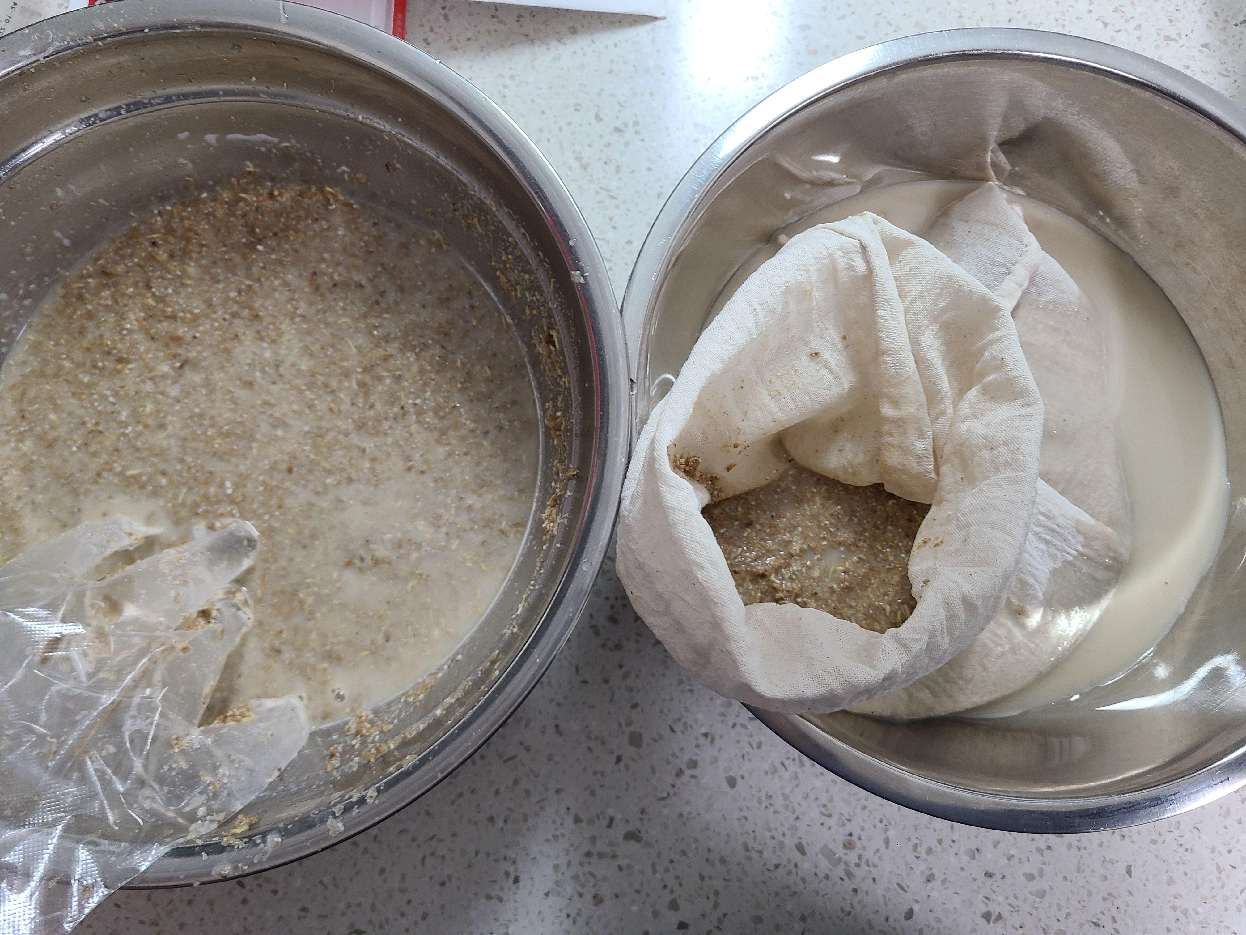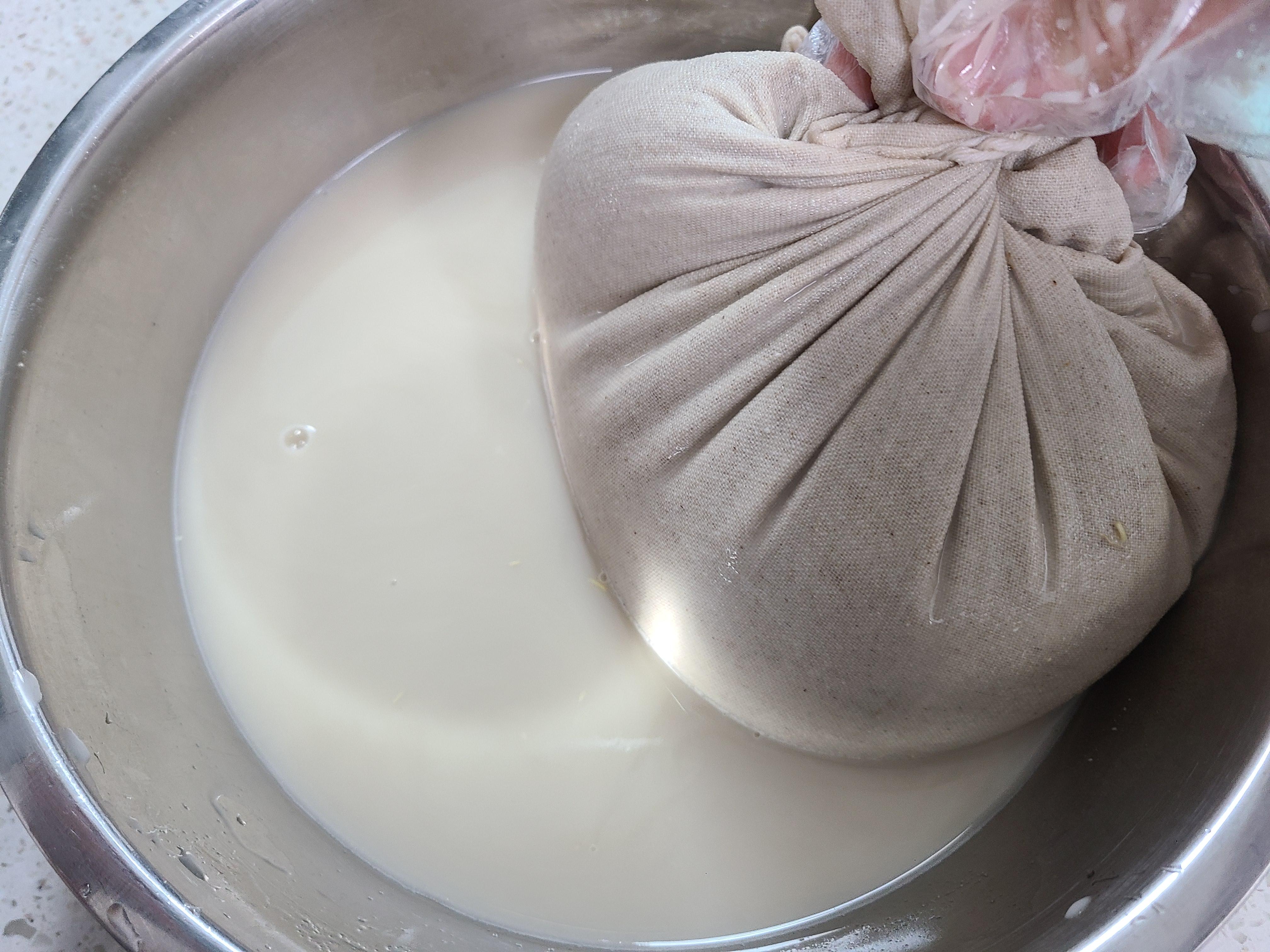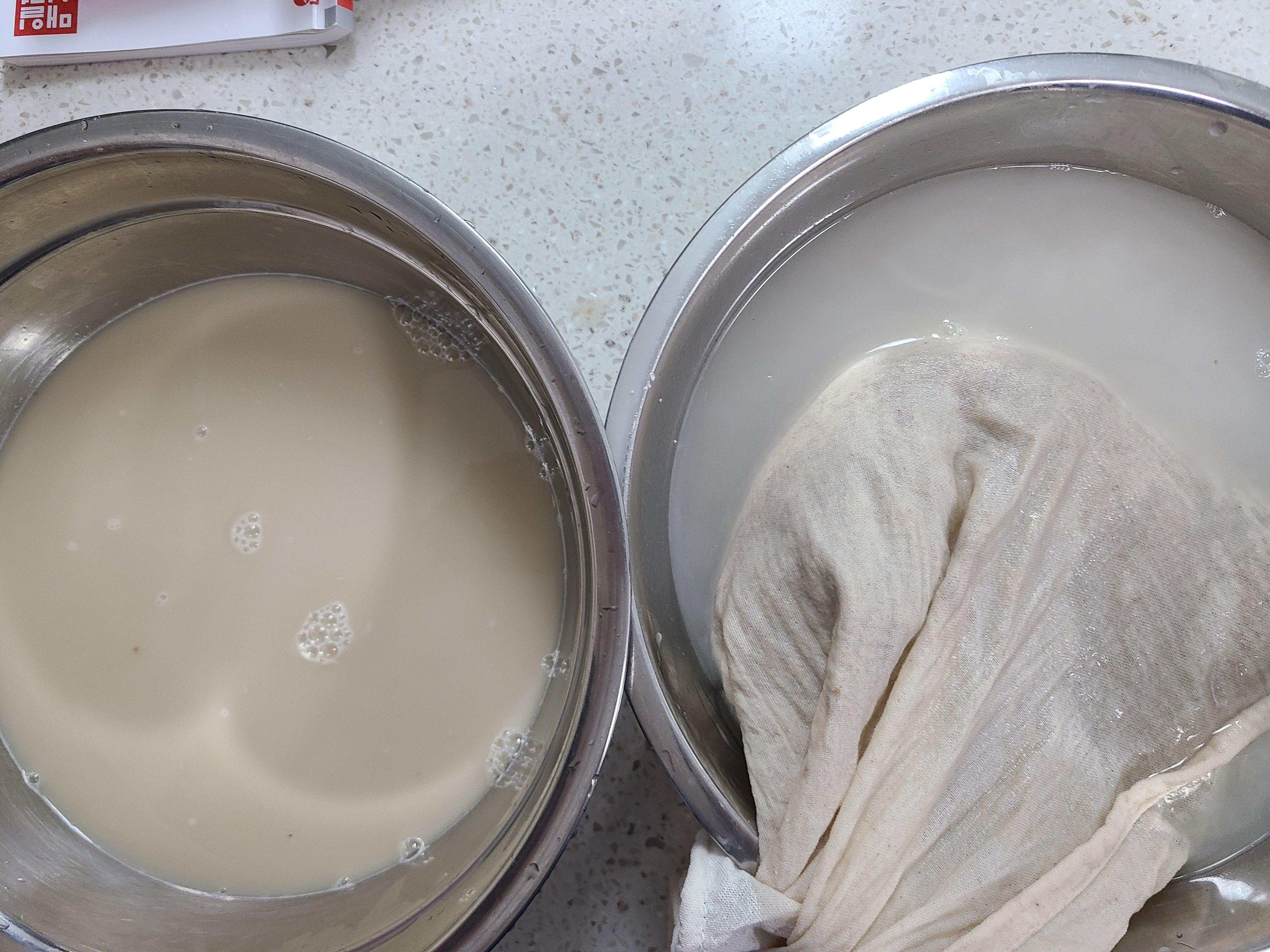 4. 자루를 짜서 엿기름 물이 나오면 다른 그릇에 옮겨준다.