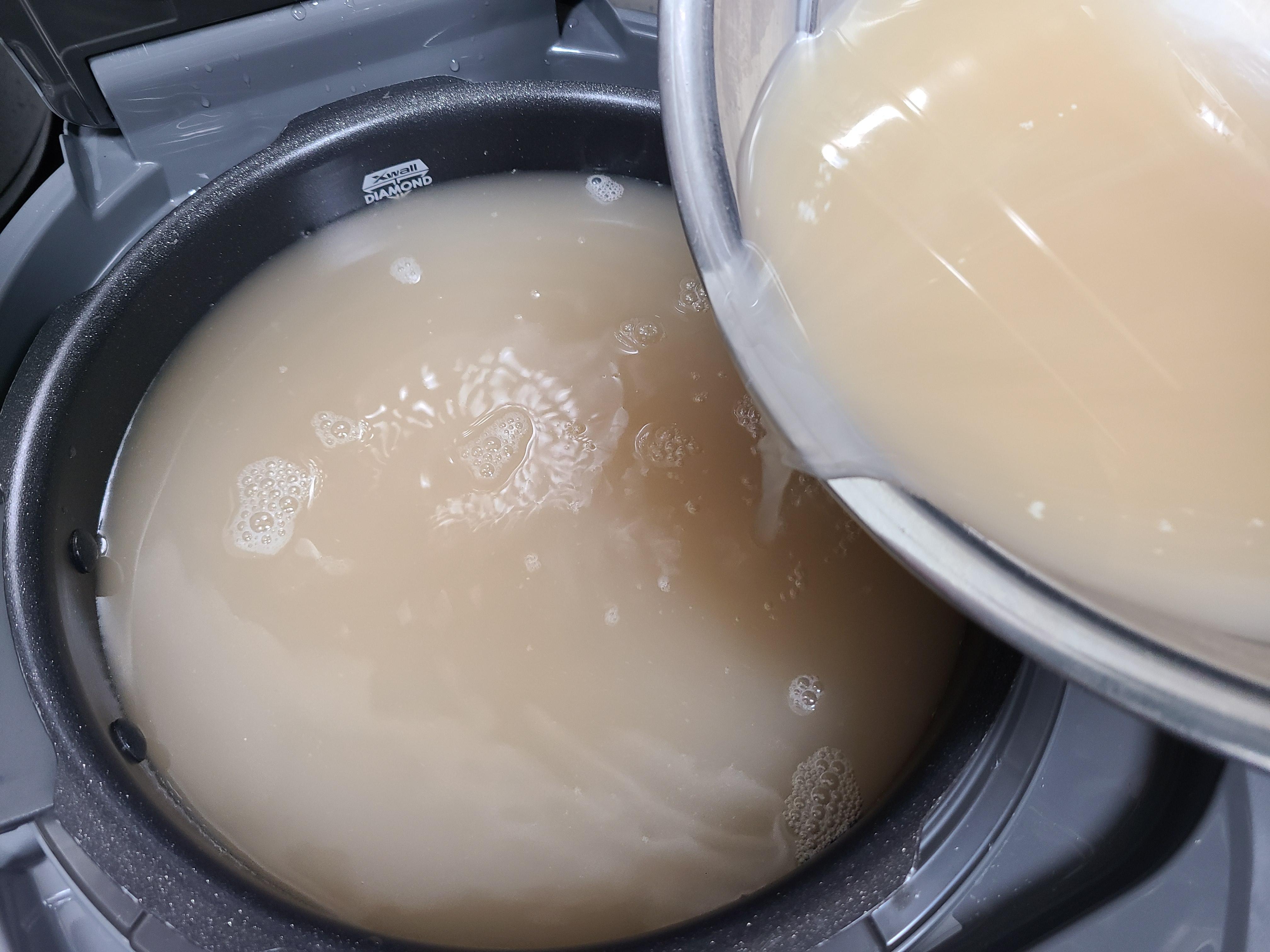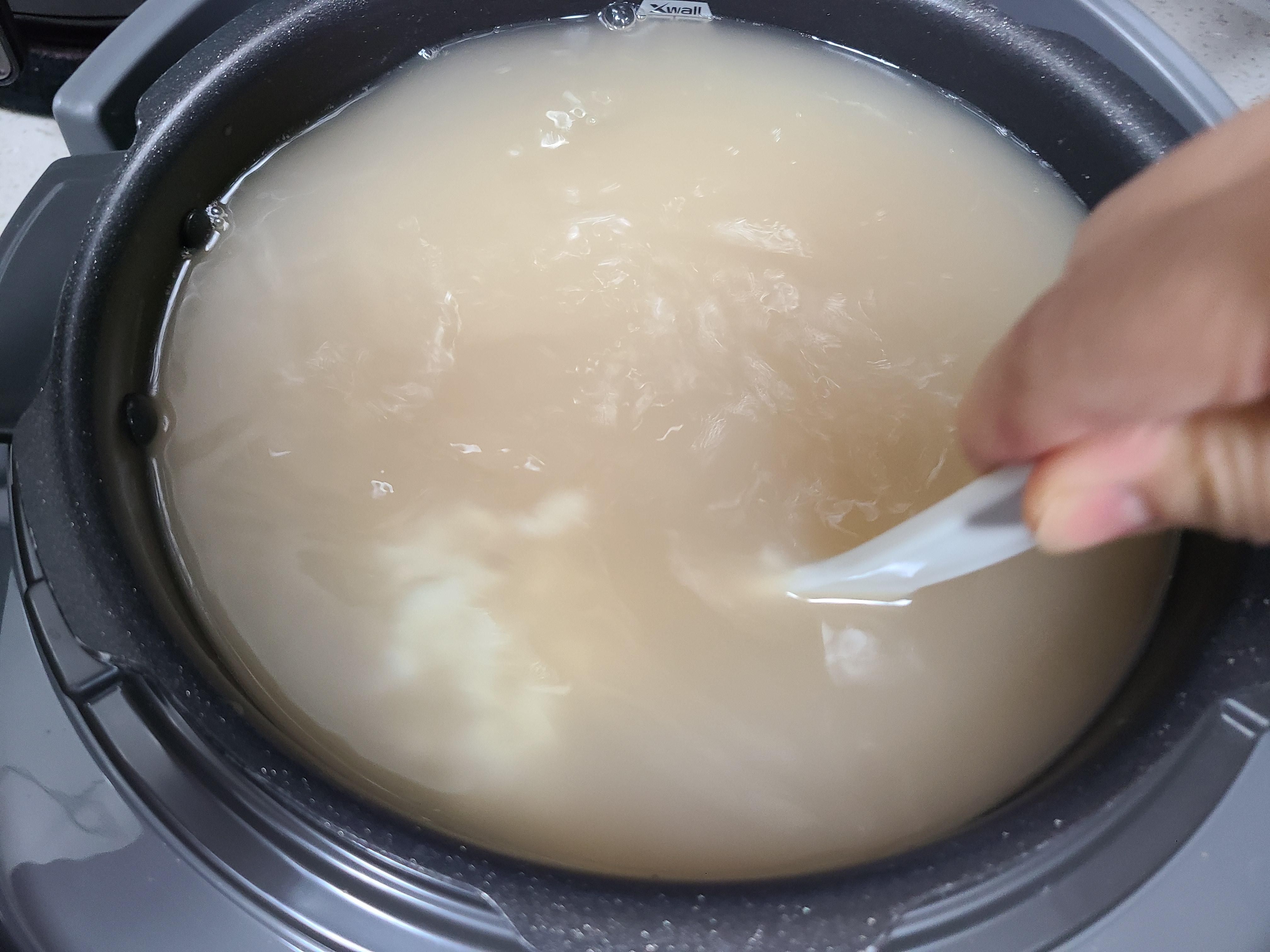 4. 가라앉아 있던 앙금이 올라오면 들어가지 않게 멈춘다. 10인용 전기밥솥에 가득 담겼다.
