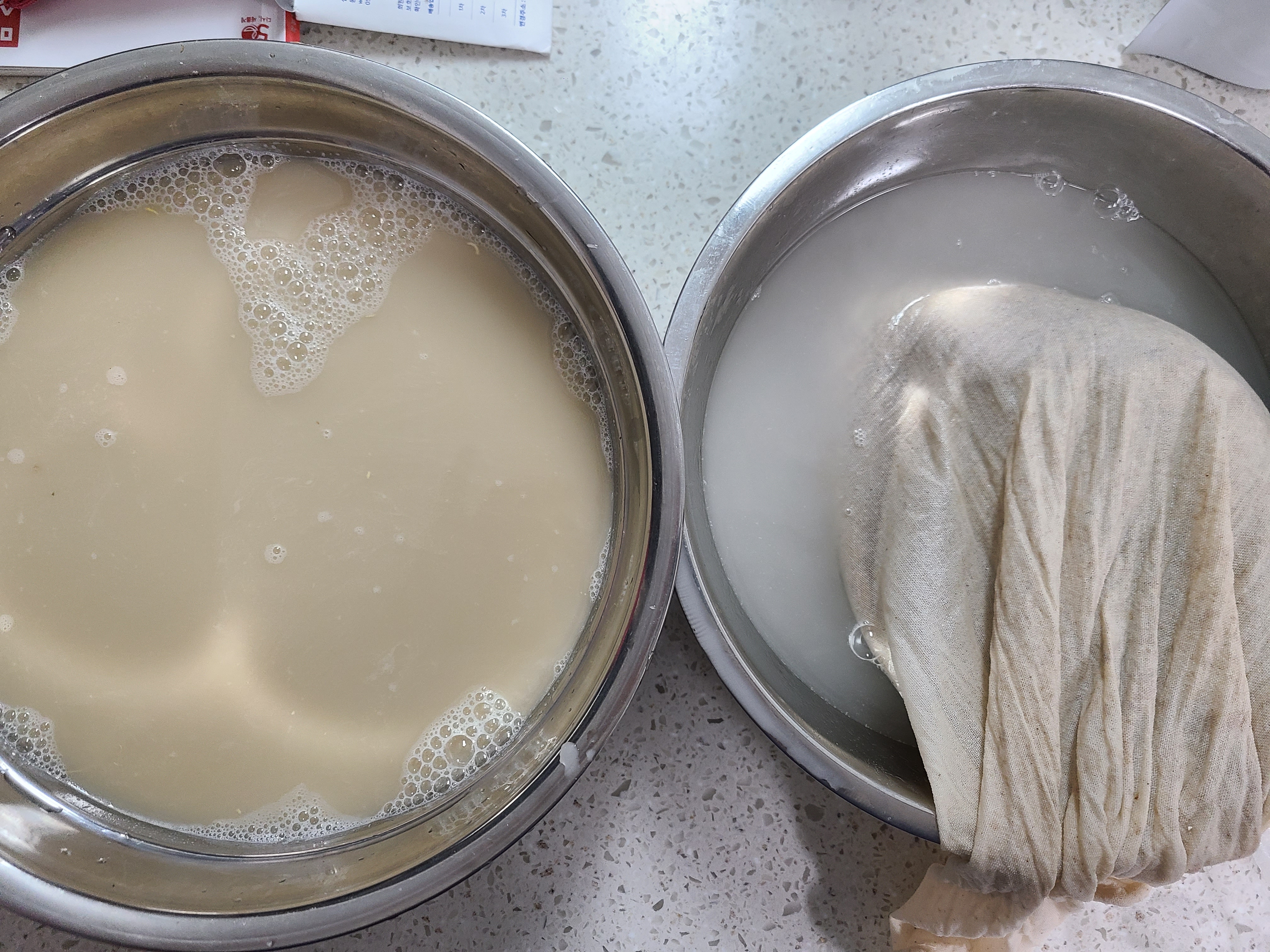 준비한 면자루로 엿기름을 짜서 물만 남게 할 거다. 예전에 친정엄마는 엿기름 짜는 자루와 묵 앙금을 짜는 자루를 따로 사용하셨다.