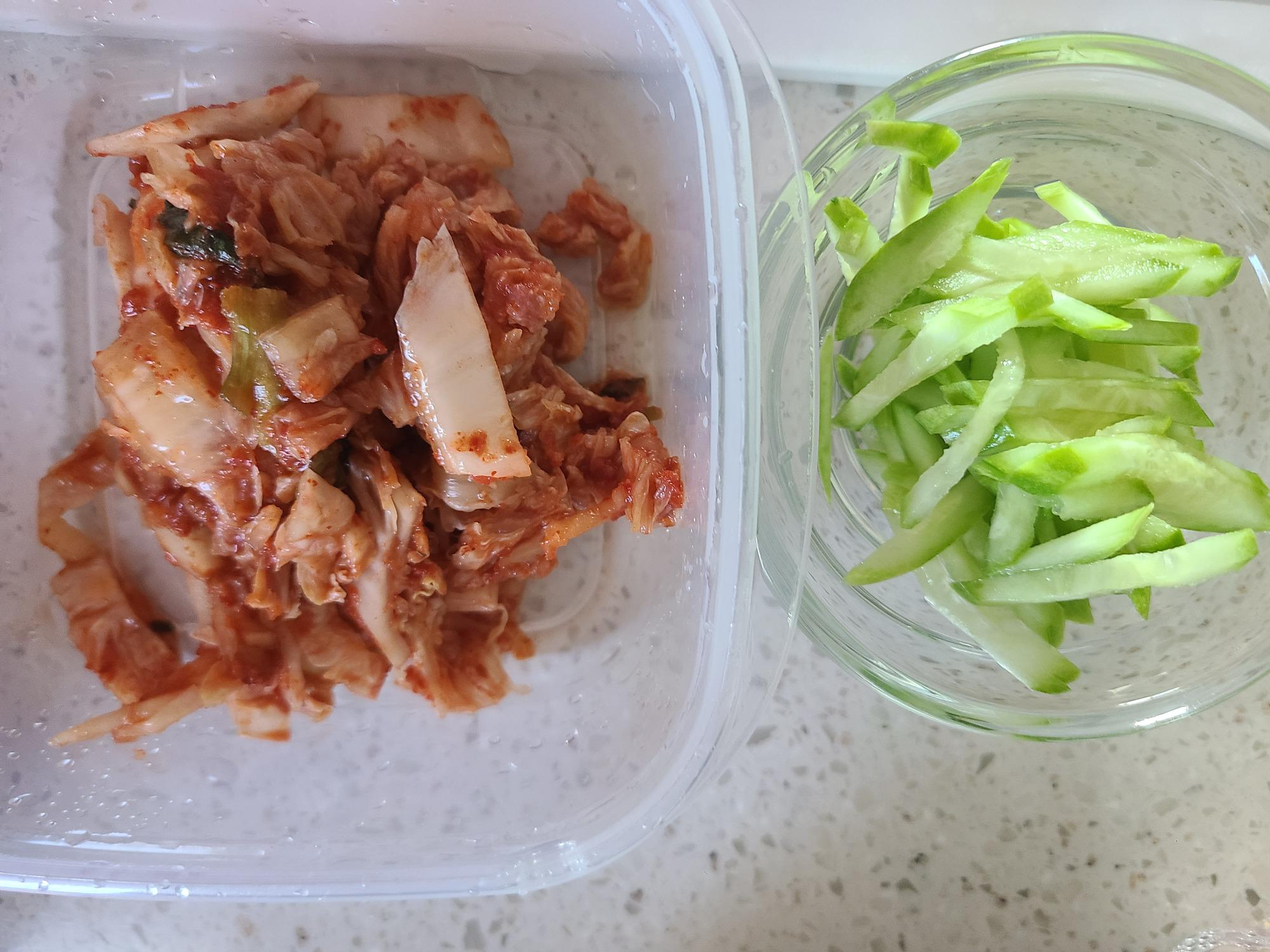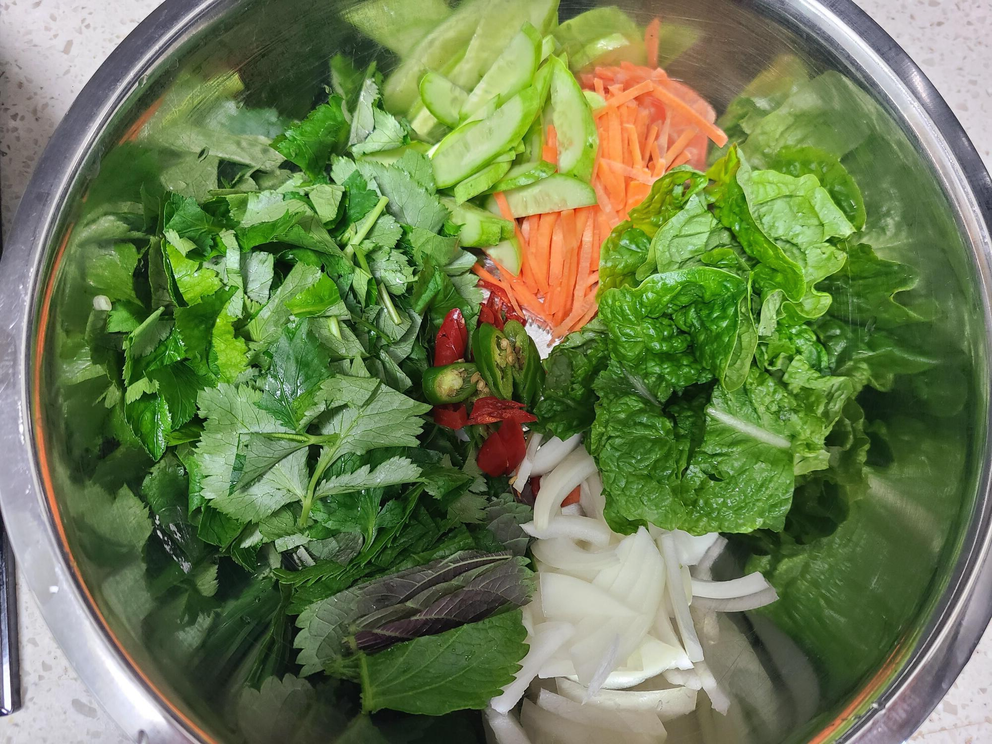 2. 집에 있던 야채를 총동원했다. 참나물, 상추, 깻잎, 오이, 당근, 양파, 풋고추까지 먹기 좋은 크기로 썰어 그릇에 담았다.