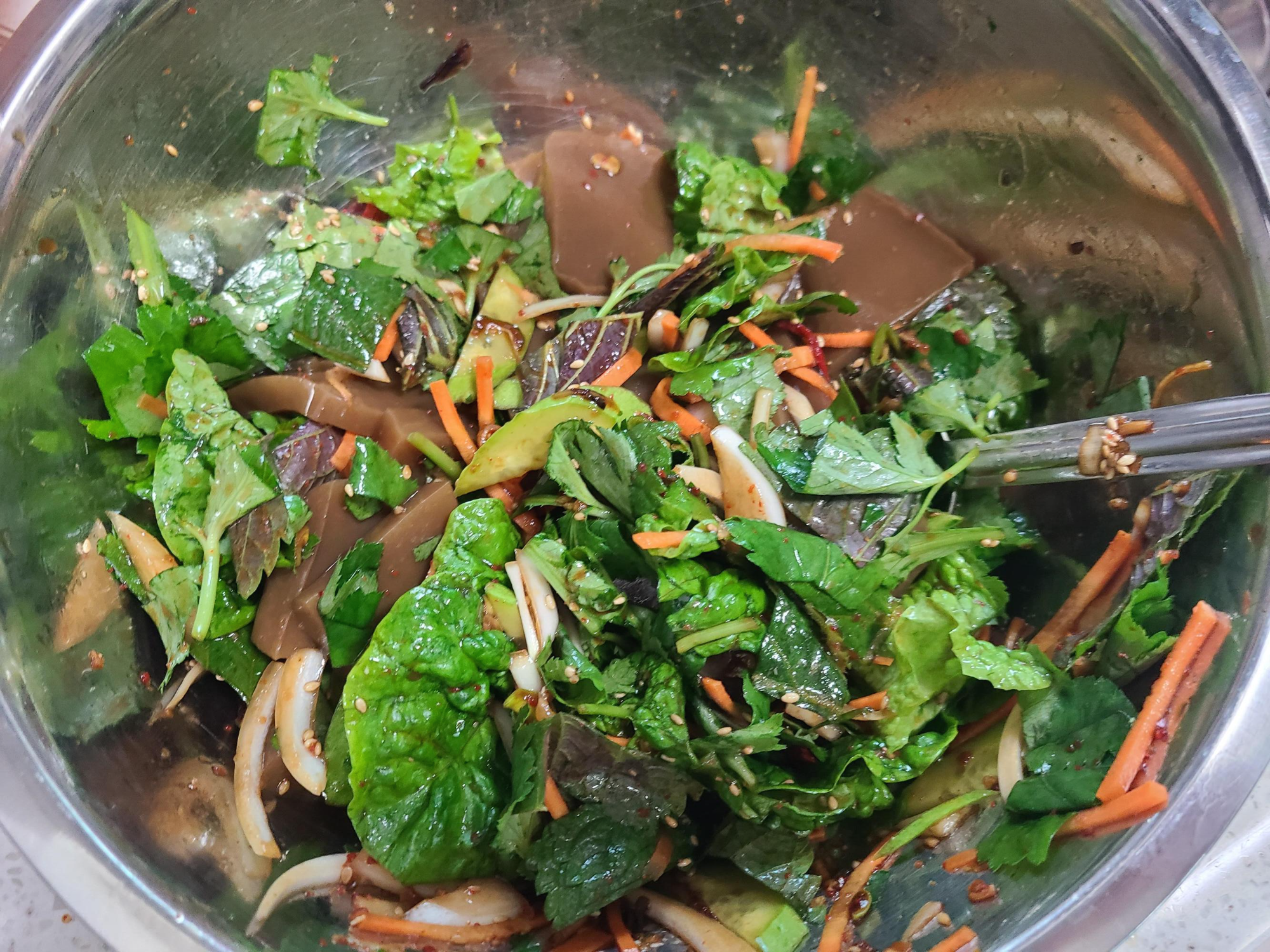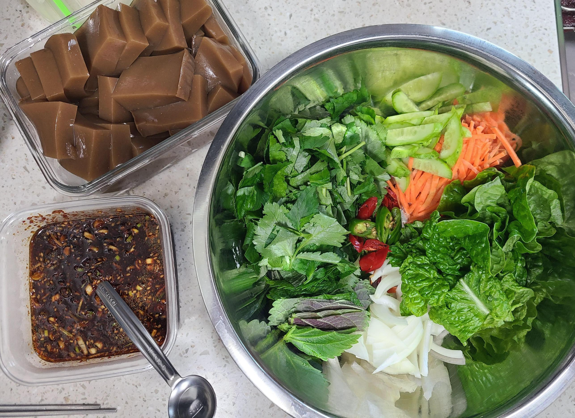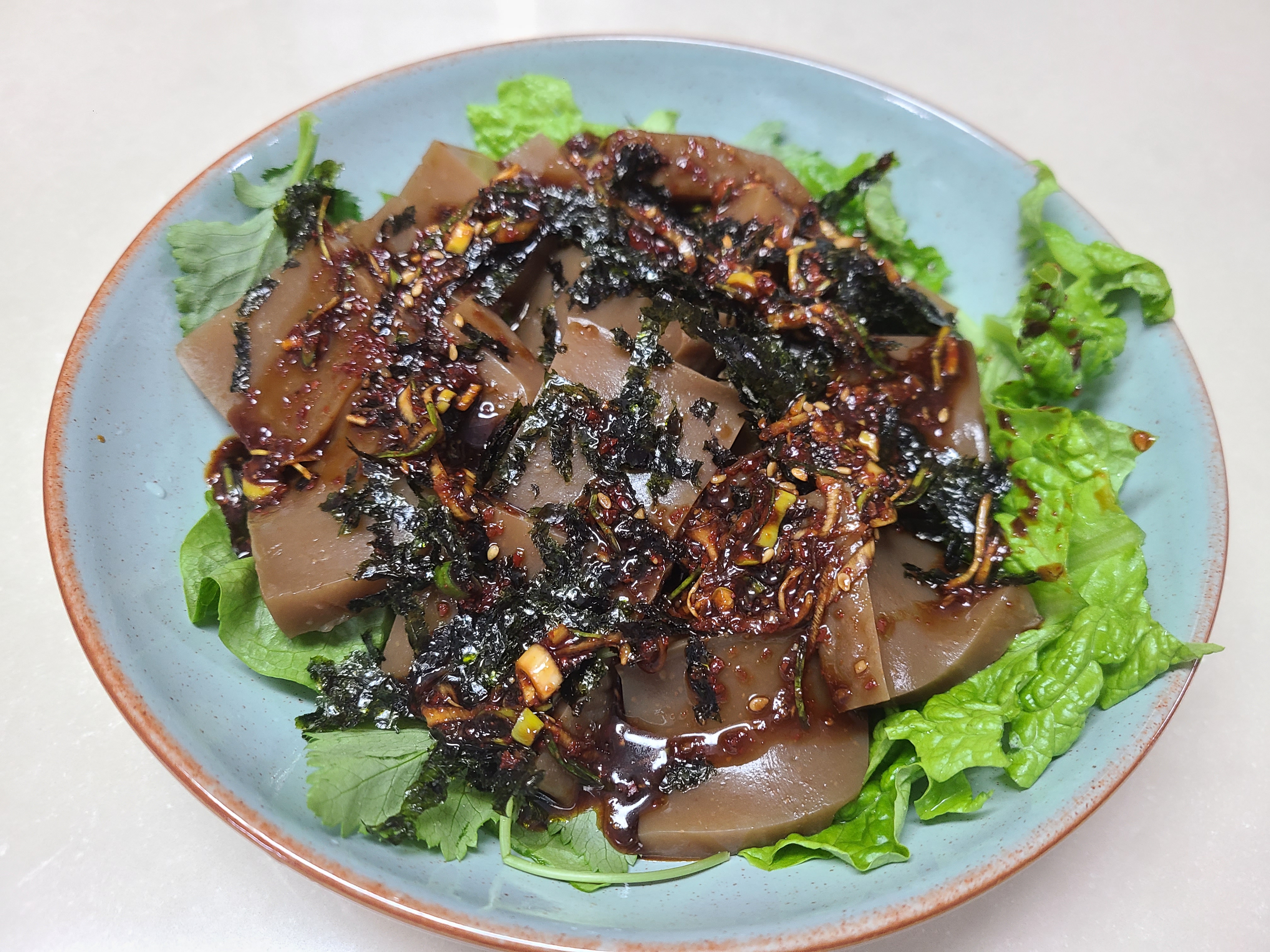 이번에는 접시에 야채를 깔고 썰은 묵을 얹어준 후 김가루와 양념장을 얹어 주었다.